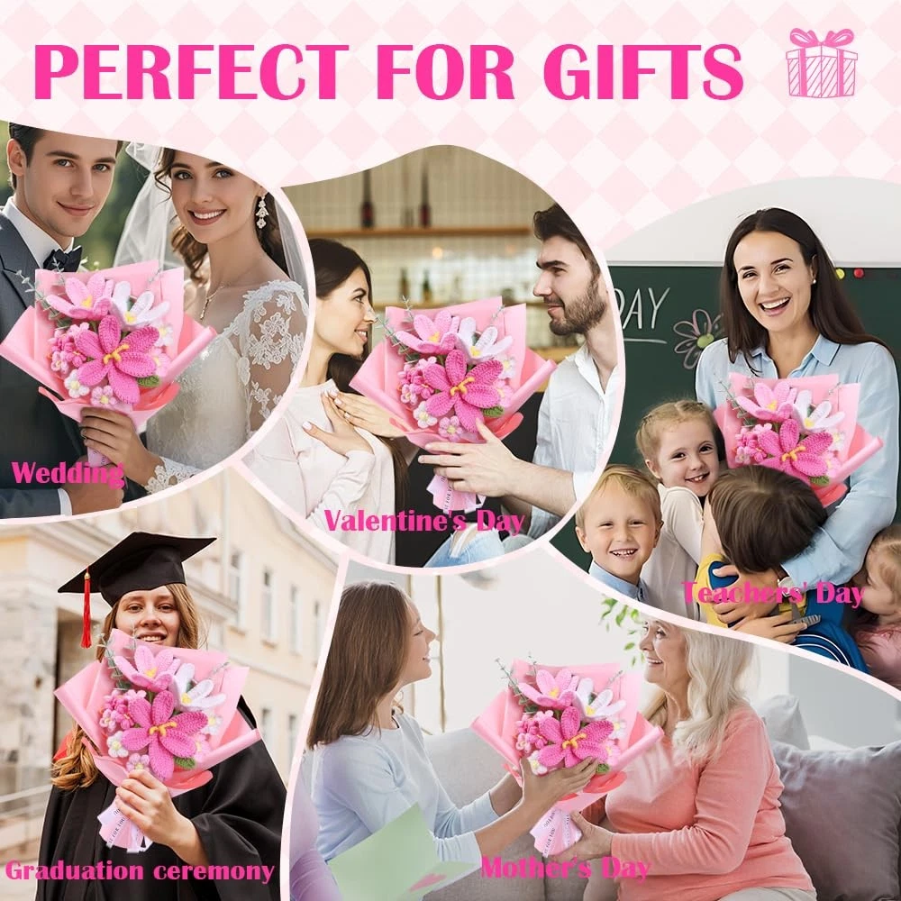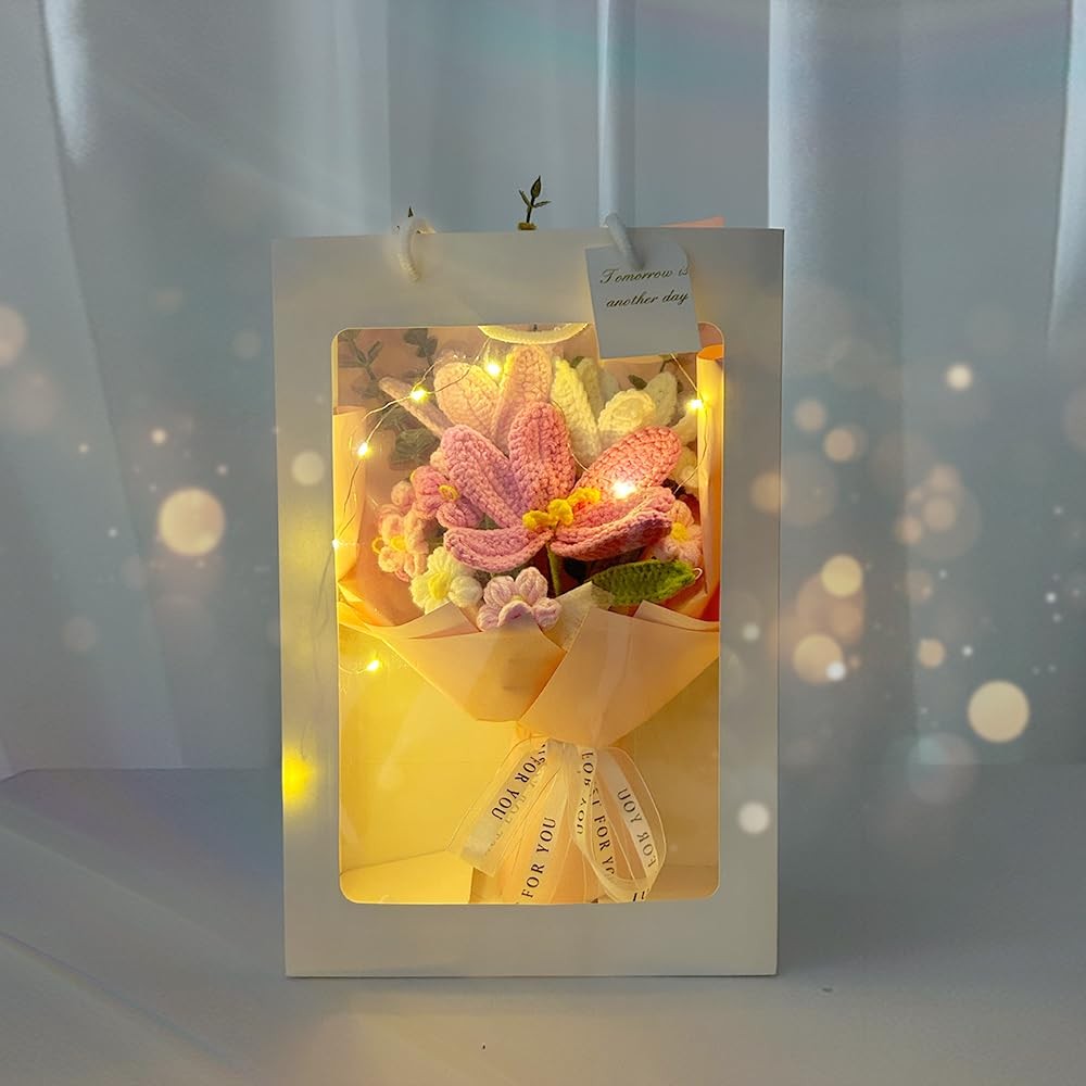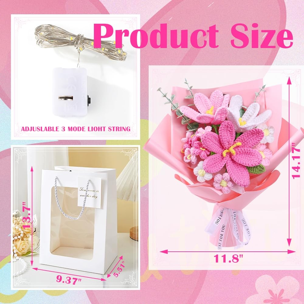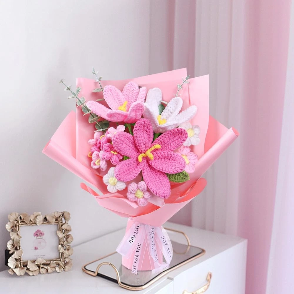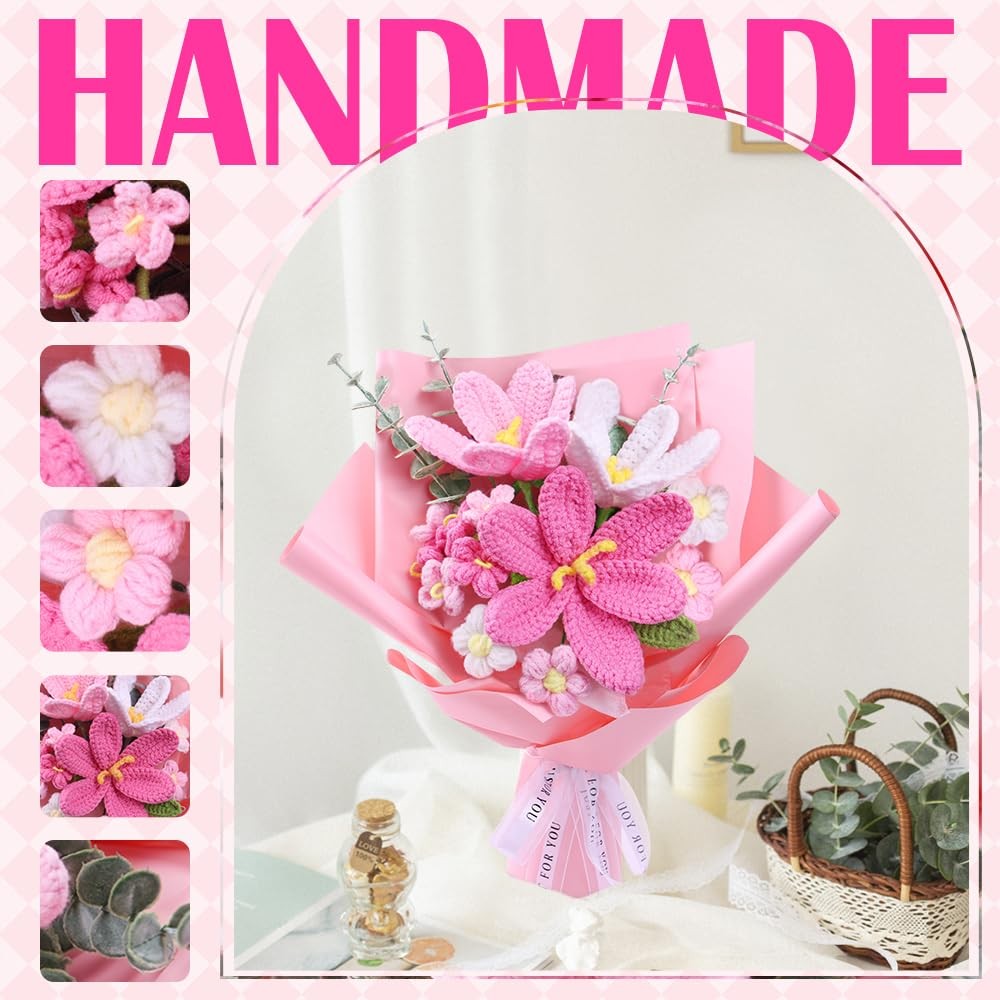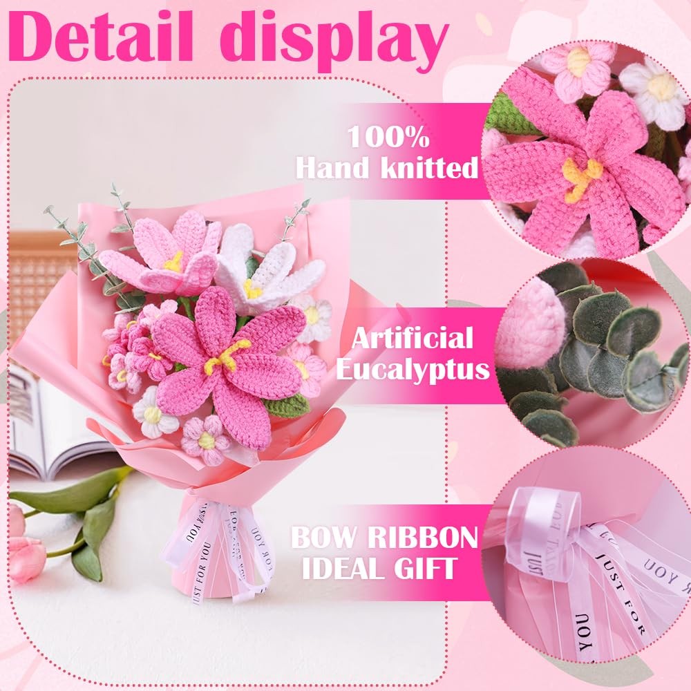Crochet Flower Complered Crochet Flower Bouquet: This woven bouquet includes three tulips of different colors, four cream puffs, five forget-me-nots and three artificial eucalyptus trees, looking exquisite and elegant. Crafted by professional artisans with meticulous weaving, it offers a natural skin-friendly feel and long-lasting durability. Durable & Safe: The materials used ensure that the bouquet is both durable and long-lasting. Each petal and leaf is carefully sewn to imitate real flowers, making it suitable for those who are allergic to flowers. Convey Emotions: Roses symbolize elegant, gentle and romantic blessings; Put them in gift bags as presents for relatives and friends. It is suitable as a gift for lovers, friends and teachers on festivals such as Mother's Day, Valentine's Day, Teachers' Day and wedding anniversaries. Write the most sincere blessings on the greeting card to express love and warmth. Ideal Decoration: Artificial knitted bouquets are suitable for bridal bouquets, dining tables, wedding centers, homes, outdoors, indoors, gardens, weddings, party decorations, vases, bedrooms, living rooms, restaurants, kitchens, gardens and parties. They can be perfectly matched with other flowers to create amazing bouquets for various occasions. They can be used as decorations for festivals. Thoughtful Care Guide: Our bouquets are not only beautiful and long-lasting, but also easy to care for: In daily life, just gently sweep with a soft-bristled brush or use the cold setting of a hair dryer to gently remove dust. The washable design allows for hand washing, and after laying them flat to dry in the shade, they will look as good as new.