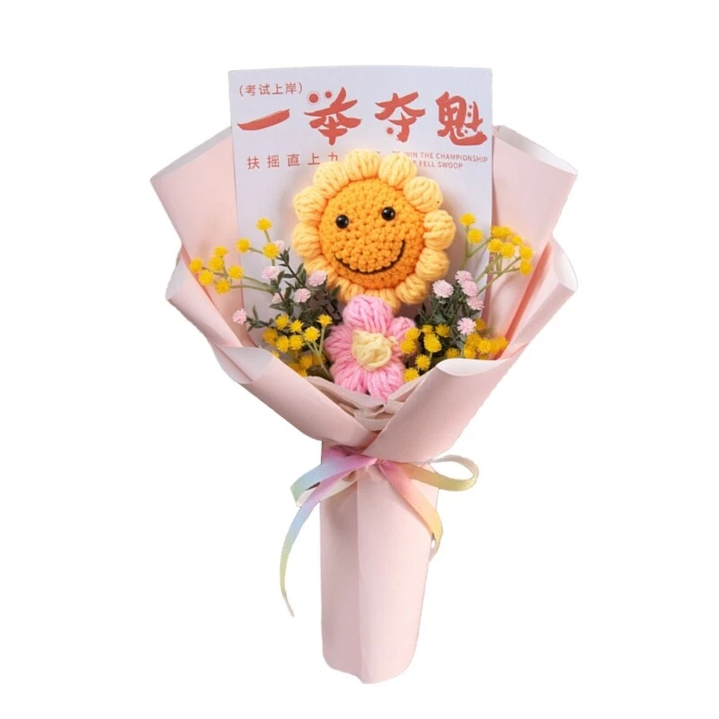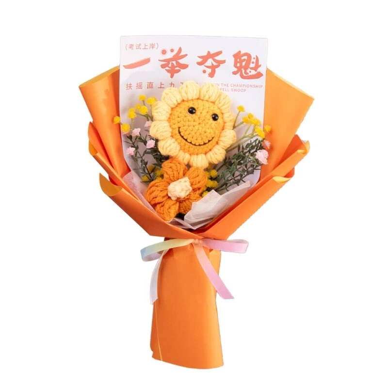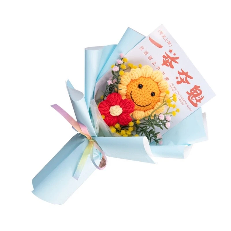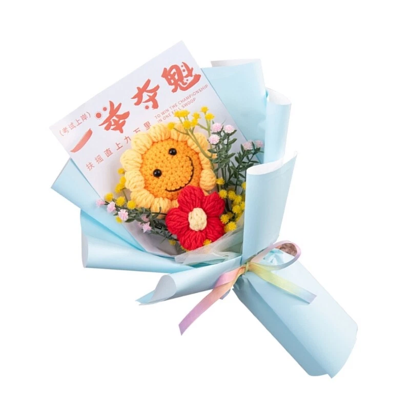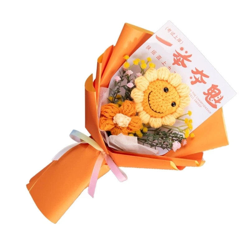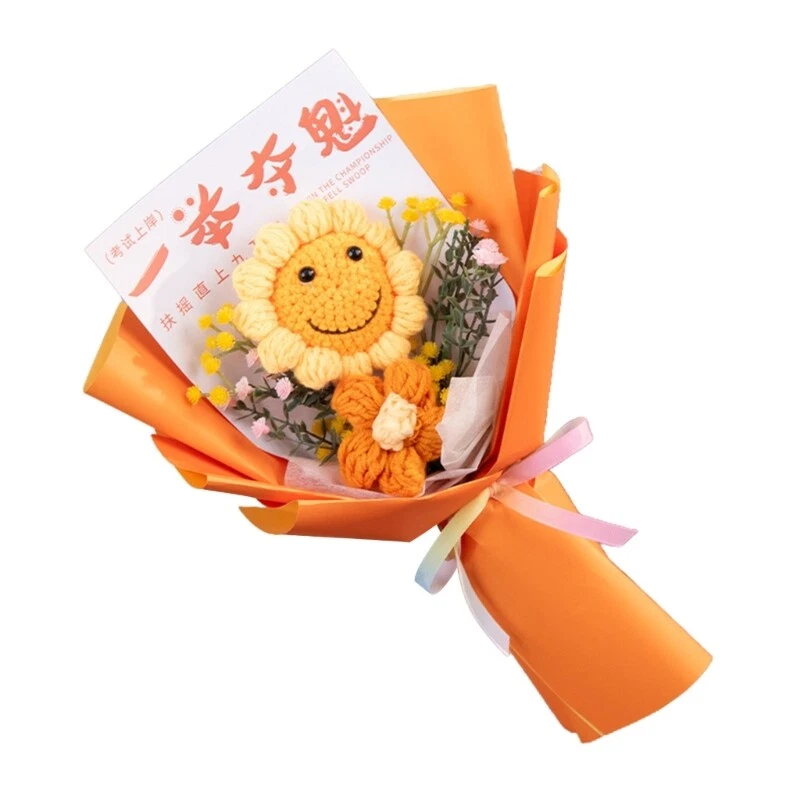 Features: Our handmade knitted flowers bouquets include crochet flowers, artificial leaf, small toy, LED string light and clear gift bag. These crochet flowers bouquets knitted by hands, suitable for decorating kitchen, bedroom, dining table, office, wedding parties, Craft with quality yarns. safe to people who suffering allergic to flowers.Suitable for graduation gift, birthday gift, Realistic flowers and leaf, would not fall and fade. Do not need water. Widely used for graduation ceremony, wedding, table decorations, home decorations. Gift for student, teacher, friend and child on graduation ceremony, birthdays, Mother Day, Valentines Day, Christmas and other festival. Specifications: Yarns Color: Blue; Purpler; Orange; Type: Set01; Set02; Set03; Set04; Set05 Bouquets Size: Approximately. 52x24cm/20.47x9.44in Weight: Approximately. 66g Package Includes: 1Piece Crochet Flowers Bouquets 1Piece LED String Light 1Piece Clear Gift Bag note: 1.Please allow 0-1cm error due to manual measurement. make sure you donot mind before bid. 2.Due to difference between different monitors, the picture may not reflect the actual color