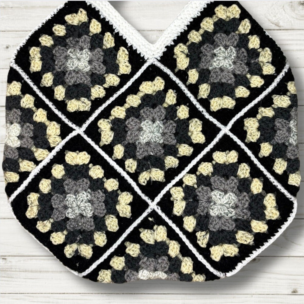 Introducing our Granny Square Tote Bag in a stunning gradient of grays with a crisp white border! This large, versatile bag is perfect for everyday use. Complete with a fashionable faux leather tag, this unique piece will add a touch of style to any outfit. Handmade with love, it's a must-have accessory for any fashion-forward individual. Dimensions: 16x16 inches