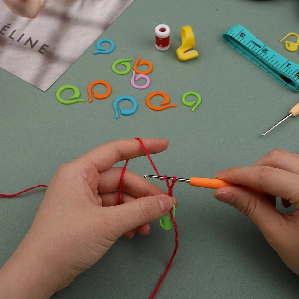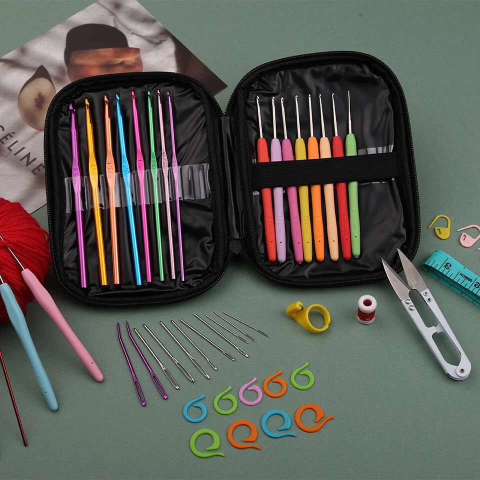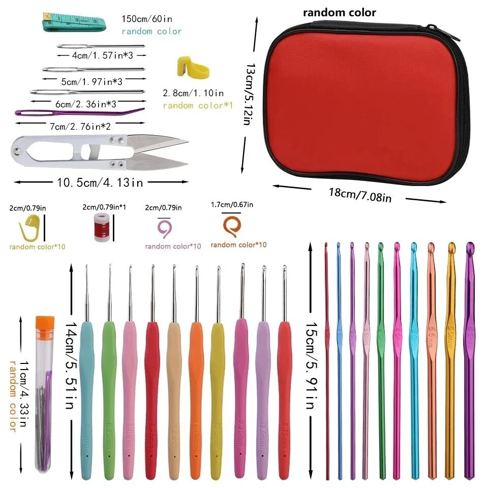 KRABALL Crochet Hooks Set DIY Crochet Hooks Needles Stitches Knitting Craft Scissors Markers Weaving Sewing Tools Packaging List 1 x storage bag 2 x large eye elbow needle purple 1 x ring knife - random colors 10 x crochet needles 1 x row counter 20 x open counting circle ring 10 x aluminum crochet (random color and size) 10 x sticking marks 1 x tape measure 1 x yarn scissors 9 x blunt nose large eye needle 1 x tube Feature 1.Handles crochet hooks, smooth surface, Lightweight and durable. 2.Combination of knitting needles set and knitting stitch markers, great for marking the beginning and ending of pattern stitches, as well as where to increase or decrease the number of stitches. Make your hand knitting crochet life more enjoyable! Note 1 .Because the parts are small, they cannot be used as toys for babies and children. Therefore, they should be kept out of reach of children. 2.The actual color of the item may be slightly different from the color shown on the picture due to different display and lighting effects. Thank you for your understanding! 3. Due to manual measurement, please allow 1-3mm measurement deviation.