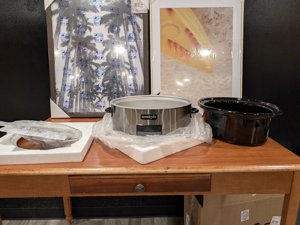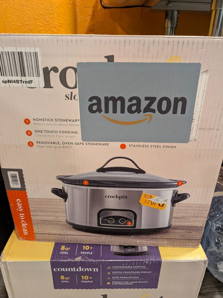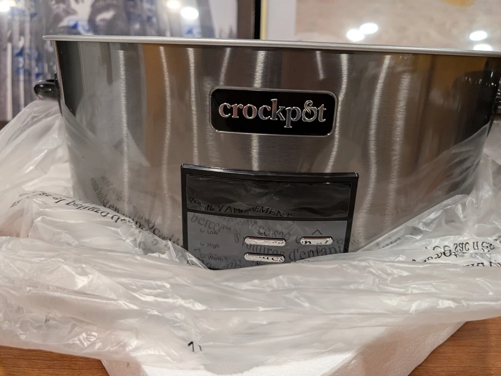 The Crock-Pot Large 8-Quart Programmable Slow Cooker in Black stainless is an electric oval-shaped slow cooker with a maximum timer setting of 20 hours. It features a programmable hand control, LCD display, digital timer, keep warm function, and stay-cool handles. The stainless steel cooker includes a pot, lid, and base, with dishwasher-safe components. It operates at 1500 watts with 110 volts and has three settings/programs for versatile cooking options.