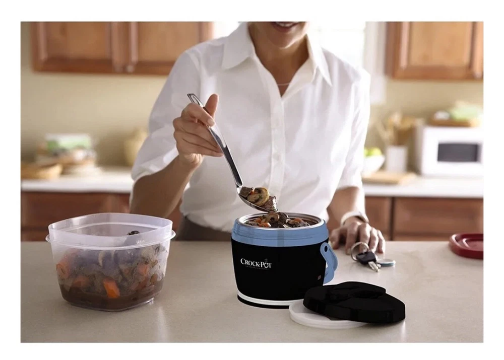 The Crock-Pot® Lunch Crock® Food Warmer is a lunch tote and food warmer in one that warms while you work for delicious on-the-go meals that are ready when and wherever you are. Heats leftovers, soups, oatmeal and any number of favorites into amazing meals away from home. Superior portability features including an outer lid, cool-touch exterior, easy-carry handle and cord storage. 20-ounce capacity is perfect for a personal, portion-sized meal. Container is removable for filling and transporting, eliminating the need to travel with the entire unit. Features: 20-ounce capacity Tote-like handle for easy carrying Travel lid seals food during transport Removable, dishwasher-safe food container and lid Sleek, black exterior with sky blue lid and handle