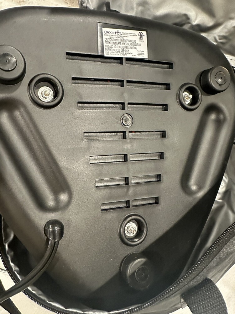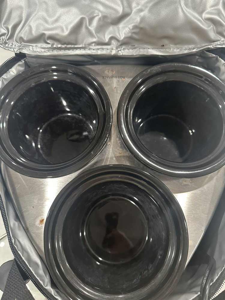 Tested and works great. The Crock-Pot Trio Slow Cooker is an electric slow cooker with a capacity of 48 oz. It comes with three 16 oz bowls, lids, and an insulated carry bag. The slow cooker has two settings/programs and a power of 90 W. The components included are the base, crocks, lids, and an insulated carry bag. The slow cooker is made of stainless steel with a brushed finish and has a voltage of 120 V. It is adjustable, easy to clean, and dishwasher safe. The cable length is 28.5 in, and it weighs 5 lbs 6.6 oz. The item depth is 10.5 in, item height is 5 7/8 in, and item width is 10.5 in.