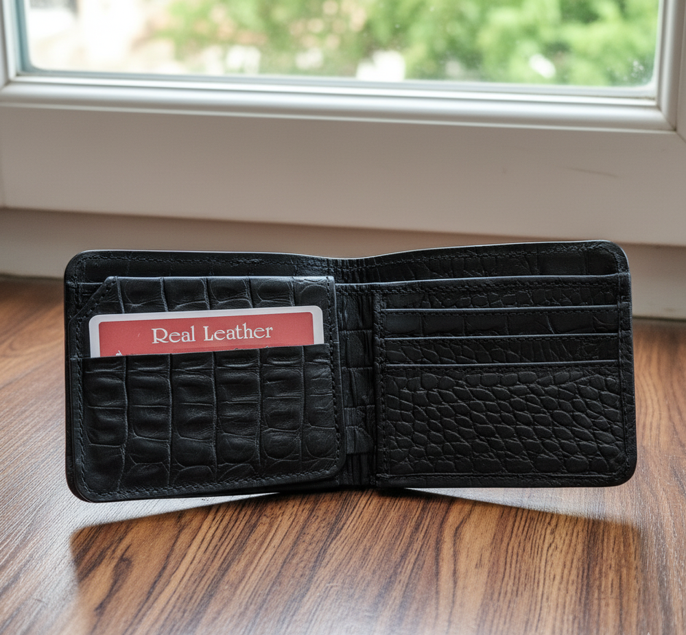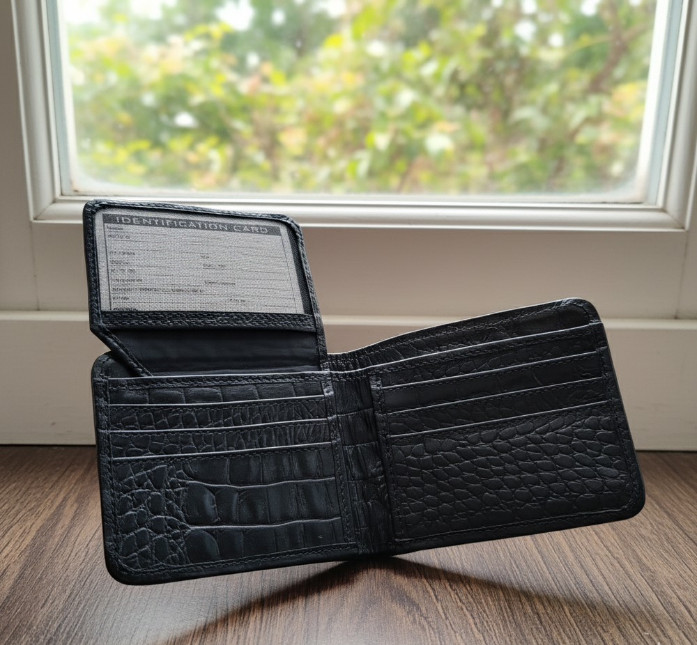 wallet crocodile bifold pattern leather black skin genuine men's real handmade men card credit Features: - Premium Crocodile Leather: Made from high-quality, 100% genuine leather. - Handmade Stitching: Crafted with meticulous attention to detail and handmade stitching. With red edges to enhance beauty of wallet. - Multiple Card Slots: Ample storage for credit cards, IDs, and more. - 2 Cash Compartments: Spacious sections for cash and receipts. - Durable Construction: Built to last with durable materials and craftsmanship. - Ideal Gift: Perfect for special occasions, such as birthdays or holidays.