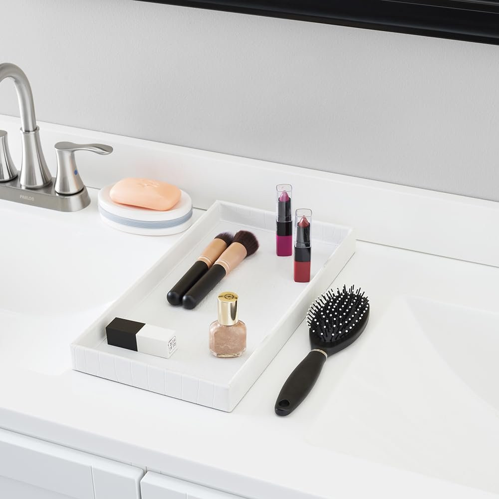 Home Basics Crocodile Plastic Vanity Tray For Jewelry, Make up, Perfume, Cosmetics, Bathroom or Dresser Organizer, (White) SAVES COUNTER SPACE: Tired of cluttering your sink space with random perfume bottles, jewelry, and makeup? This bathroom vanity tray helps you neatly store your beauty essentials without taking up much room on your counter. STURDY AND DURABLE: Made from sturdy plastic, this decorative bathroom tray features tall side walls to prevent items from falling off while carrying. DOUBLES AS A SERVING TRAY: Not just for the bathroom, this versatile tray can also be used as a serving tray for passing around small appetizers and desserts at your next party. FAUX CROCODILE DESIGN: This vanity tray boasts a chic and stylish embossed faux crocodile design, adding a touch of luxury to your home. MULTI-PURPOSE USE: Perfect for organizing cosmetics, jewelry, and toiletries on your dresser or vanity, while also ideal for serving snacks and drinks during gatherings.