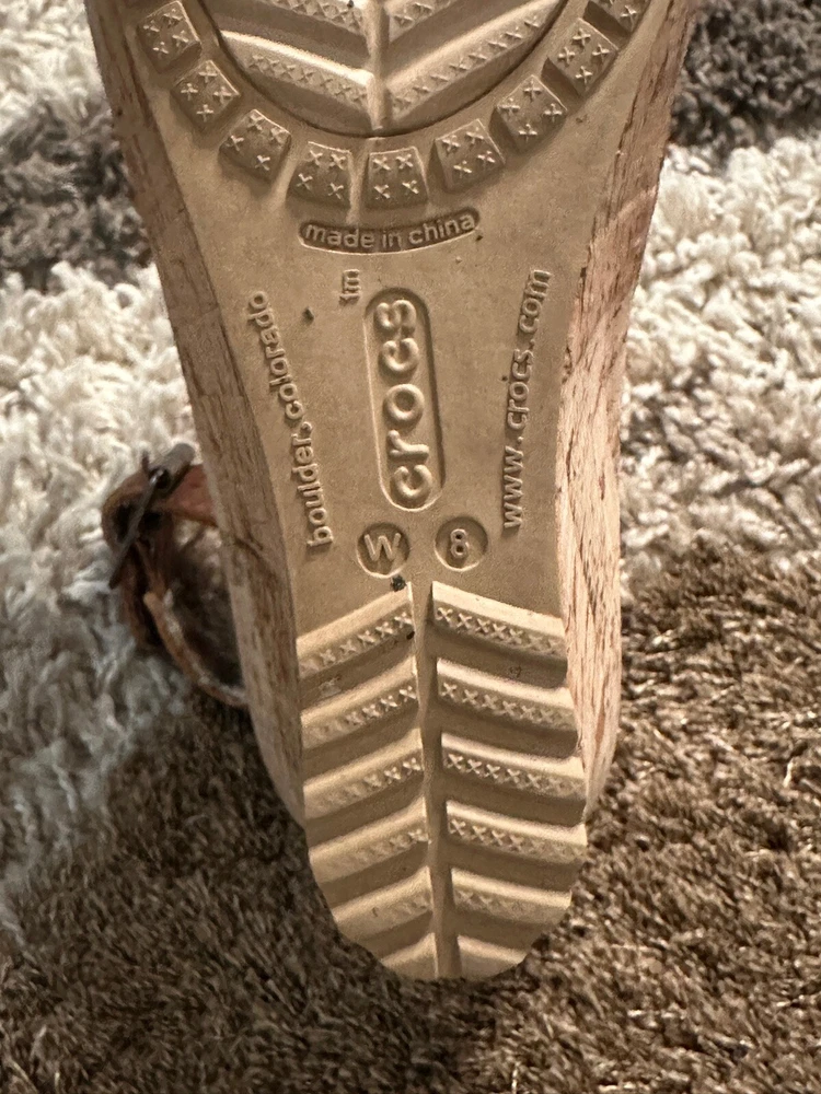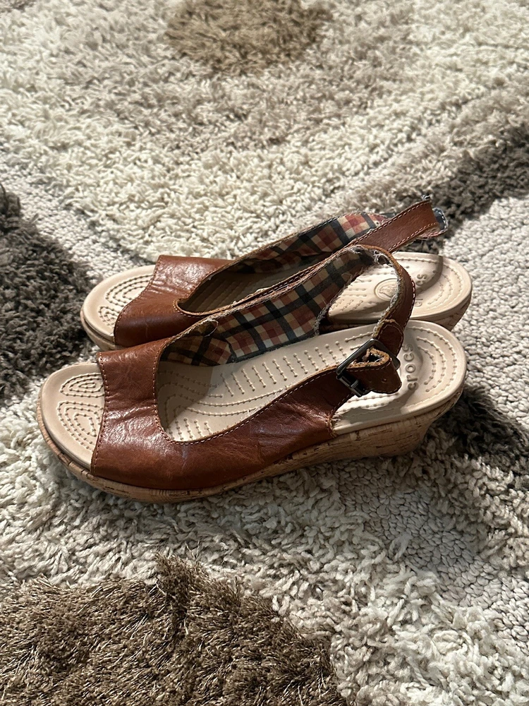 Elevate your style with these beautiful brick red Crocs A-Leigh slingback sandals. The adjustable strap and buckle closure provide a comfortable and secure fit, while the cushioned insole and cork outsole offer a comfortable and stable ride. These sandals are perfect for any casual occasion and will surely become a staple in your wardrobe. The upper material is made of high-quality leather and the lining material is also leather. The wedge heel style adds an extra boost of confidence to your look and the platform height is .75 inches. The shoe width is standard and the product line is Crocs A-Leigh.