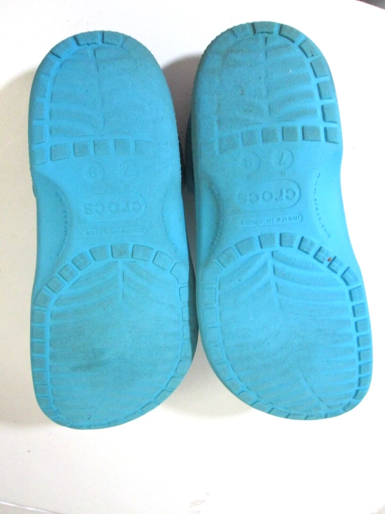Introducing these stylish Crocs Aqua Clogs, perfect for any casual occasion. These slip-on clogs feature a solid pattern, round toe shape, and a flat heel style. The upper material is made of durable rubber with a synthetic lining material and insole material. The outsole material is also rubber, providing a comfortable and breathable experience for the feet. These clogs come in a beautiful aqua color with a logo accent and are available in women's size 9 and men's size 7. They are part of the Comfort Slide product line and are perfect for summer, fall, and spring seasons. Get your hands on these stylish and comfortable Crocs Aqua Clogs today!