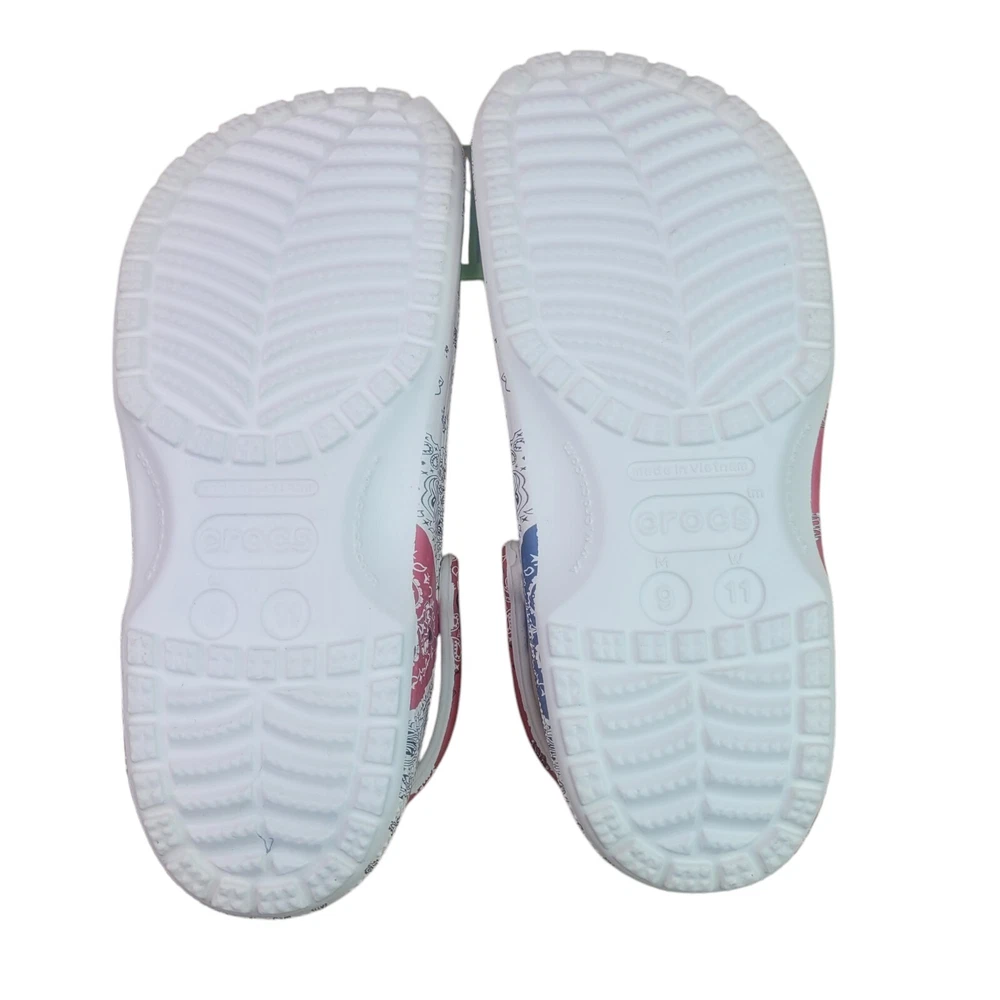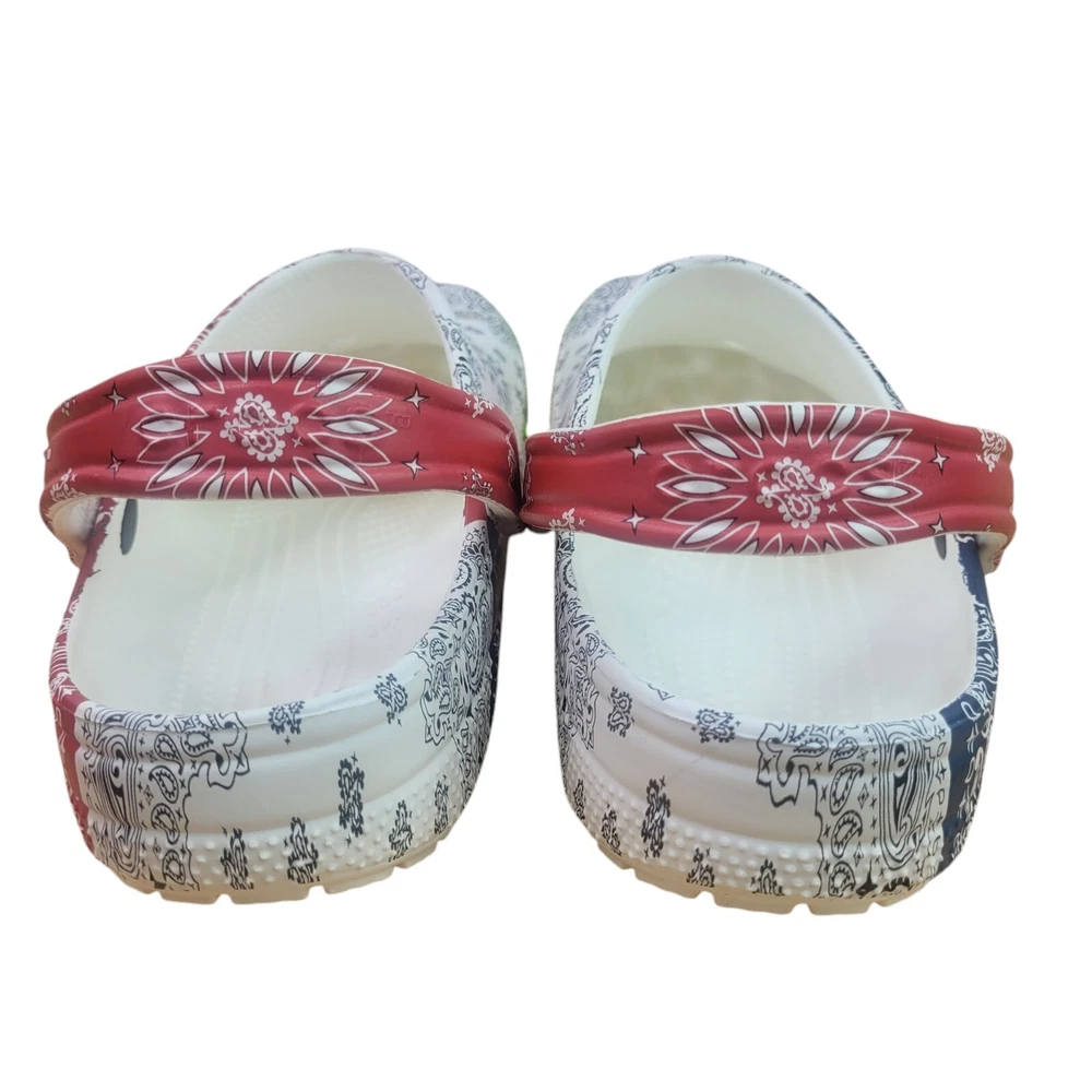 Crocs Bandana Clog Paisley Multicolor Men's Slip On Sandals US M9/W11 The Crocs Classic Bandana slide sandal in paisley pattern is a stylish and comfortable slip-on option for men with a US size of 9 (women's size 11). Featuring a white color with a classic bandana design, these sandals have a synthetic upper material and a slip-on closure for easy wear. The sandals are from the brand Crocs and are suitable for casual occasions during all seasons. Perfect for those who prefer a unique and eye-catching style in their footwear.