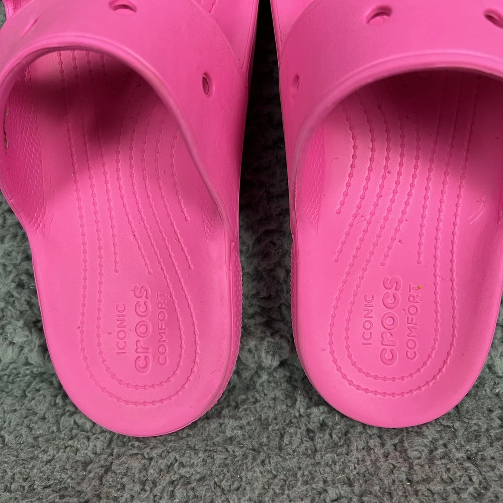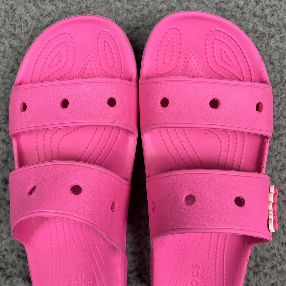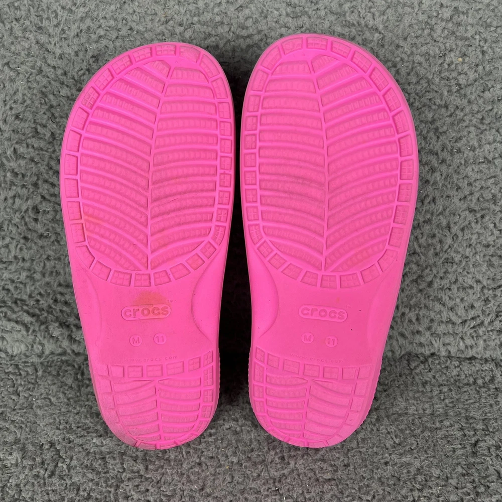 Slide into summer with these Crocs Classic 2-Strap Sandal Slides in Bright Pink. Perfect for travel, activewear, and casual occasions, these slip-on sandals feature a flat heel and a rubber outsole for comfort and durability. The synthetic upper material is waterproof, making them perfect for those unexpected rainy days. With accents of a strap and logo, these sandals have a classic theme that is perfect for any outfit. The Crocs Classic 2-Strap model is designed for women with a US shoe size of 13 and men with a size of 11. Made in Vietnam, these sandals are not handmade and are not customized. Get your hands on these stylish slides today and enjoy the summer, fall, and spring seasons in style.