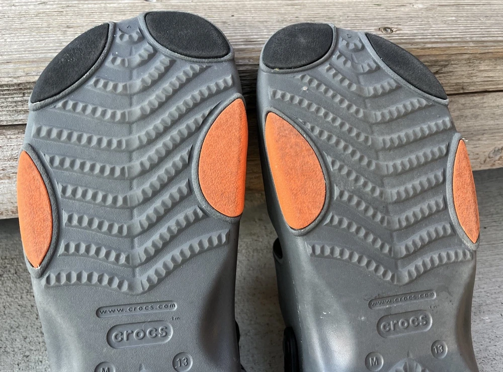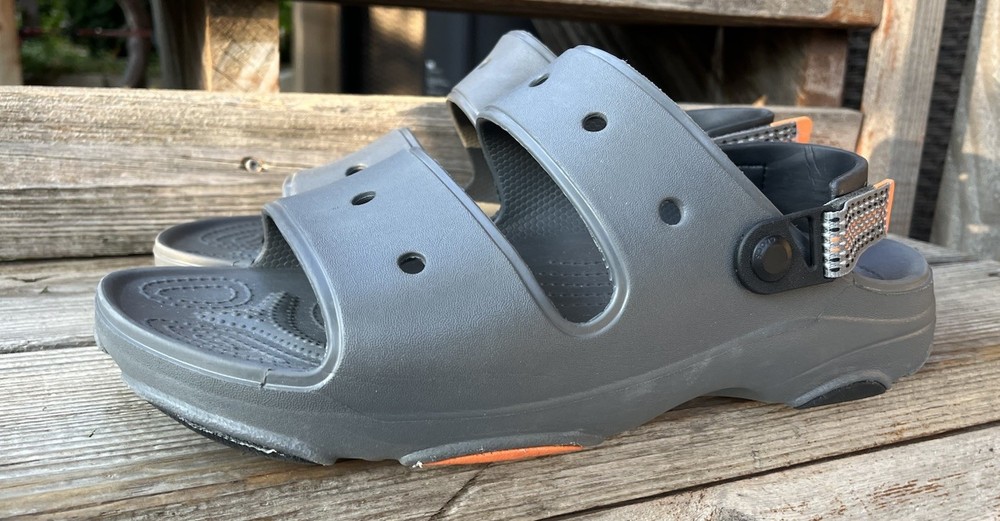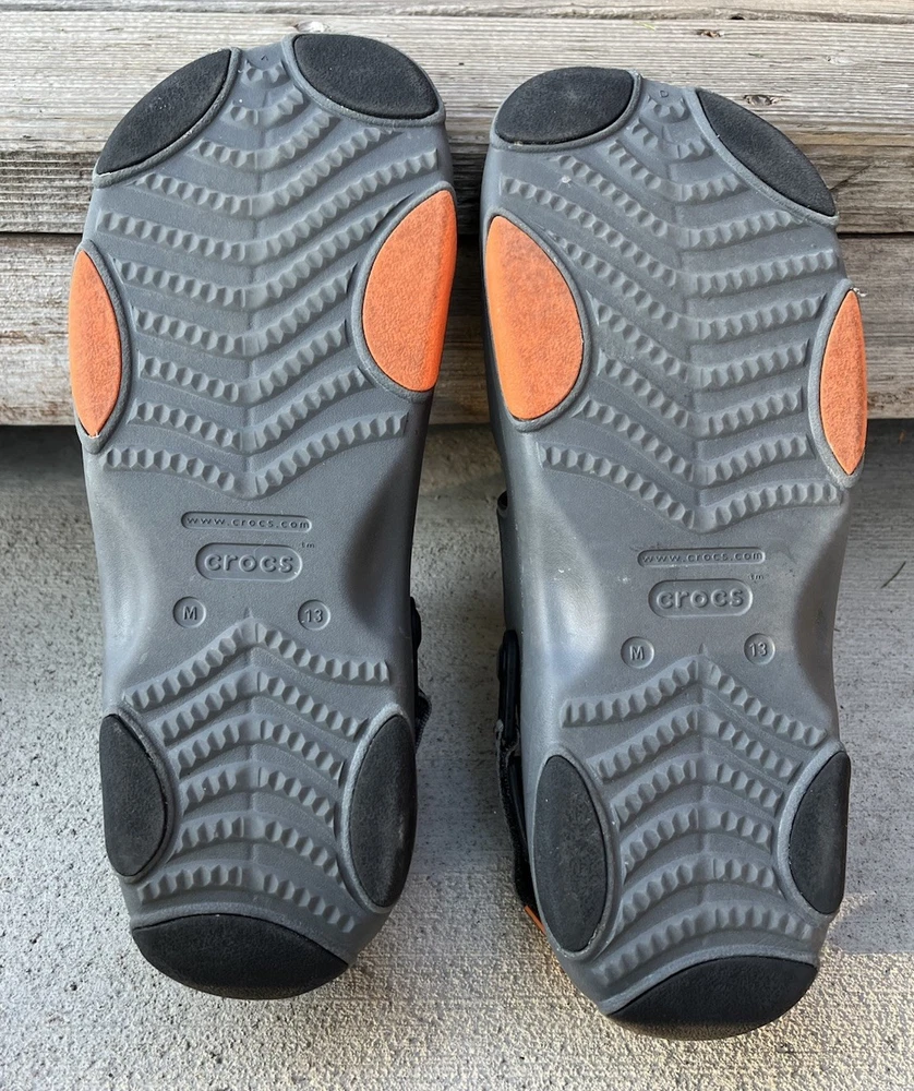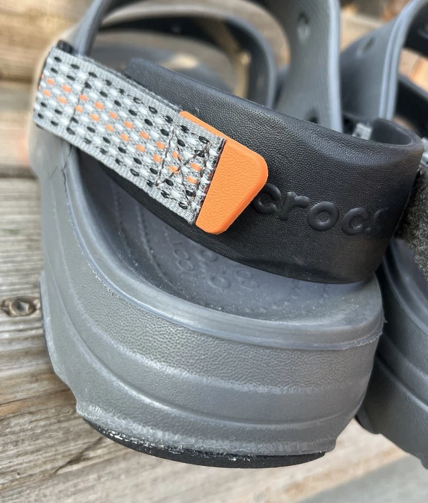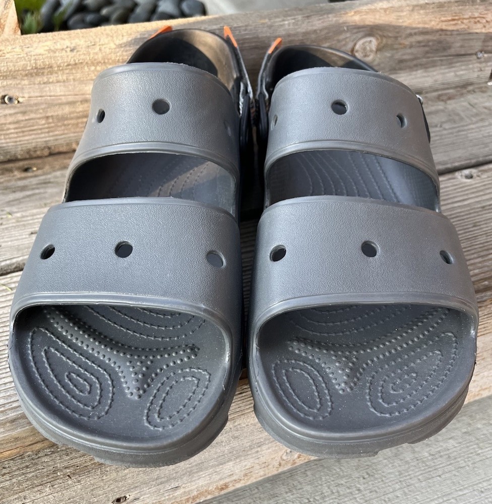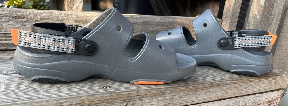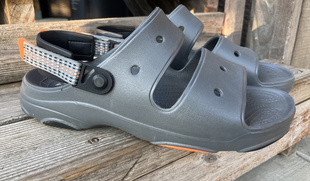 Product Line: All Terrain Sandal Style: Sandal Model: Classic All Terrain US Shoe Size: 13 gtin13: Does Not Apply Department: Men Seller Notes: “Good pre-owned condition - some normal wear on outer soles” Brand: Crocs UPC: Does Not Apply Upper Material: Croslite Color: Gray Type: Sandal