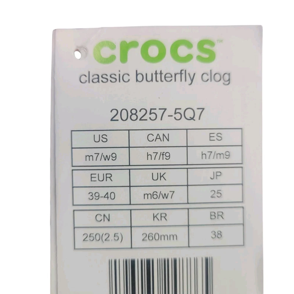 Crocs Classic Butterfly Clog Womens 9 Mens 7 Moon Jelly / Multi Color The Crocs Classic Butterfly Clog in Women's size 9 and Men's size 7 is a slip-on style shoe in the Moon Jelly/Multi color. Made with Croslite material, these clogs feature a classic design with a butterfly pattern, offering both comfort and style. Perfect for casual wear, these Crocs are a versatile choice for women looking for a fun and colorful addition to their shoe collection.