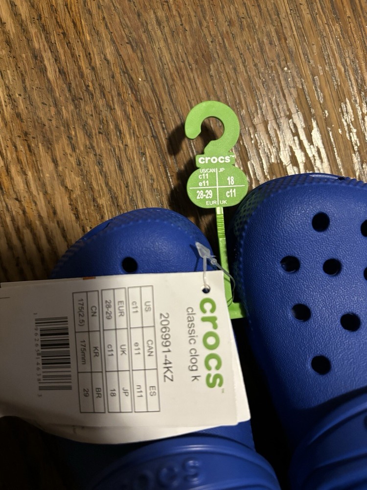 Brand: Crocs Theme: Classic Color: Blue Model: Classic Upper Material: Rubber Occasion: Casual Vintage: No Country/Region of Manufacture: China Features: Comfort Style: Clog Handmade: No Heel Height: Flat (Under 1 in) Type: Casual Department: Unisex Kids US Shoe Size: 11