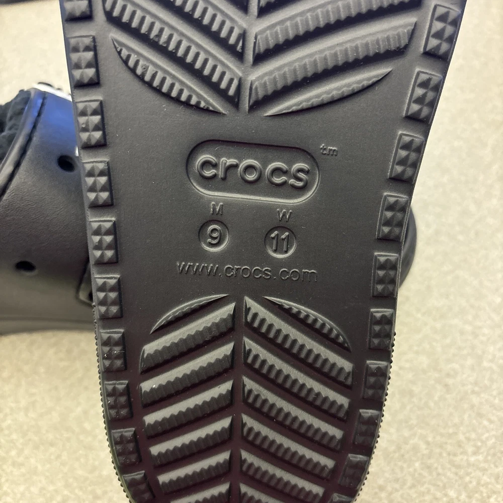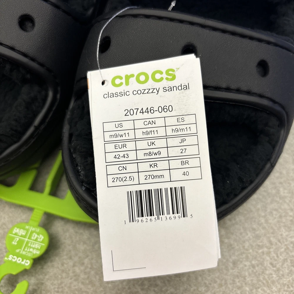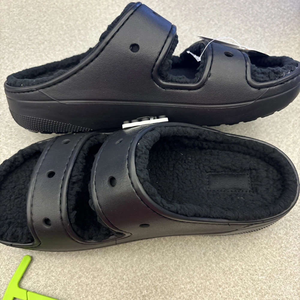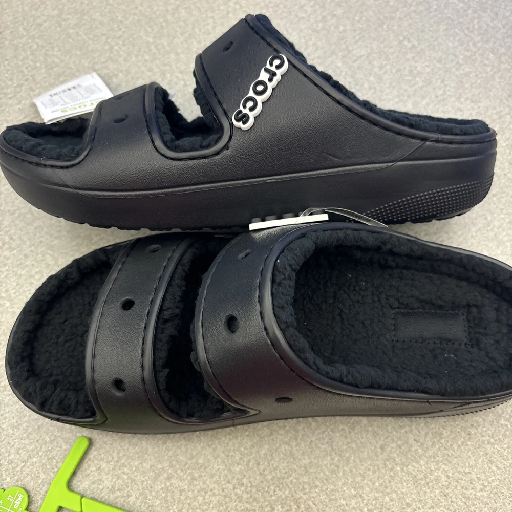 Get ready for your next adventure with these Crocs Classic Cozzzy Slip On Sandals in black. These sandals feature a solid pattern and are lined with faux fur for added comfort. The slip-on closure makes them easy to wear and take off, making them perfect for travel, activewear, and casual occasions. The low heel style and rubber outsole material provide durability and support, while the croslite upper material and synthetic insole material ensure a comfortable fit. These unisex sandals are available in women's shoe size 11 and men's shoe size 9. Don't miss out on this opportunity to add a pair of Crocs Cozzzy Sandals to your shoe collection.