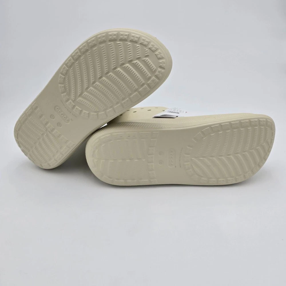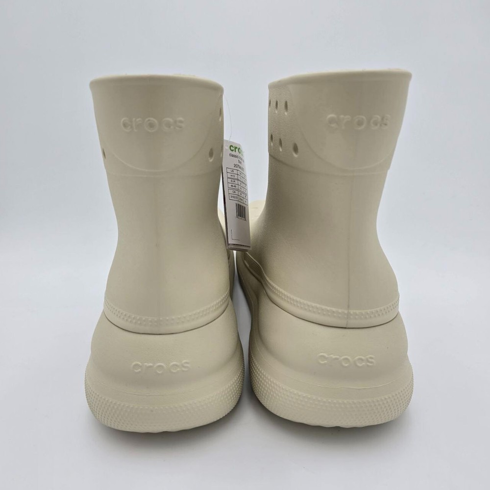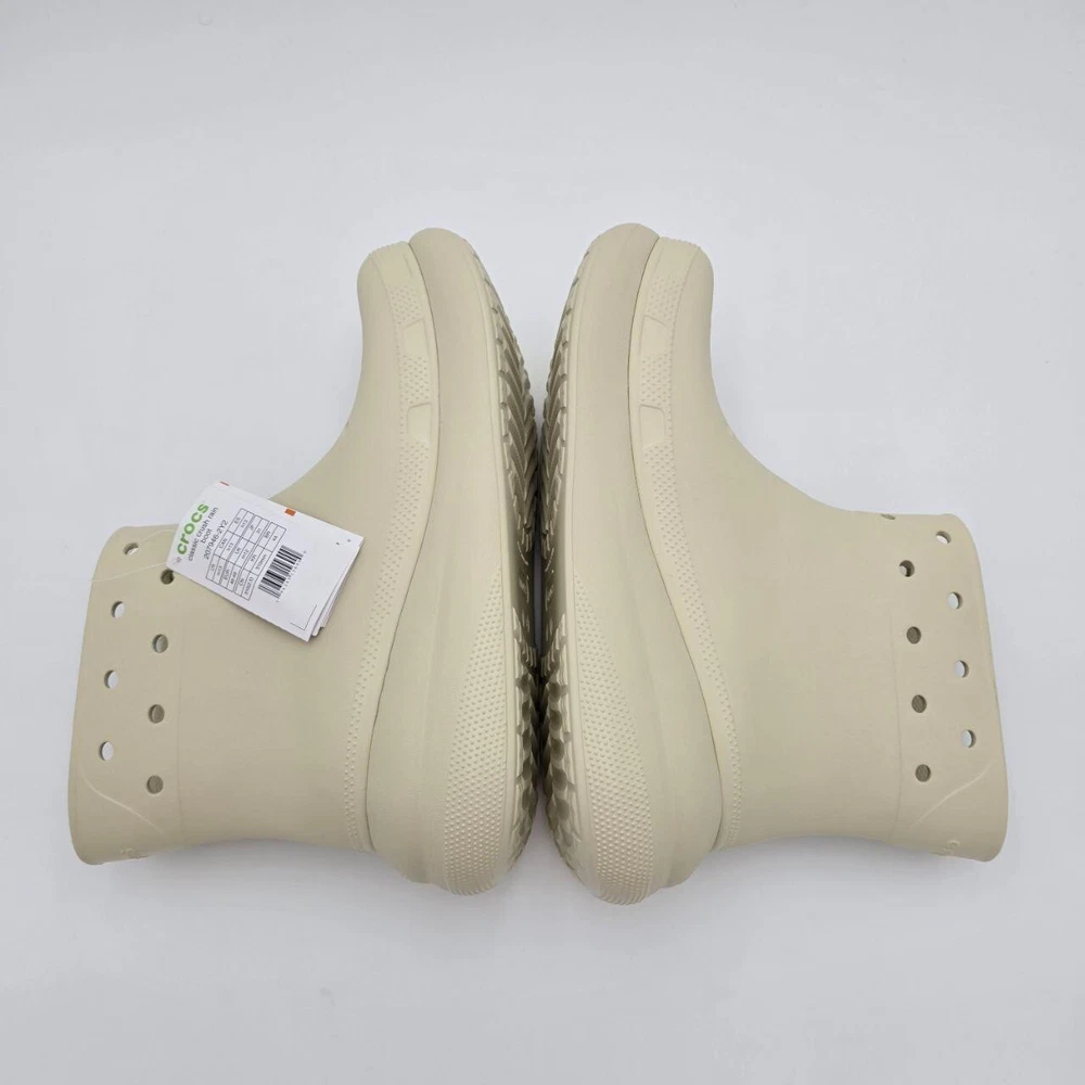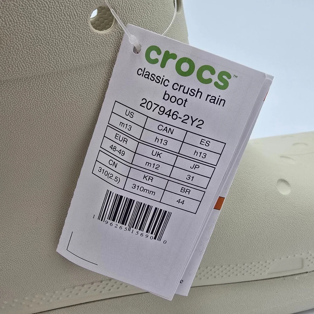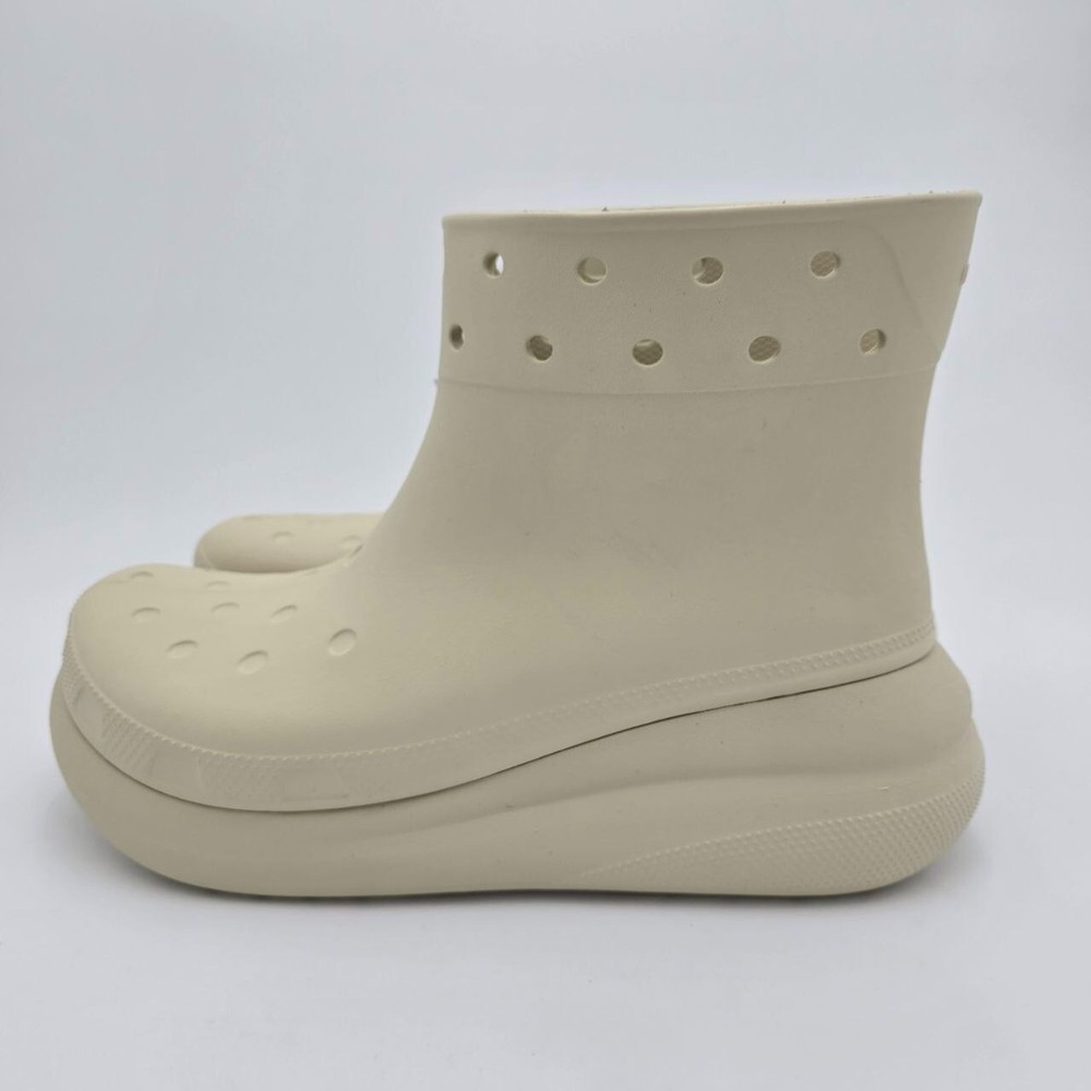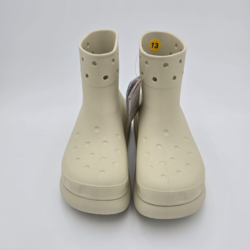 These Crocs Classic Crush Rain Ankle Boots in bone color are designed for men in size 13 with a round toe shape and pull-on closure. They are lightweight, waterproof, and slip-resistant, making them ideal for travel, activewear, casual outings, and workwear. The boots feature a cushioned insole, synthetic upper and lining, and a synthetic outsole. With a solid pattern, these ankle boots are suitable for outdoor themes like the garden or farm, providing comfort and style for various seasons.