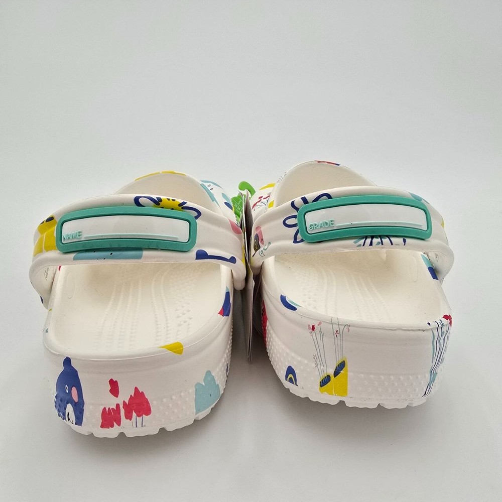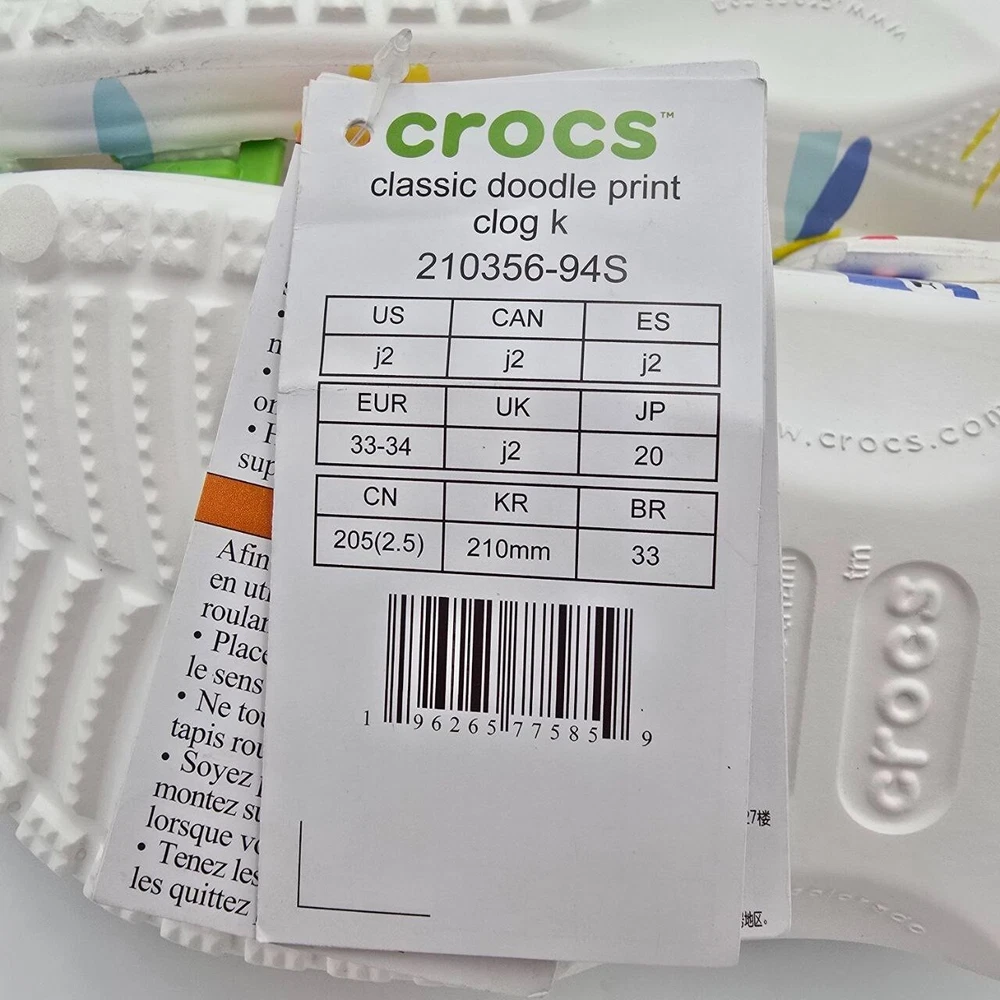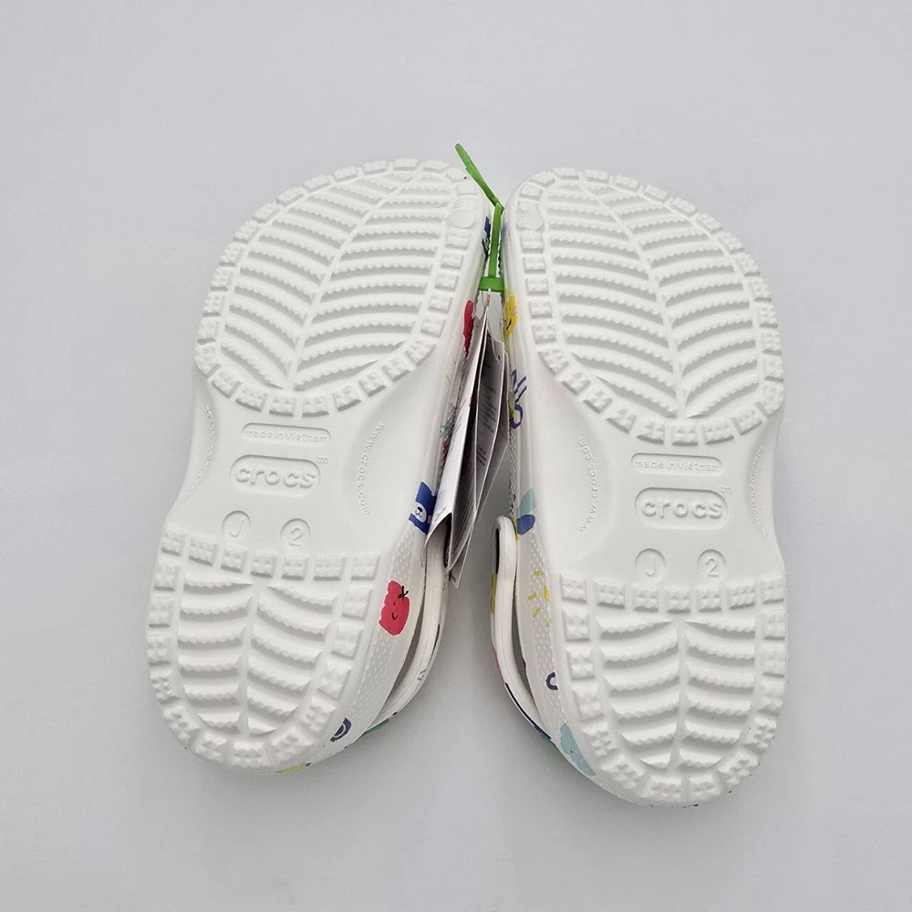 The Crocs Classic Doodle Print Clogs in Kid's Size 2 are white slip-on shoes designed for casual comfort. Featuring a round toe shape and flat heel style, these clogs are lightweight, waterproof, and cushioned for all-day wear. The colorful doodle print design adds a fun and playful touch, making them ideal for activities like walking, beach outings, or school. With a breathable synthetic upper and ankle strap for a secure fit, these Crocs are perfect for kids who enjoy expressing themselves with unique and vibrant footwear.