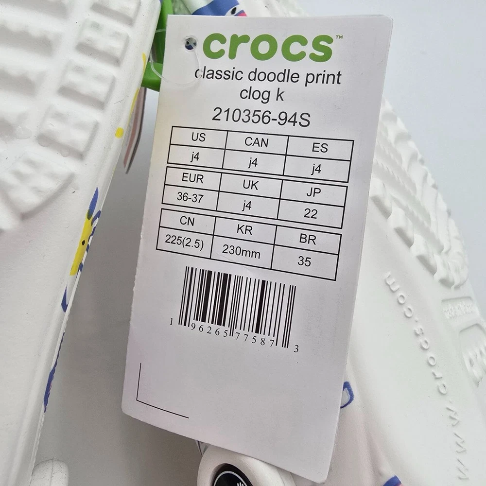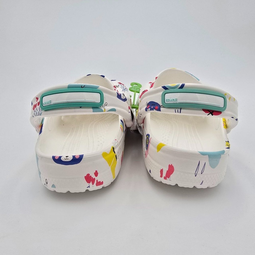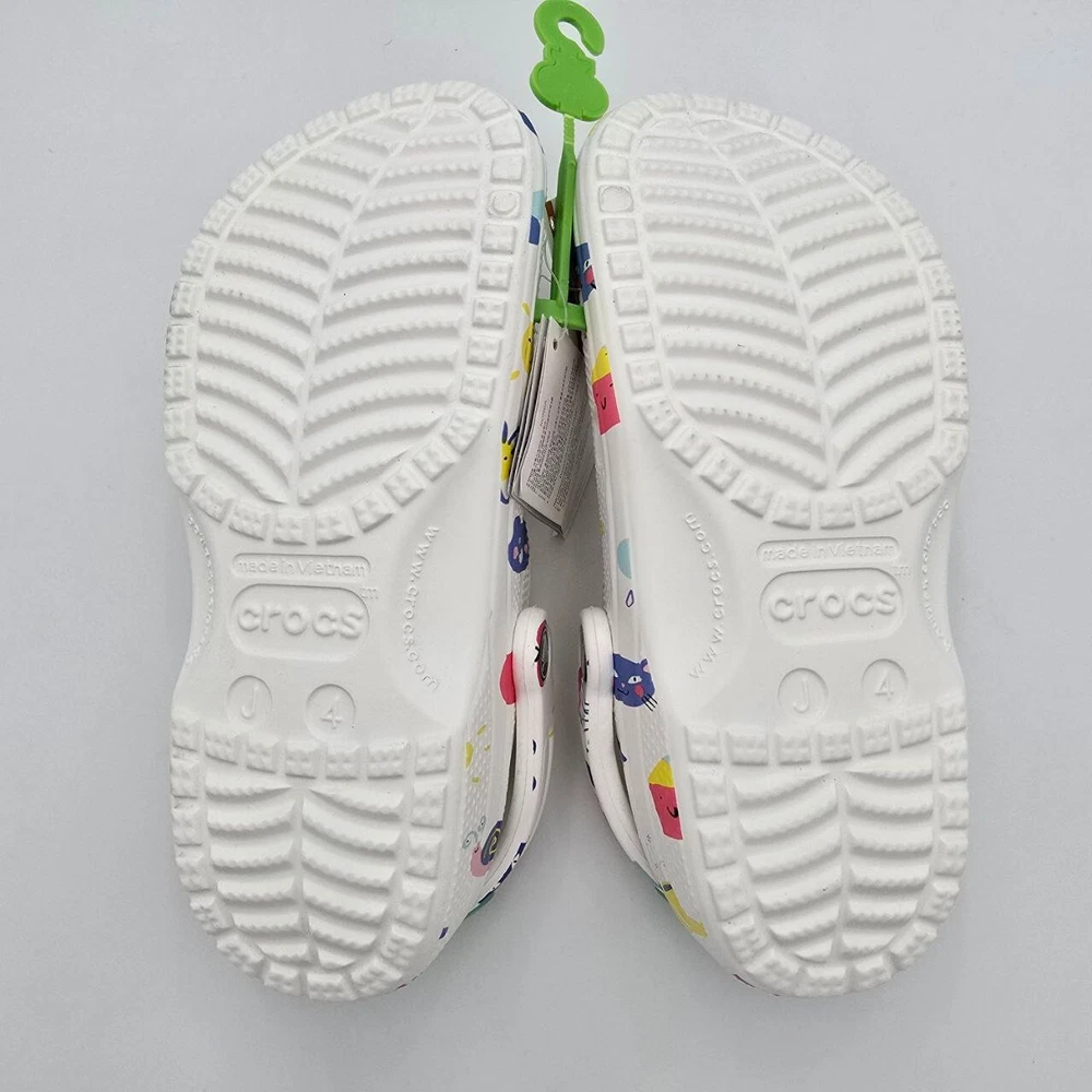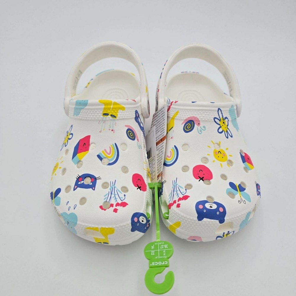 The Crocs Classic Doodle Print Clogs in Kid's Size 4 are white slip-on shoes designed for casual comfort. Featuring a round toe shape and flat heel style, these clogs are lightweight, waterproof, and cushioned for all-day wear. The colorful doodle print design adds a fun and playful touch, making them ideal for activities like walking, beach outings, or school. With a breathable synthetic upper and ankle strap for a secure fit, these Crocs are perfect for kids who enjoy expressing themselves with unique and vibrant footwear.