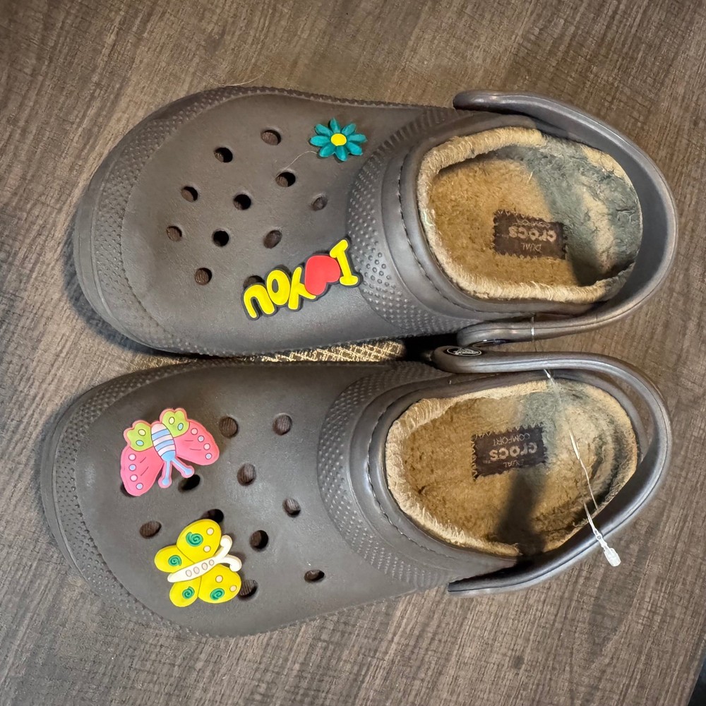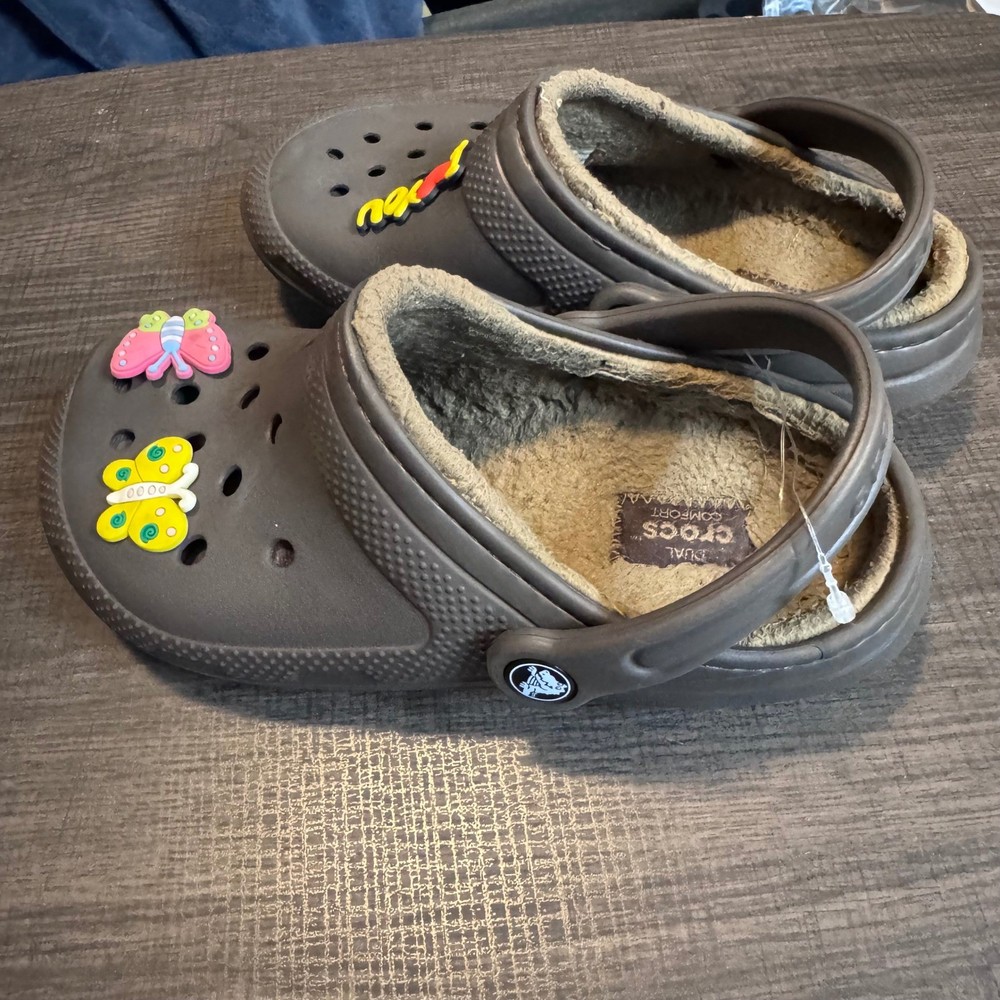 Style: Clog Department: Teens Upper Material: Synthetic Theme: Flower, Letters, Numbers & Words Type: Slipper Lining Material: Faux Fur Insole Material: Synthetic Pattern: Solid Heel Height: Flat (Under 1 in) Keywords: Crocs, Classic Clogs, Lined Clogs, Furry Clogs, Comfort Shoes, Kids Crocs, Toddler Crocs, Brown Crocs, Jibbitz, Girls Shoes, Boys Shoes, Slip On Shoes, Indoor Shoes, Outdoor Shoes
