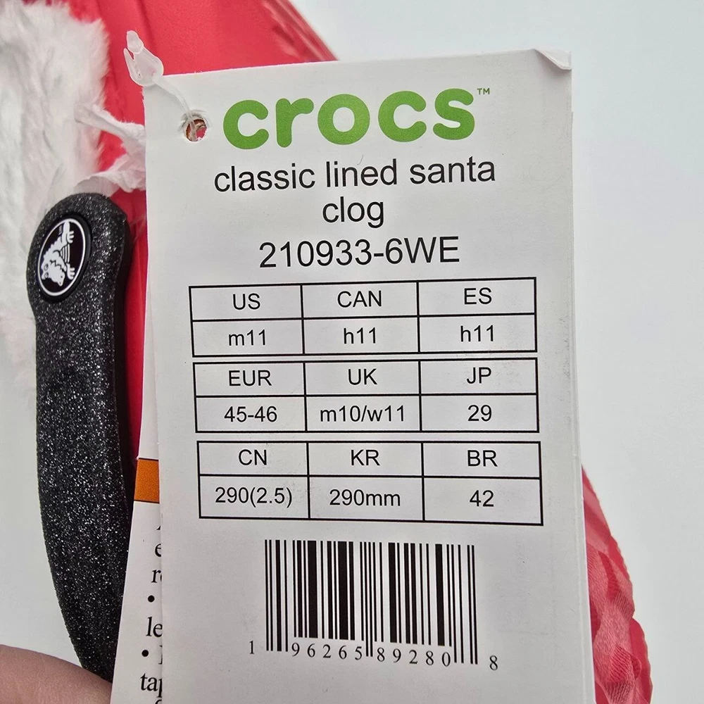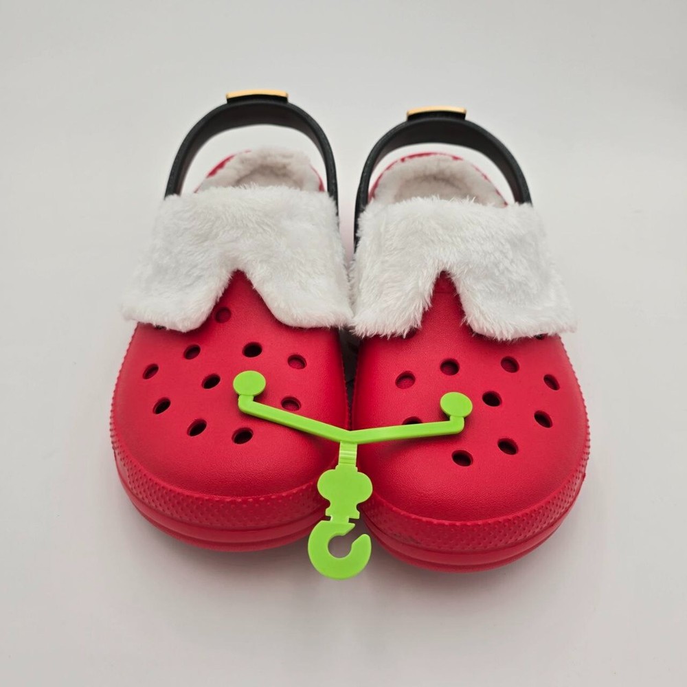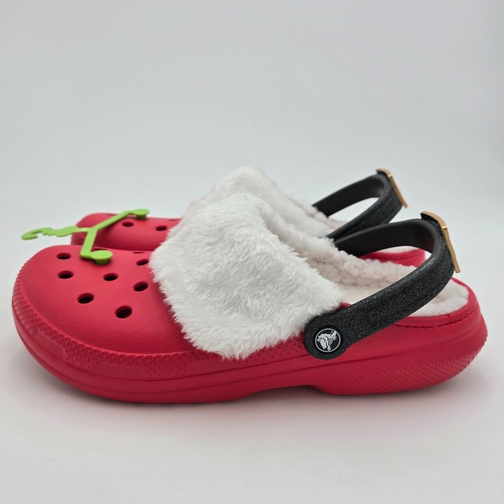 These Crocs Classic Lined Santa Clogs are designed for men in size 11 with a festive red color perfect for the Christmas holiday. Featuring a slip-on style with a round toe shape, they are adorned with a Santa Claus character theme, making them ideal for casual wear. The clogs are lined with faux fur for added warmth and comfort, and the synthetic outsole provides durability while being lightweight and breathable, making them suitable for winter and fall seasons. Perfect for travel or everyday wear, these Crocs offer cushioned support and a standard shoe width for a comfortable fit.
