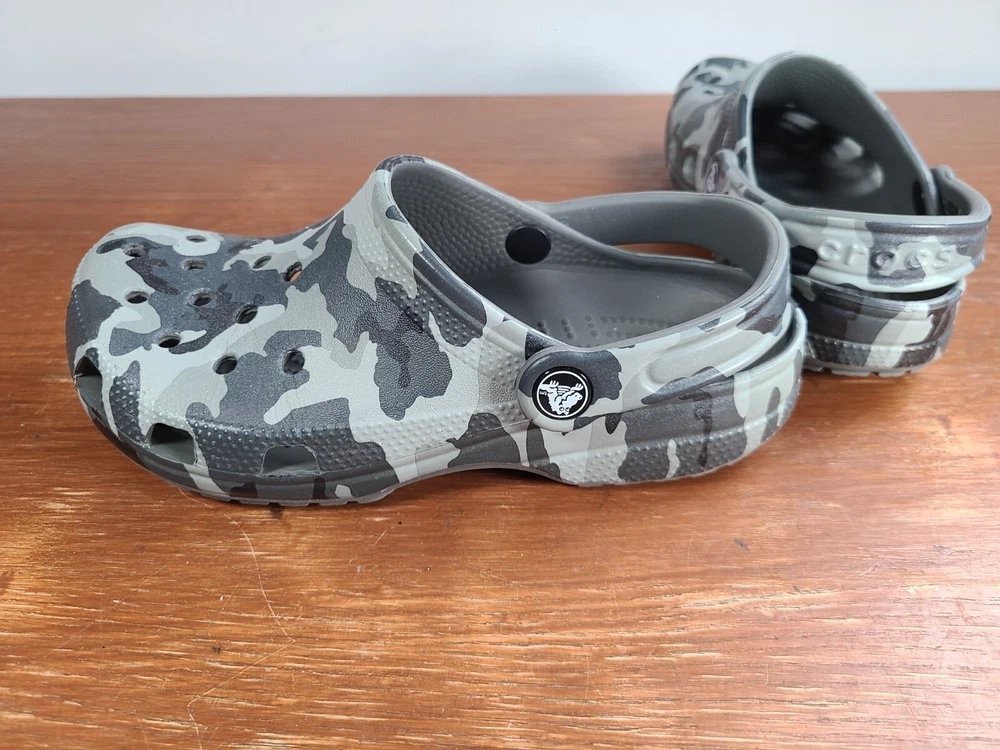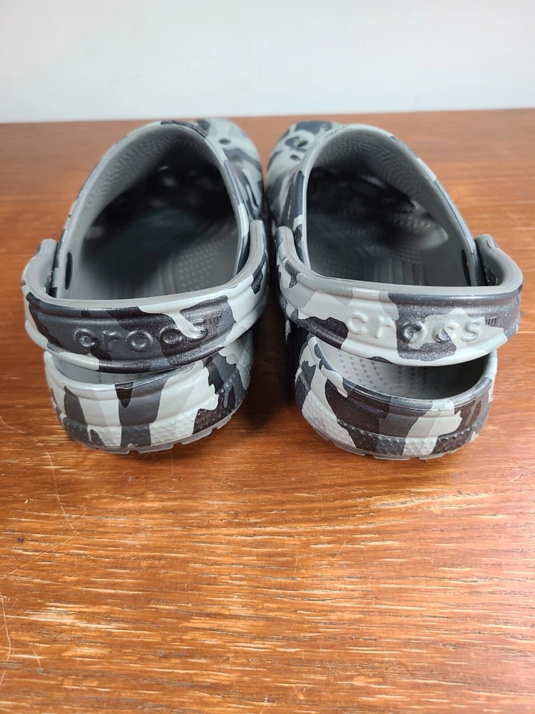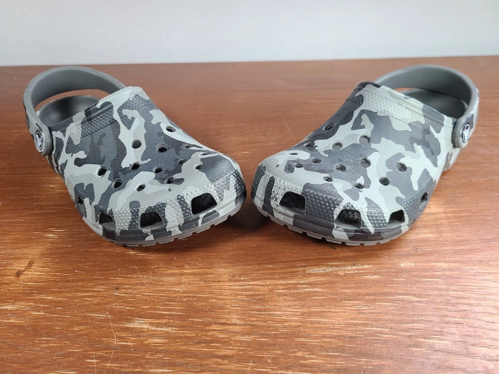 Crocs Classic Printed Camo Clogs Grey Camo 206454 Mens Size 4 Womens Size 6. Crocs are in preowned condition. See pictures for details. Please ask any questions before purchase. If there is any issue, please contact us first before leaving feedback. Thank you.