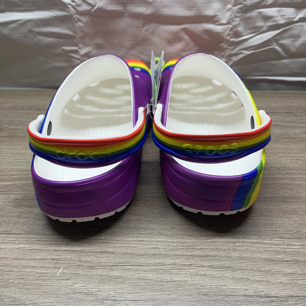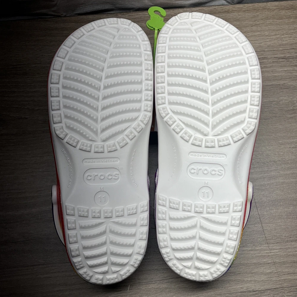 Unleash your vibrant side with the Crocs Classic Rainbow Dye Multicolor Clog, a playful addition to any casual ensemble. These clogs are designed with a tie-dye pattern that boasts an array of hues, making them a stand-out piece. Crafted for comfort and ease, they feature a slip-on design that ensures a secure and comfortable fit for everyday wear. Built to suit a variety of seasons, these synthetic upper clogs provide breathability and are equipped with a cushioned insole to support your arch. They're also lightweight and water-resistant, making them a practical choice for any setting. Whether you're out for a casual stroll or enjoying a day at the beach, these limited-edition Crocs offer both style and function in one vibrant package.