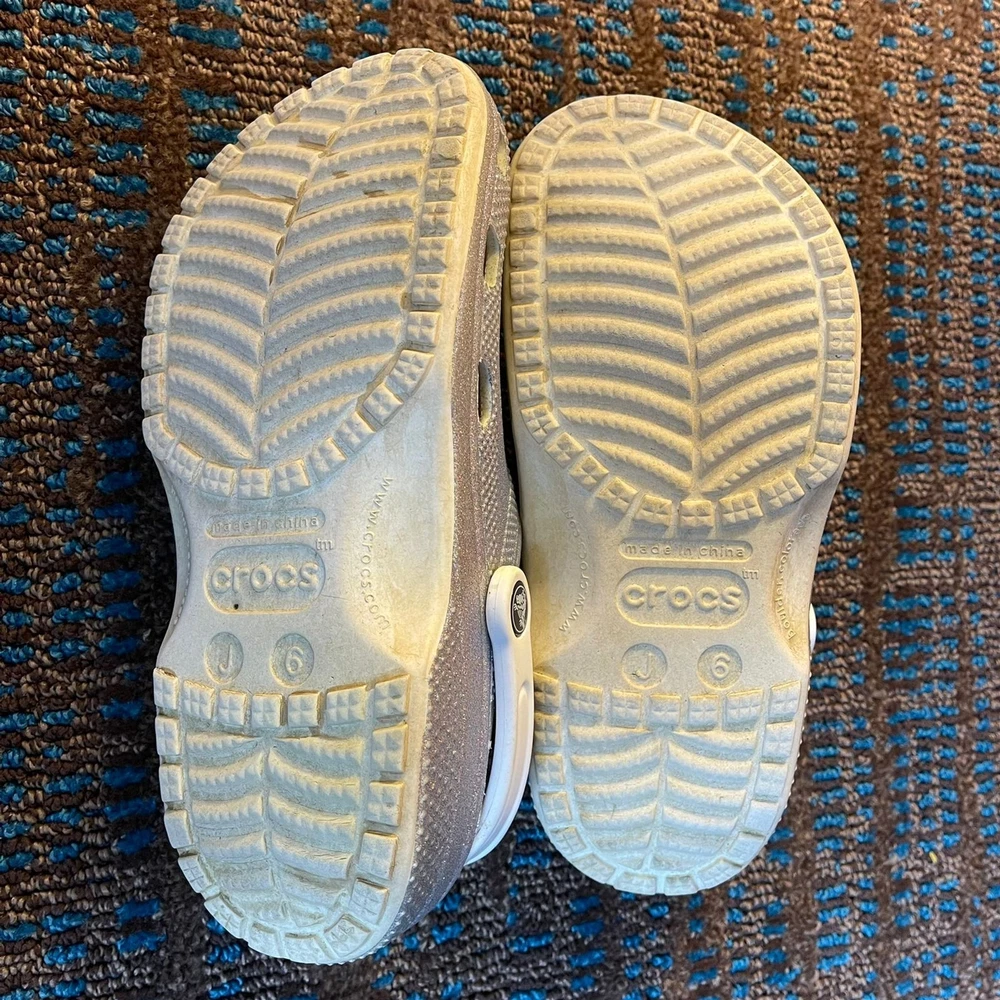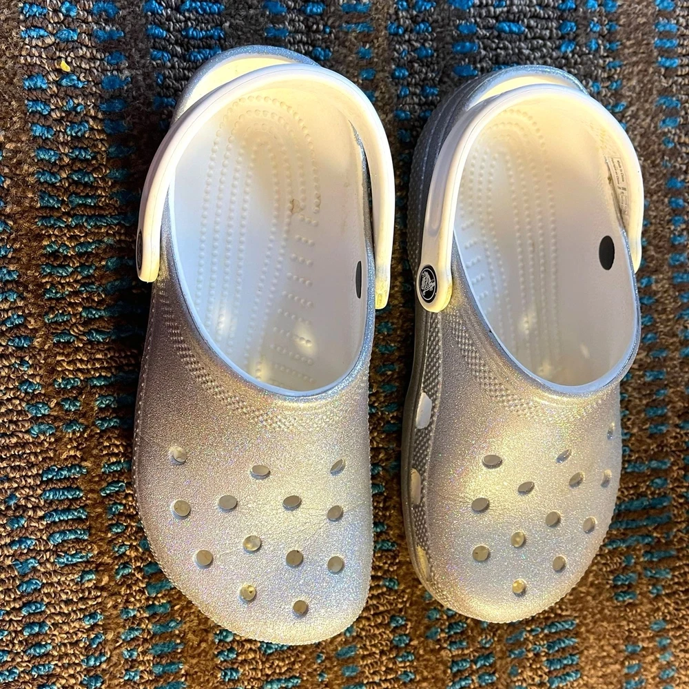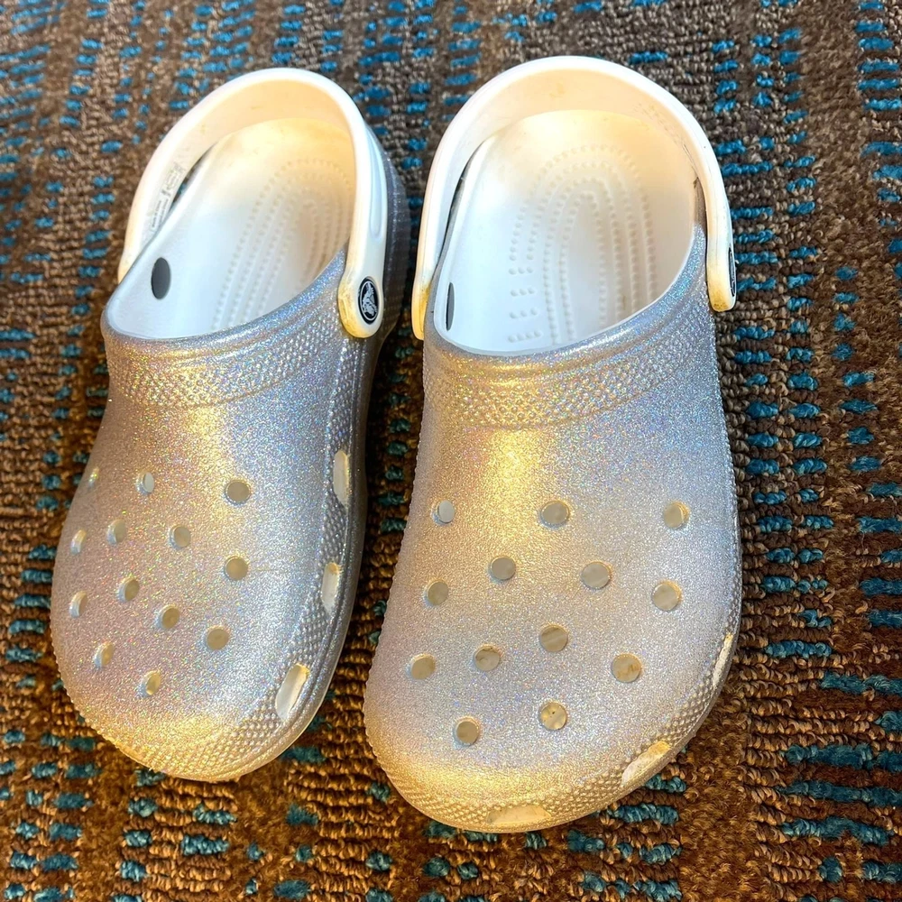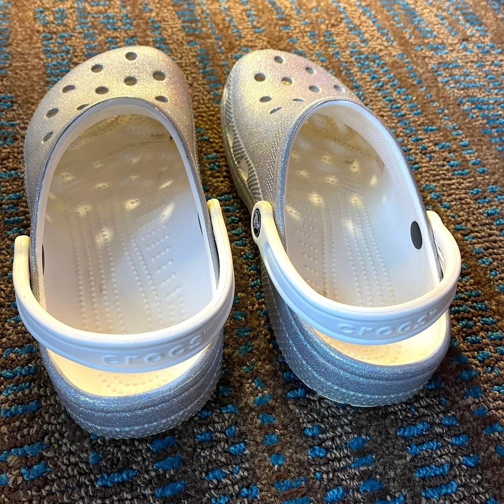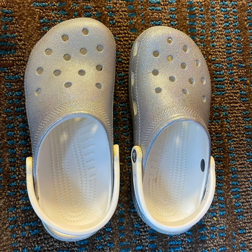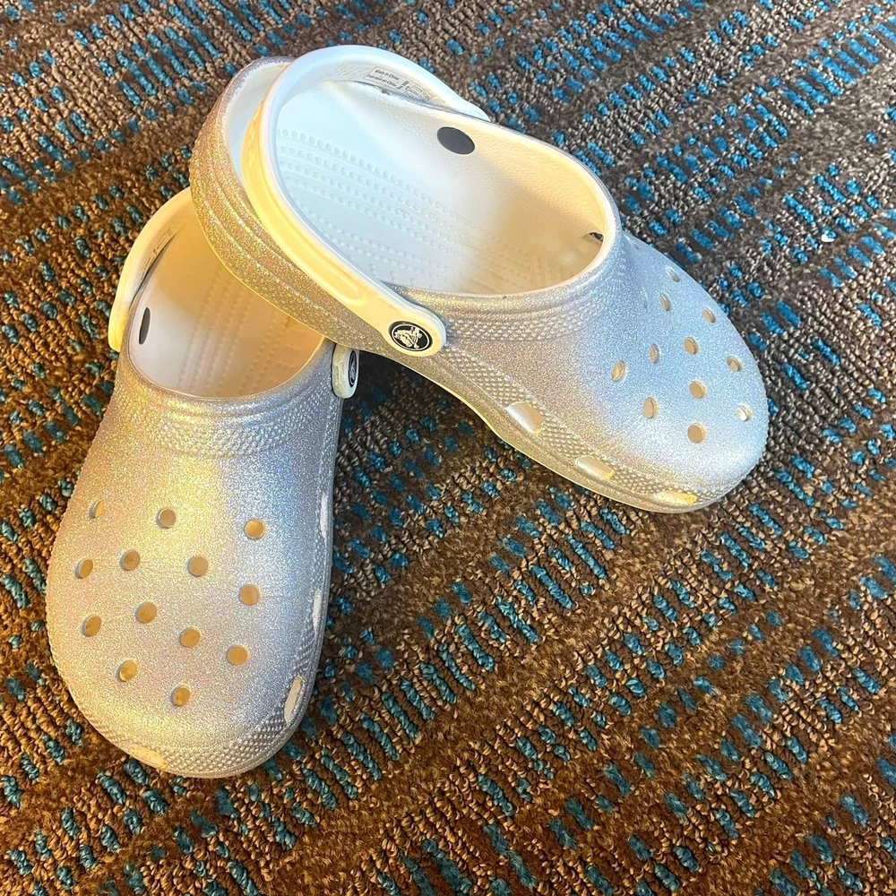 Crocs Clog Silver Unisex Comfort Sandals - Glitter Slip-On Shoes - Size 6 Step into comfort and style with these Crocs silver clogs, designed for both women and men. The lightweight, slip-on design ensures easy wear, while the glittery finish adds a fun and stylish touch. Perfect for casual outings, poolside, or a comfortable day at home, these shoes offer all-day comfort with the signature Croslite™ foam footbed. Key Features: Brand: Crocs Color: Silver with Glitter Detail Unisex Design – suitable for both women and men Size: 6 (US) Gently used, in great condition