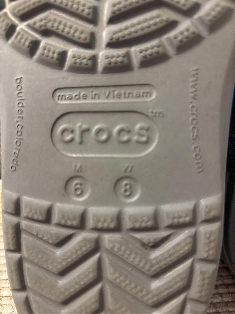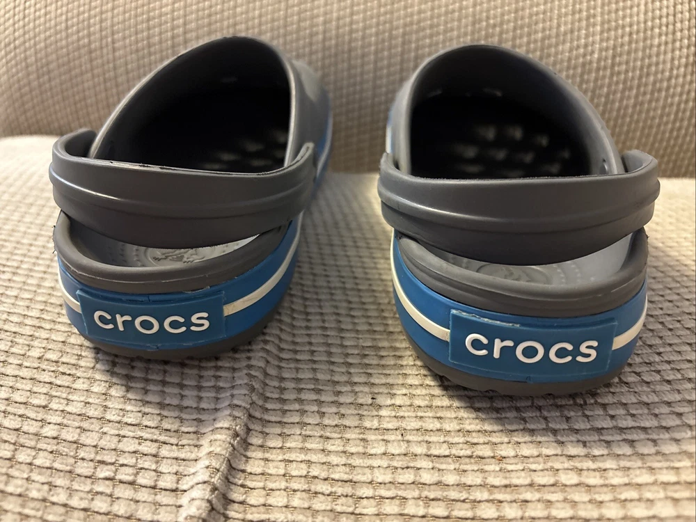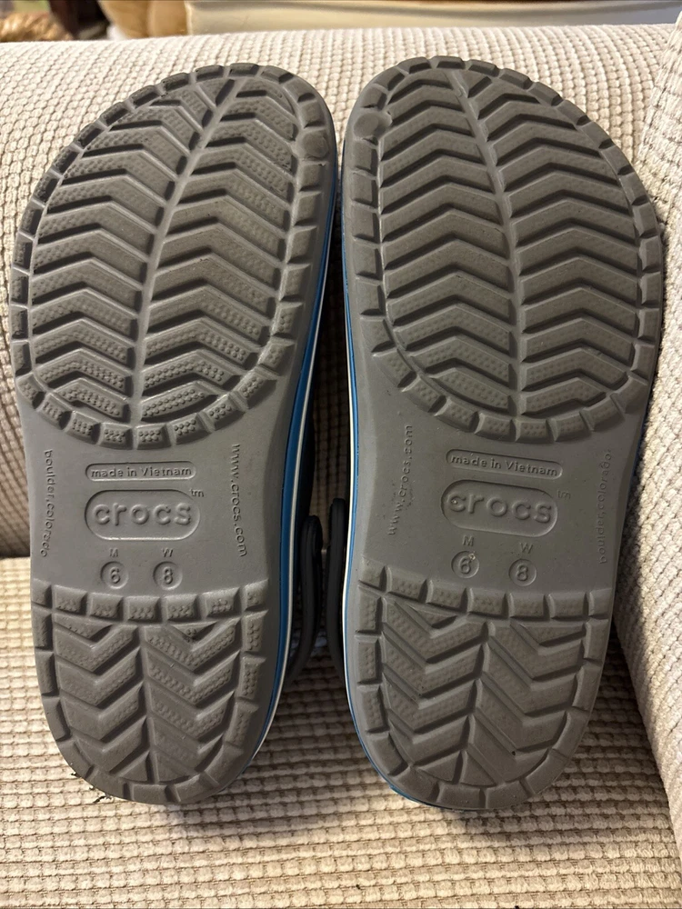 The Crocs Crocband II Clogs in gray and blue are designed for both men's size 6 and women's size 8. These slip-on clogs feature a solid pattern with a comfortable flat heel height, making them suitable for casual wear. The clogs are made of rubber material, with a synthetic lining and rubber insole for added comfort and breathability. The Crocband II style from the Crocs brand offers a standard width fit and is a versatile choice for everyday activities.
