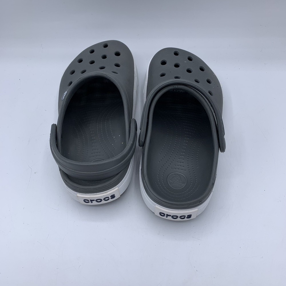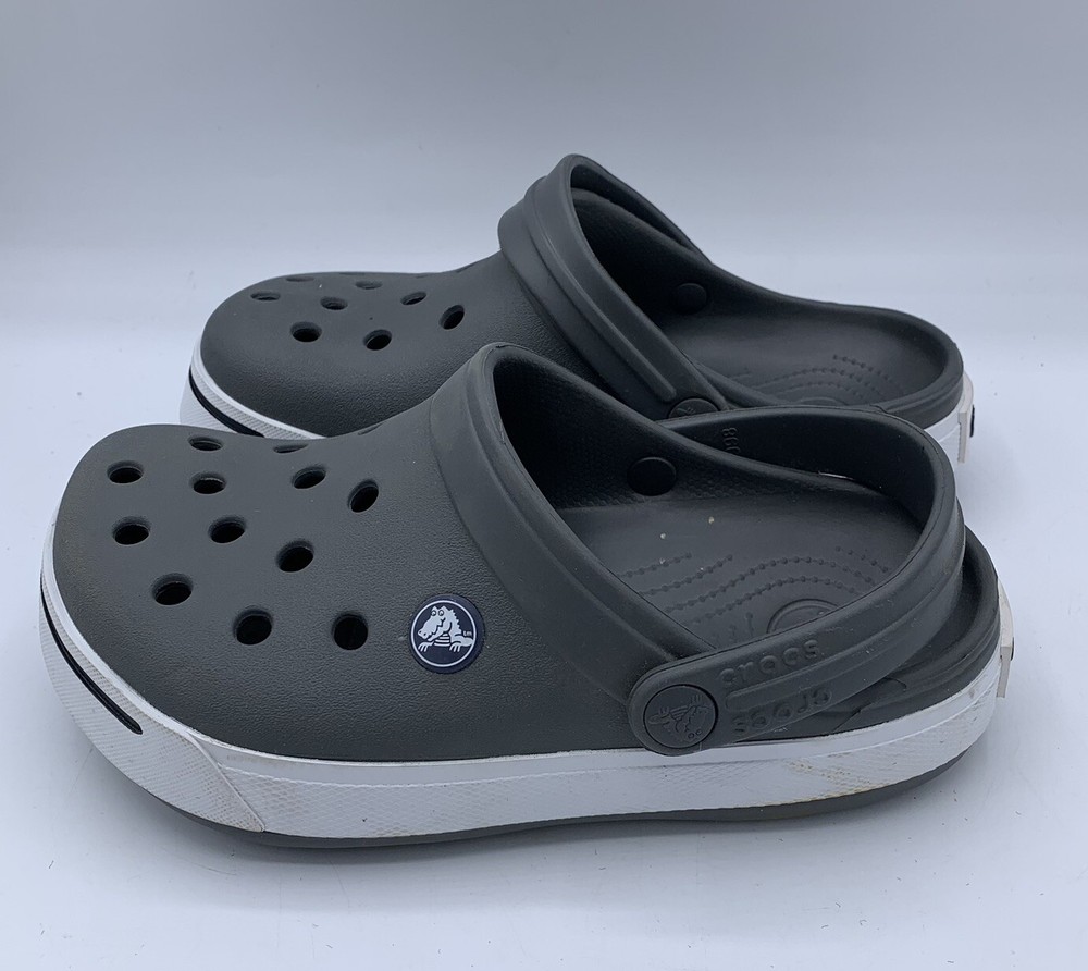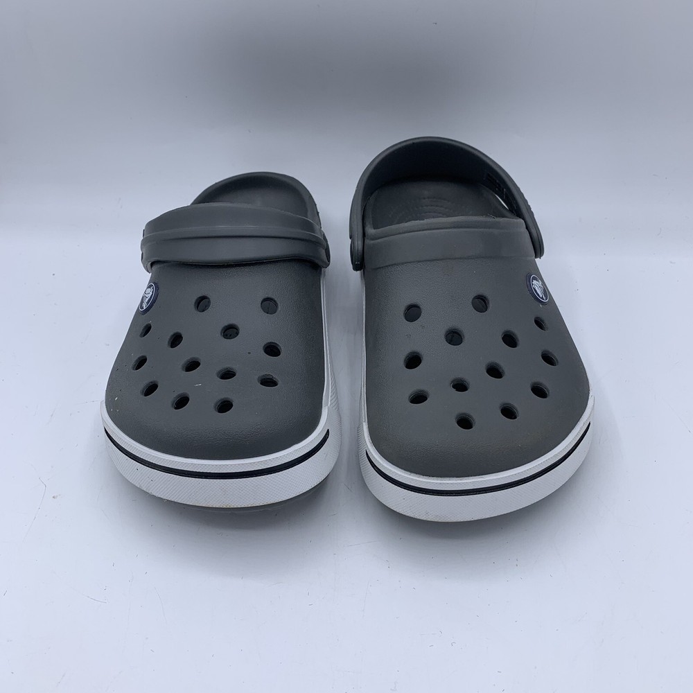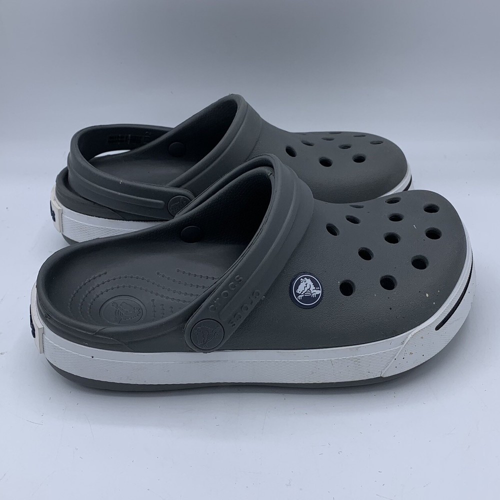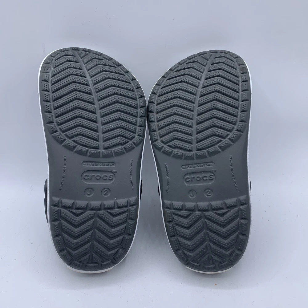 The Crocs Crocband Junior 2J Clogs Sandal Shoes in Gray are designed for unisex kids in size 2. The shoes feature a low top clog style with a slip-on closure, perfect for casual wear. Made by the brand Crocs, these shoes are lightweight, comfortable, and breathable, making them ideal for walking activities. The rubber upper and lining provide durability and support, while the flat heel height ensures stability for young wearers. Perfect for everyday wear, these shoes offer classic style and comfort for kids on the go. EUC