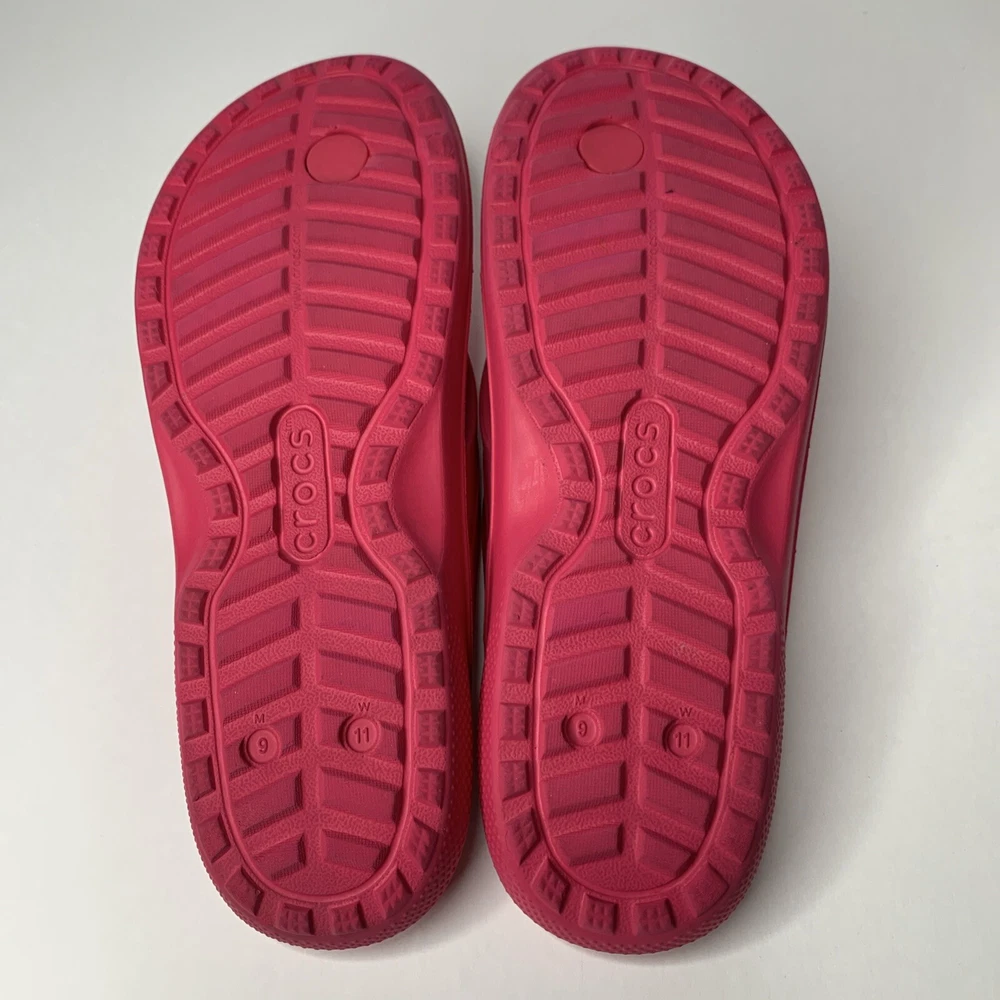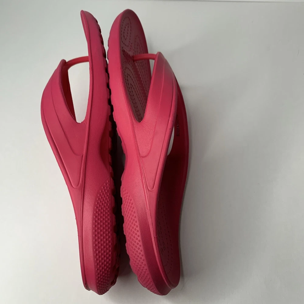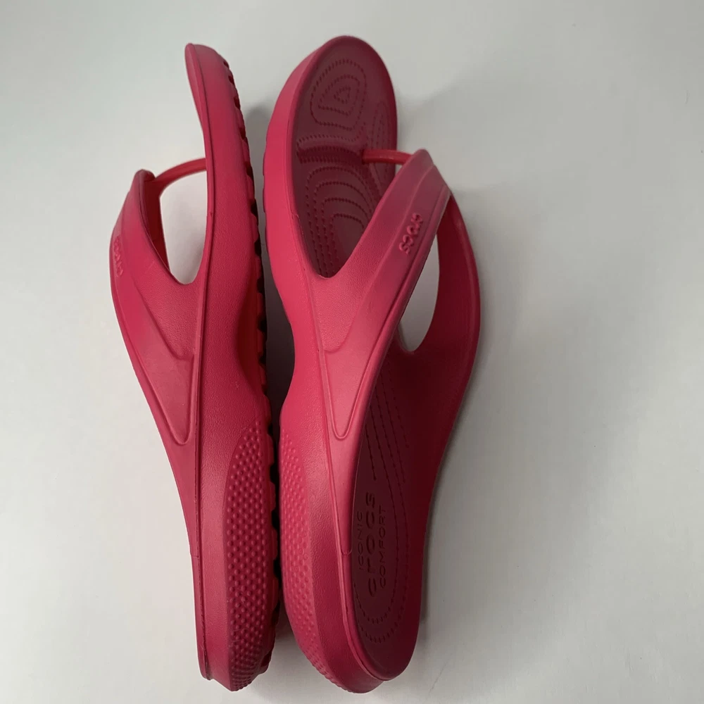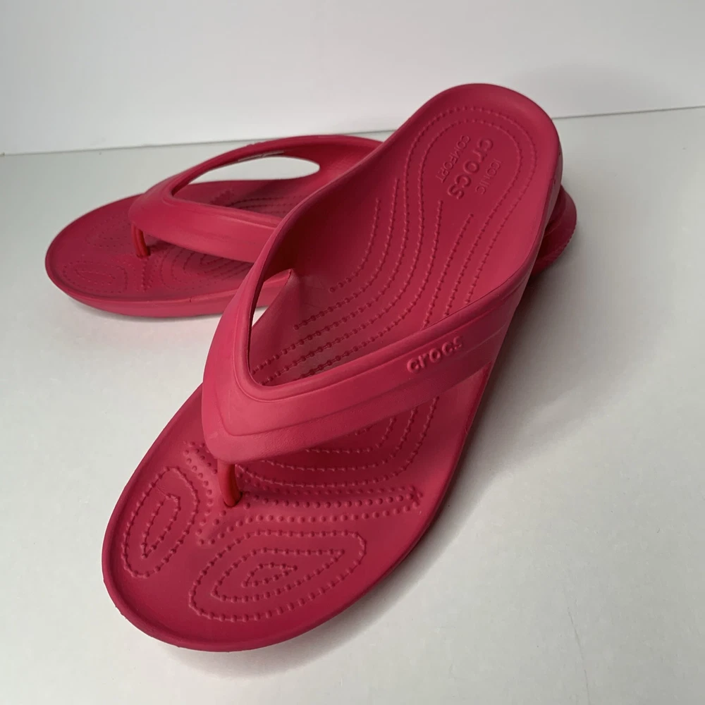 These Crocs thong flip flops in hot pink are designed for women in size 11 (US) or 9 (UK). The sandals feature Crocs' iconic comfort with a lightweight, breathable rubber construction and a flat heel style. Perfect for travel, activewear, or casual wear during the summer, fall, or spring seasons. The Kadee model showcases the Crocs logo and is suitable for outdoor activities.