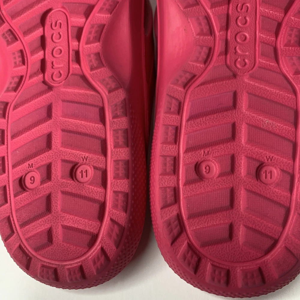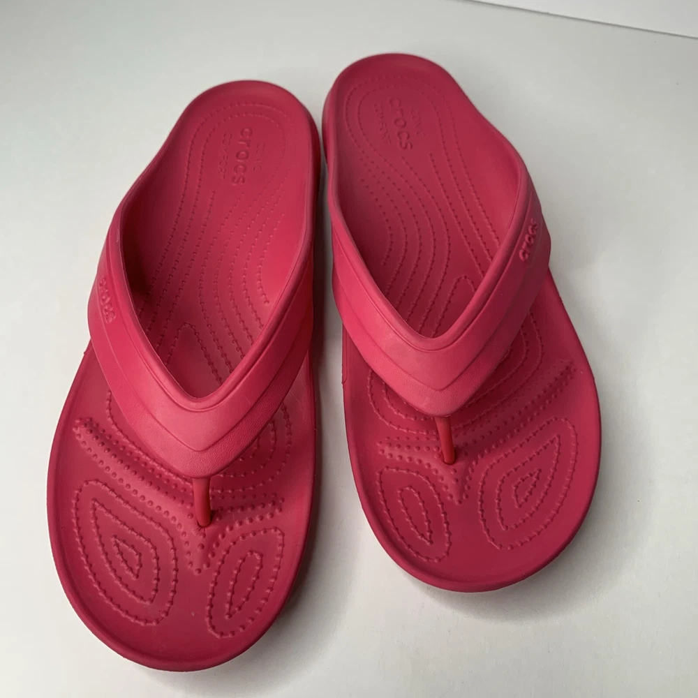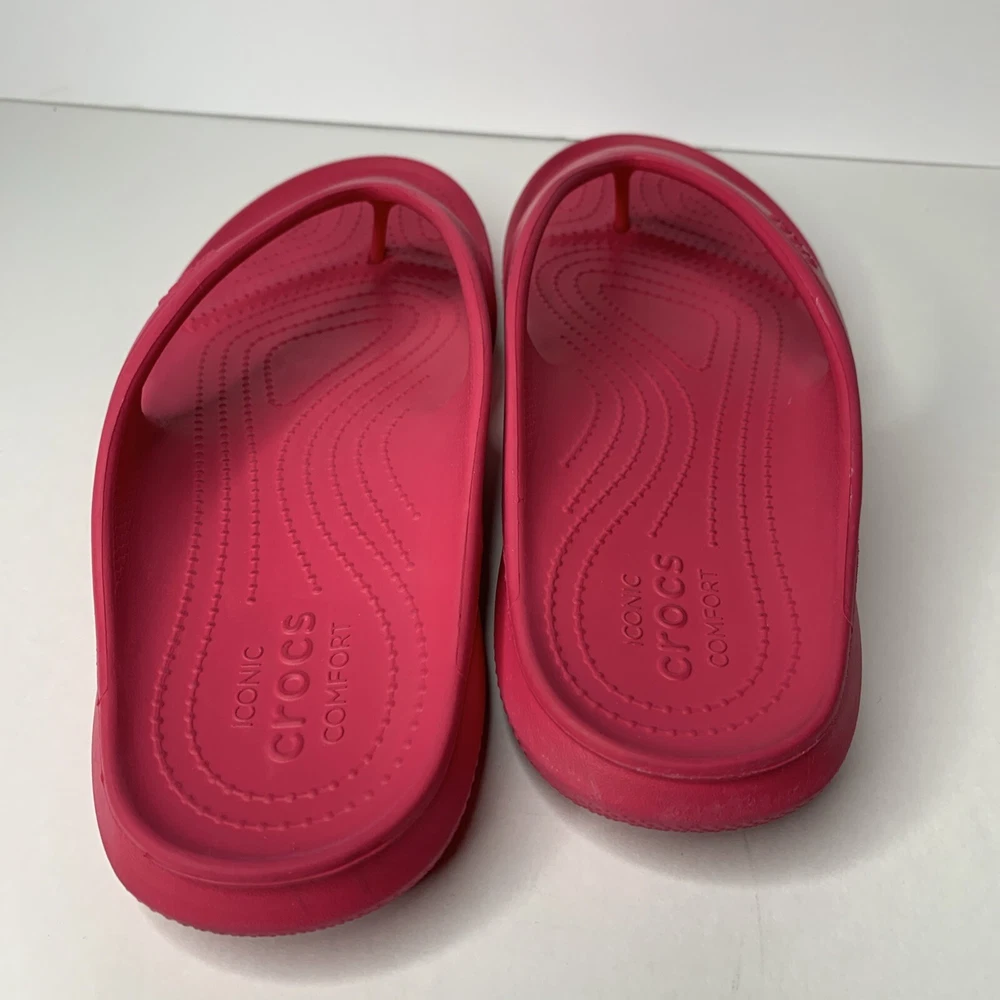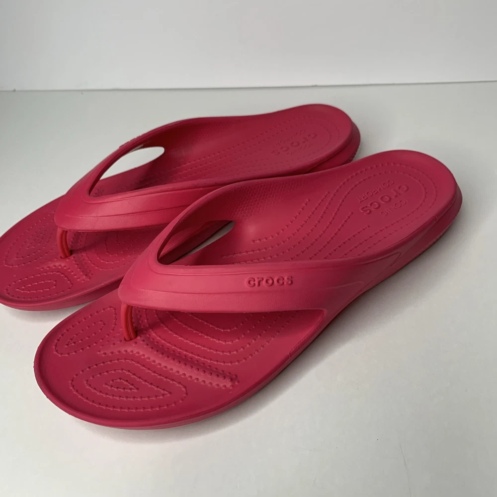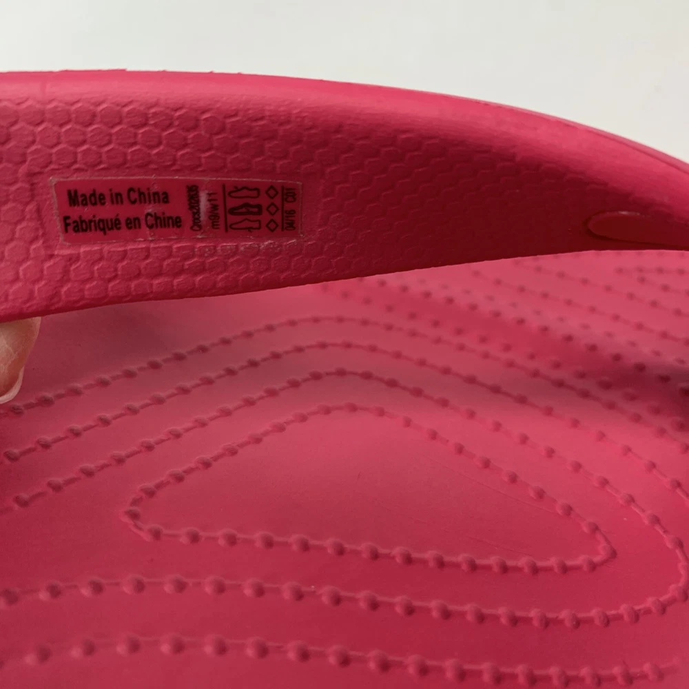 These Crocs thong flip flops in hot pink are designed for women in size 11 (US) or 9 (UK). The sandals feature Crocs' iconic comfort with a lightweight, breathable rubber construction and a flat heel style. Perfect for travel, activewear, or casual wear during the summer, fall, or spring seasons. The Kadee model showcases the Crocs logo and is suitable for outdoor activities.