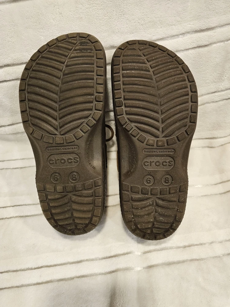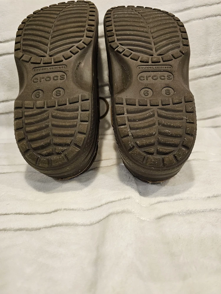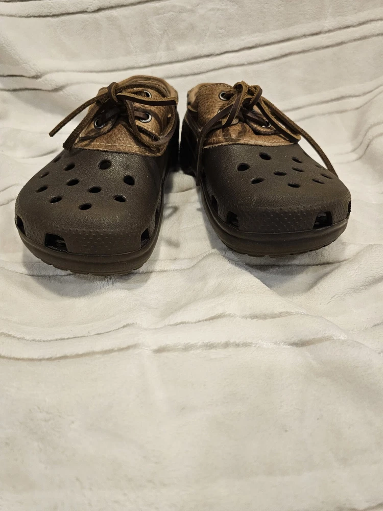 Used brown leather and rubber pit crew crocs. Please see pictures for details.