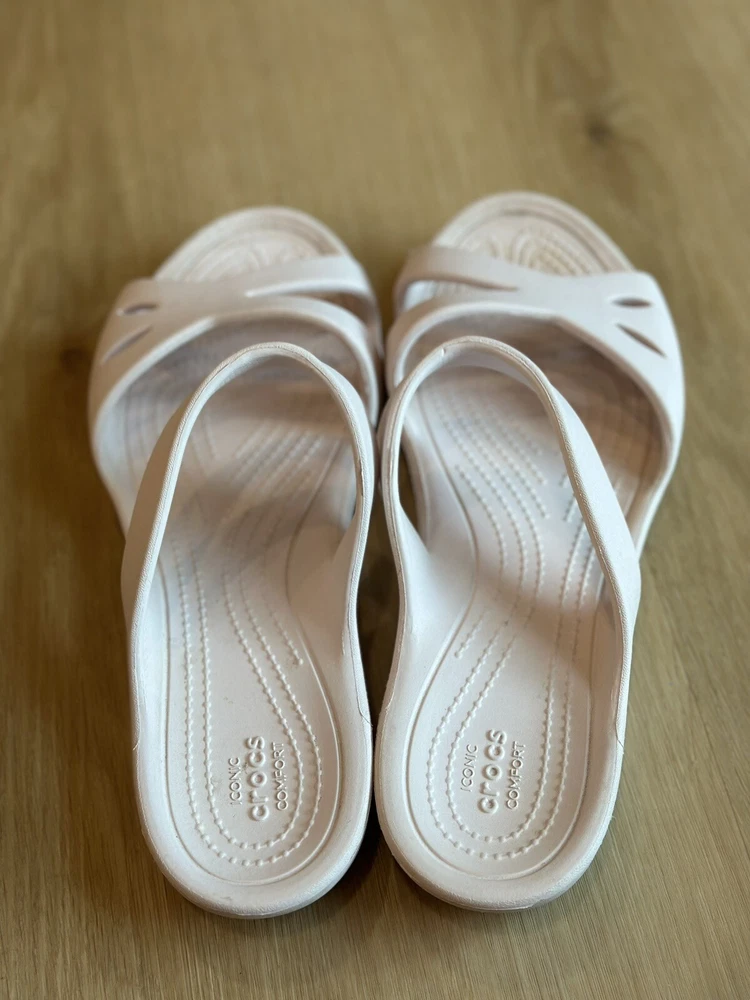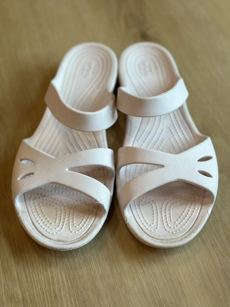 Step into summer with these Crocs Kelli sandals in white. These slip-on sandals feature a flat heel, making them perfect for casual occasions. The rubber outsole provides durability, while the lightweight and breathable design ensures maximum comfort. The Crocs Kelli sandals also come with a stylish logo accent, adding a touch of flair to your outfit. These sandals are available in US size 10 and UK size 8, with an EU size of 41. The upper material is also made of rubber, while the insole is also designed with breathability in mind. Whether you're running errands or going to the beach, these Crocs Kelli sandals are the perfect addition to your wardrobe.