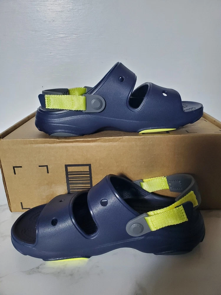 Crocs Kids’ Classic All-Terrain Sandal Unisex Size 5J Navy Blue 207707-410. Condition is New with tags. Travel. Exploration. Adventures near and far. The look and feel of the Classic Kids' All-Terrain Clog, now in sandal form. The rugged tread pattern and rubber pods add traction and support, while the two-strap upper and adjustable turbo backstraps work to keep up with their outdoorsy lifestyle. Seven holes in each sandal allow for personalization with charms and a lightweight Croslite foam construction makes them a practical choice for any outing. Flip that strap back and go wild.