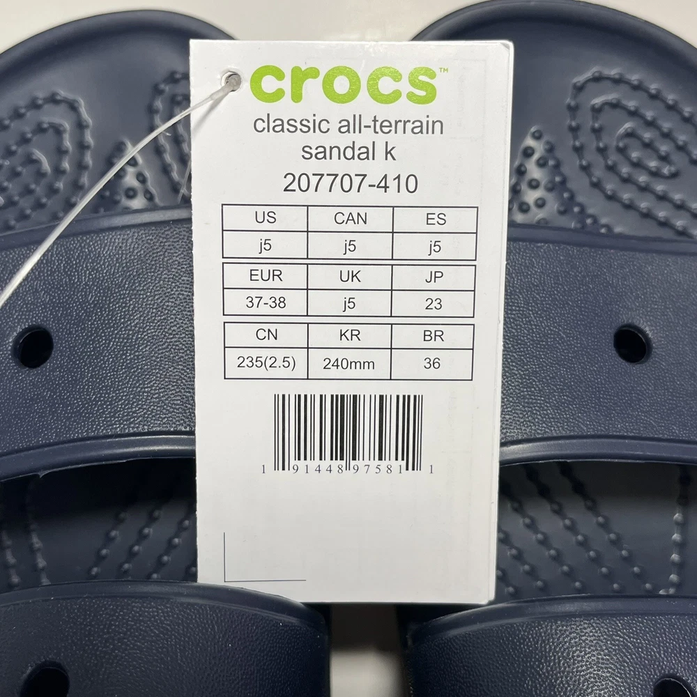 Crocs Kids’ Classic All-Terrain Sandals Unisex Size 5J Navy Blue 207707-410. Condition is New with tags. Travel. Exploration. Adventures near and far. The look and feel of the Classic Kids' All-Terrain Clog, now in sandal form. The rugged tread pattern and rubber pods add traction and support, while the two-strap upper and adjustable turbo backstraps work to keep up with their outdoorsy lifestyle. Seven holes in each sandal allow for personalization with charms and a lightweight Croslite foam construction makes them a practical choice for any outing. Flip that strap back and go wild.