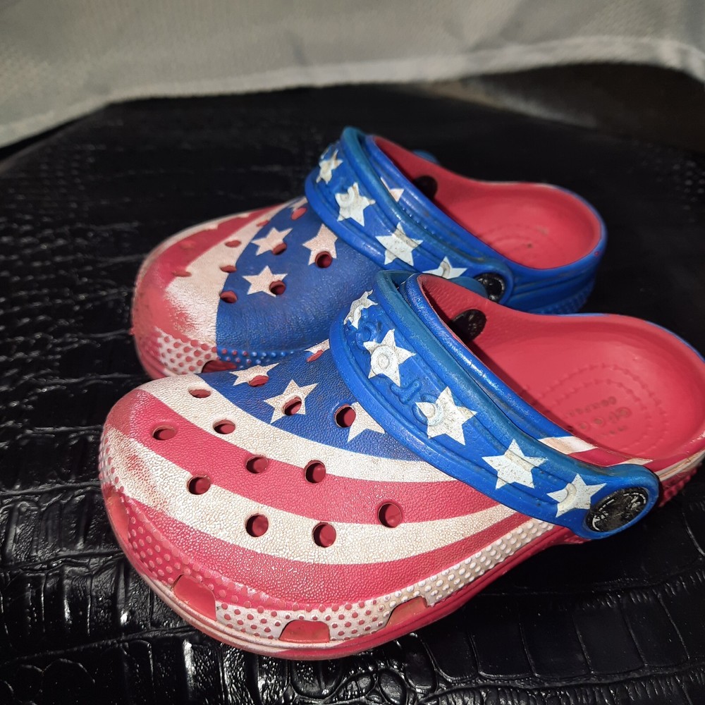 Celebrate the spirit of freedom and patriotism with these Crocs Kids Classic American Flag clogs. The vibrant red, white, and blue color scheme is accented with a bold American flag pattern, making these shoes a perfect choice for any young patriot. The lightweight and comfortable design feature a breathable material that keeps your child's feet cool and comfortable throughout the day. The slip-on design with a round toe shape ensures easy wear and a relaxed fit, while the rubber outsole and upper provide durable wear. These unisex kids' clogs are a perfect addition to any casual wardrobe, and the classic design is sure to be a hit with both parents and kids alike. The Crocs Comfort Slide line is known for its quality and comfort, and these shoes are no exception. Add a touch of American pride to your child's wardrobe with these stylish and comfortable clogs.