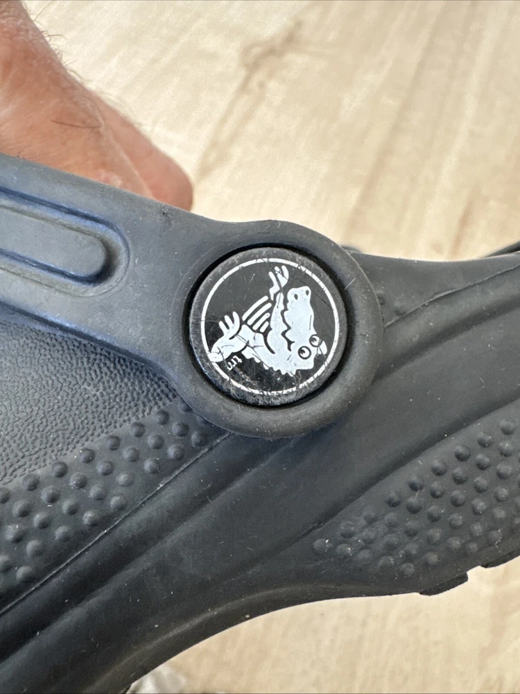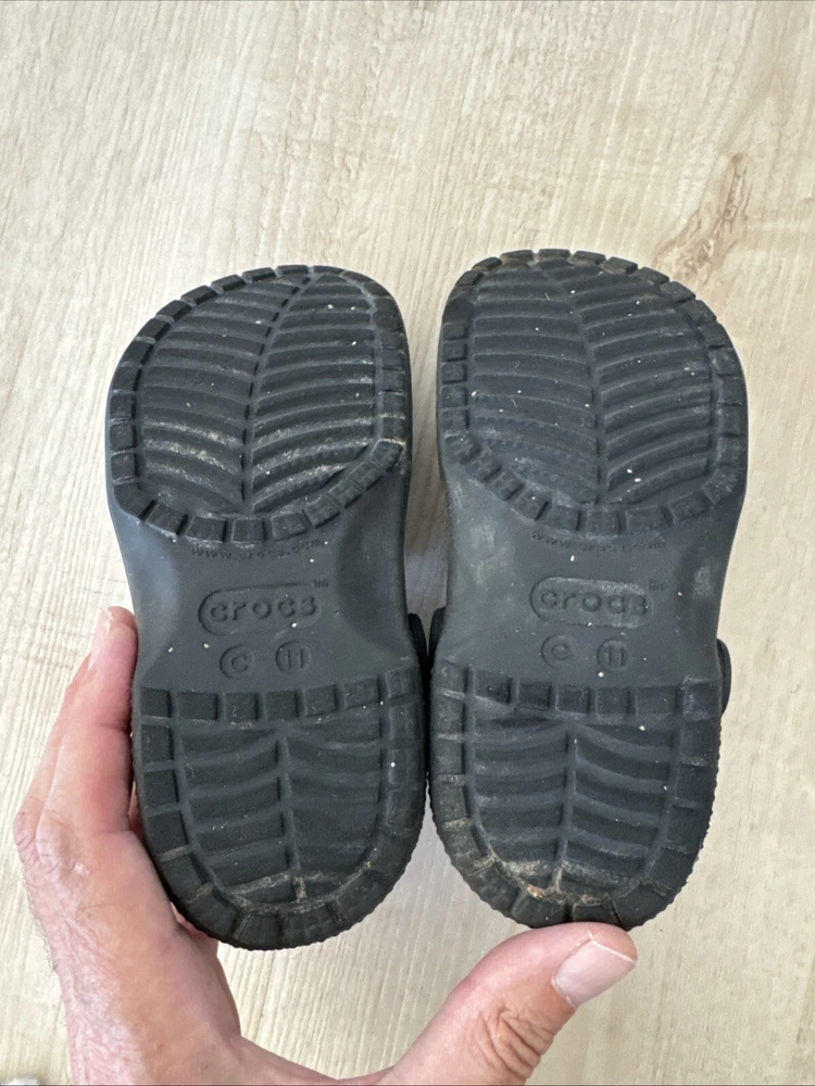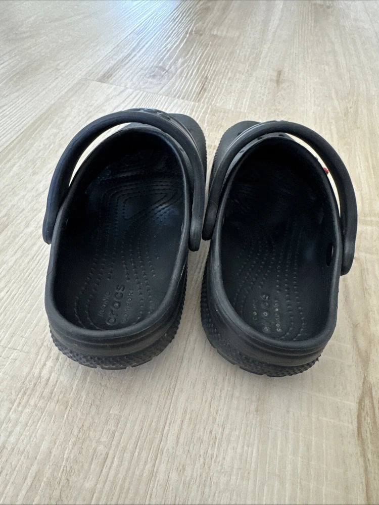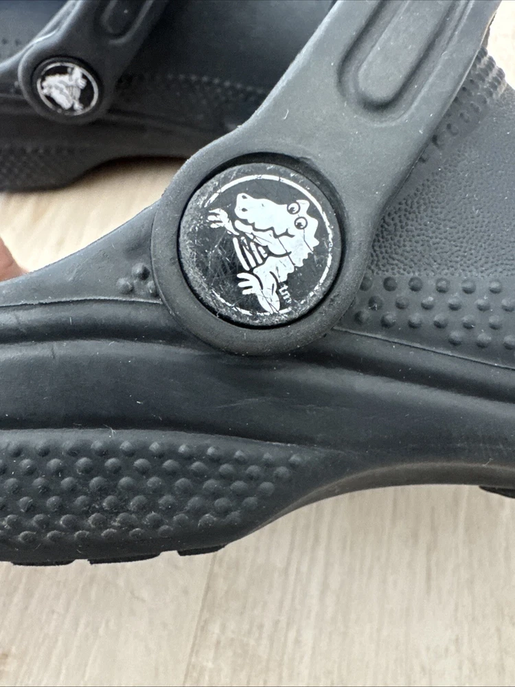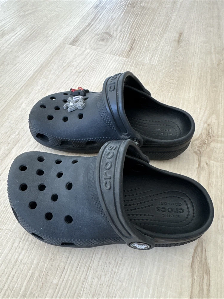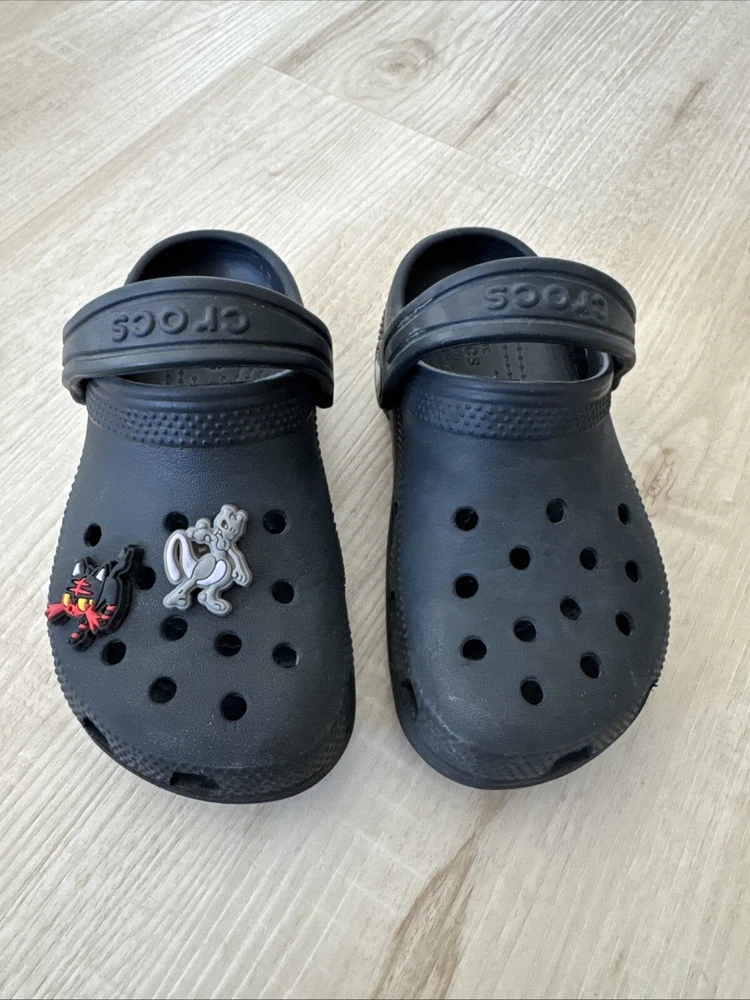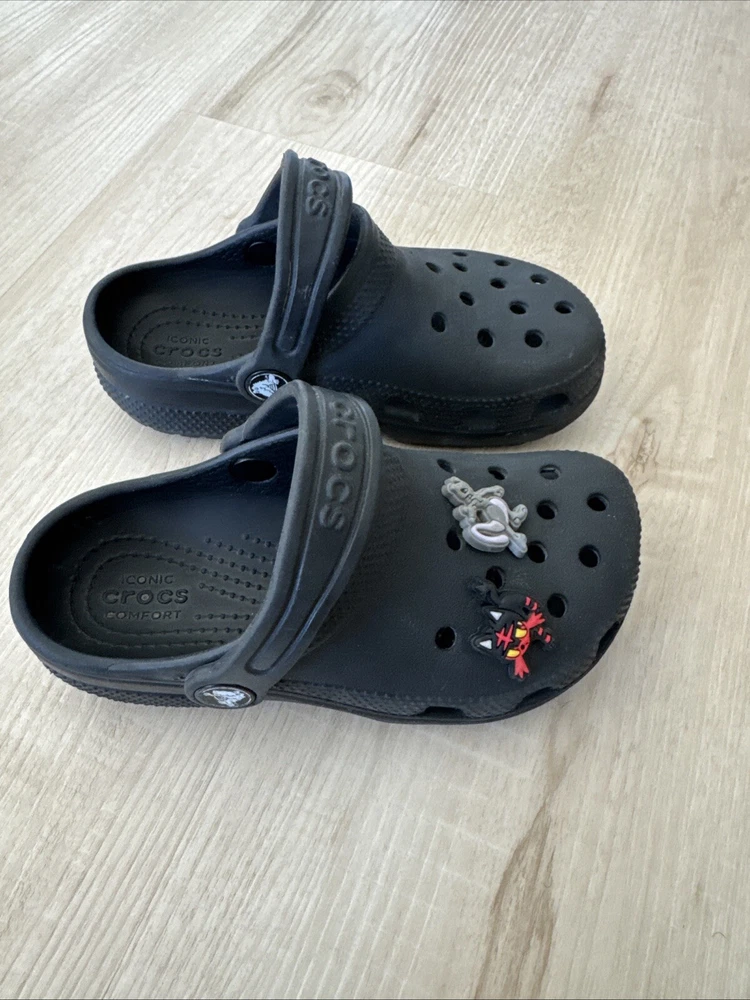 Children Black Crocs. Pre-Owned. They have been cleaned but do have some scuffs imperfections and slight wear. The weee used briefly. 2 Pokémon charms included.