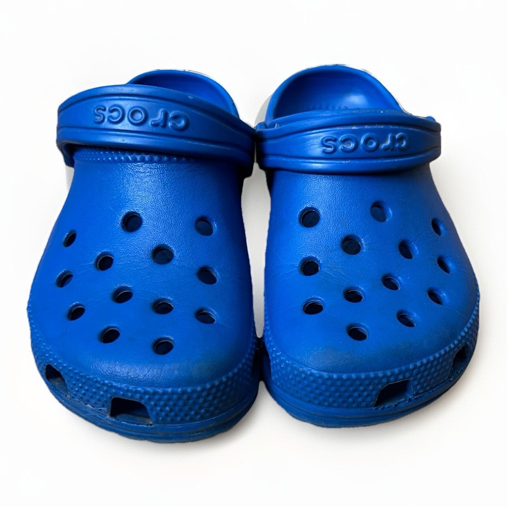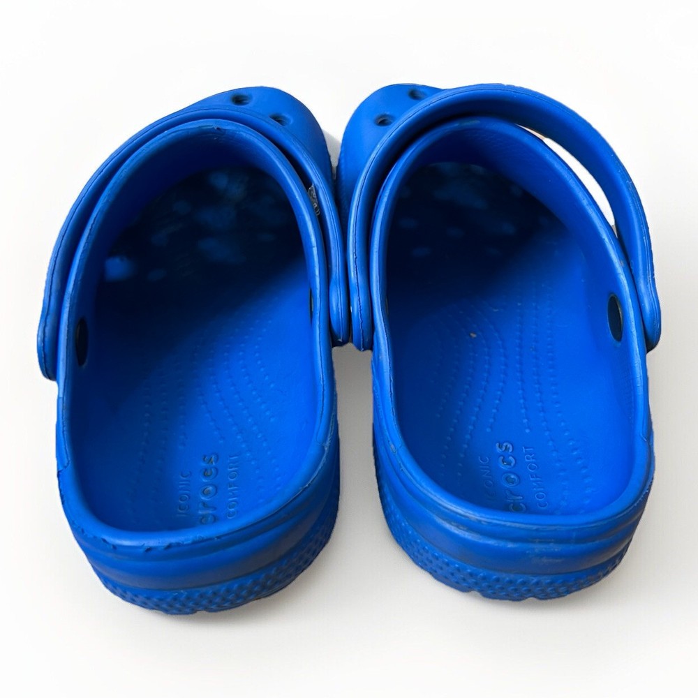 This Crocs Kids' Classic Clog in Blue, size 12, is a slip-on shoe featuring a round toe and a flat heel. Suitable for casual occasions, it is a unisex style perfect for kids in the summer, fall, and spring seasons. The clog has a classic design with a multicolor theme and belongs to the Crocs brand.
