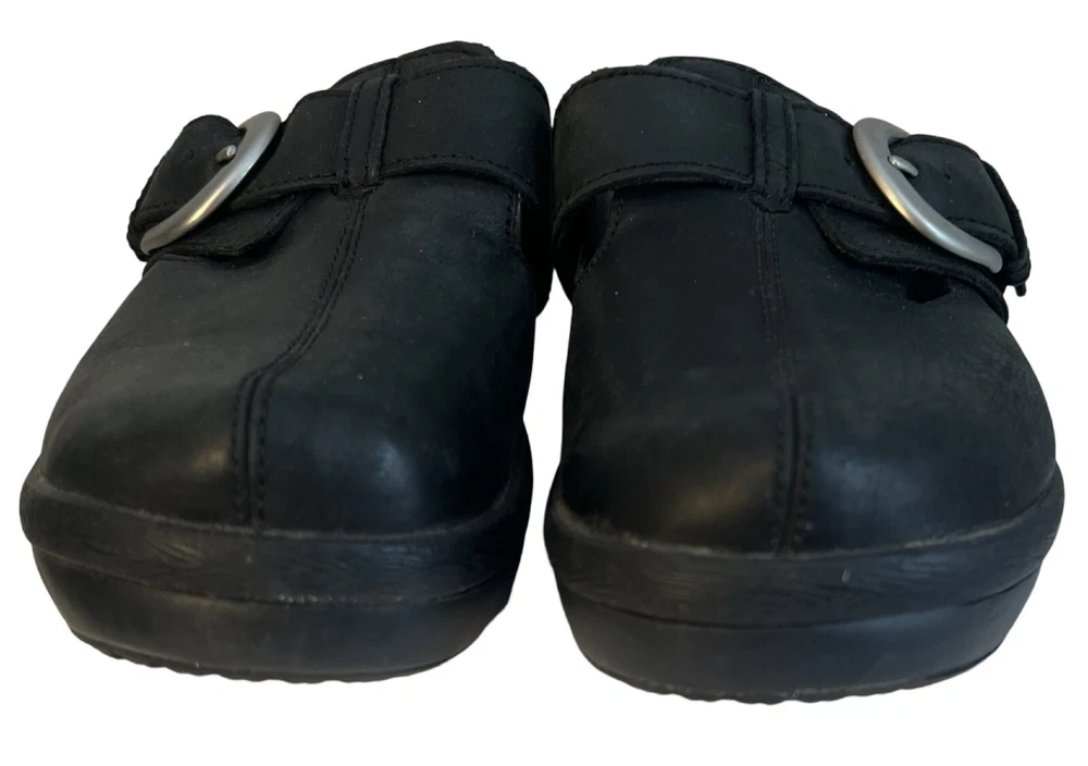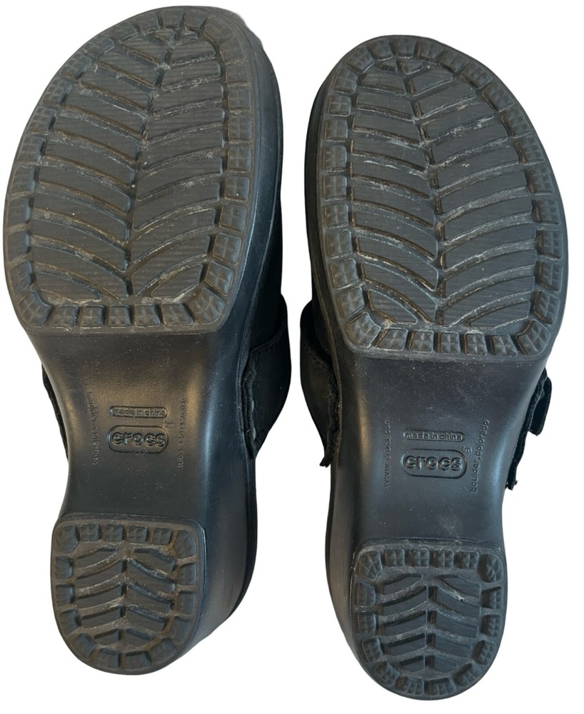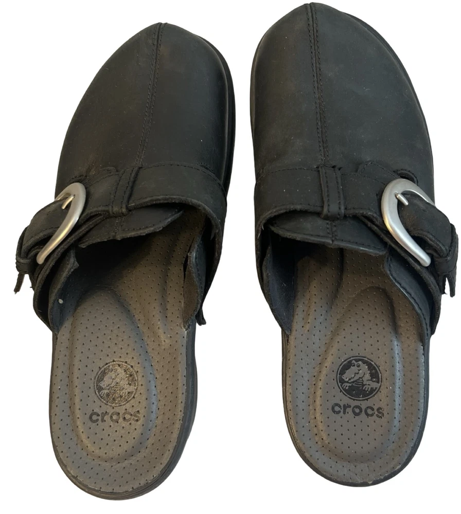 excellent condition | some wear as shown in photos | no marks on the leather These Crocs Leather Clogs in size 6 are stylish and comfortable slip-on shoes for women. They feature a black leather upper with a silver buckle accent. Designed with arch support, and cushioning, they are perfect for travel, workwear, or casual occasions. The clogs have a round toe shape, mid heel height, and are comfortable, making them versatile for all seasons. ** all items stored in smoke-free pet-free home