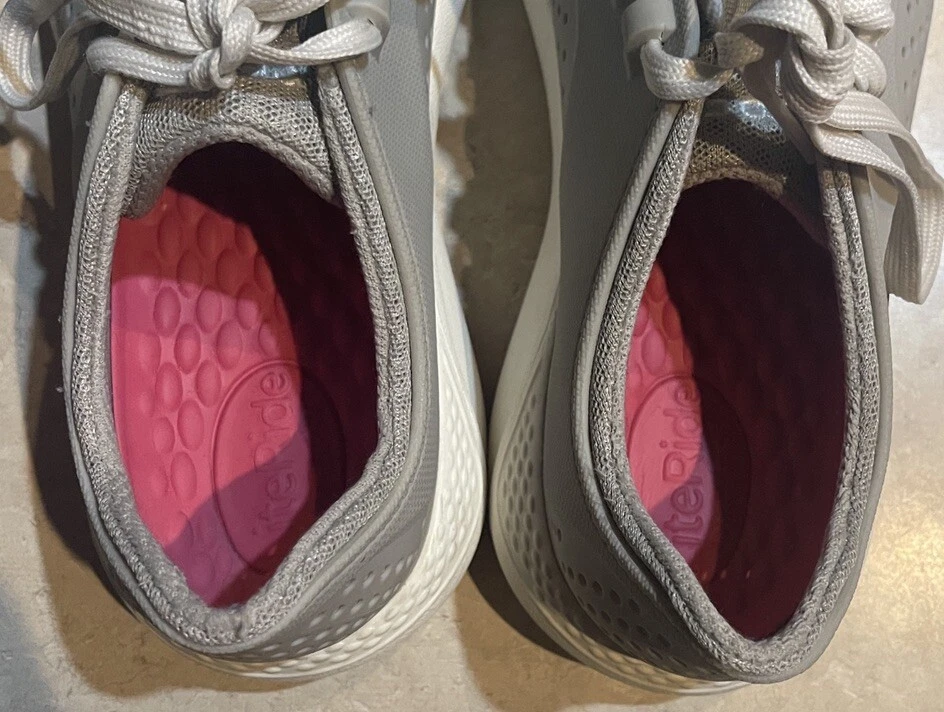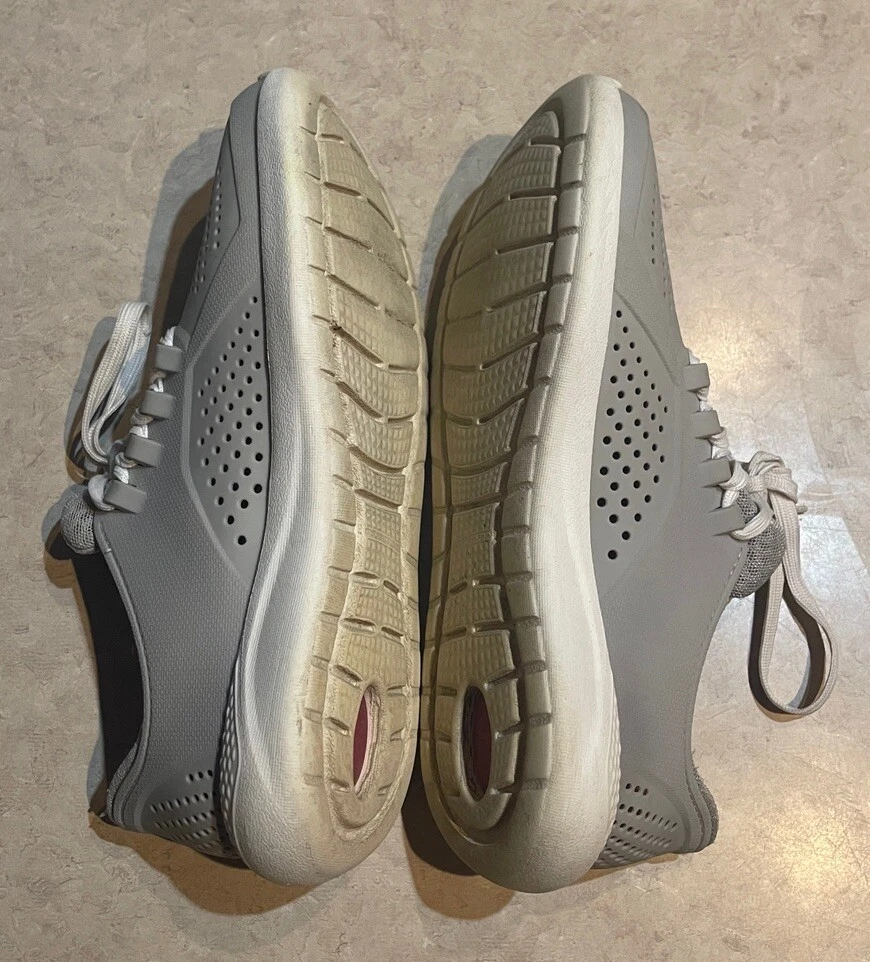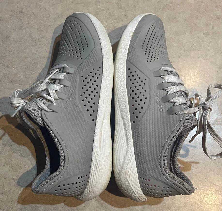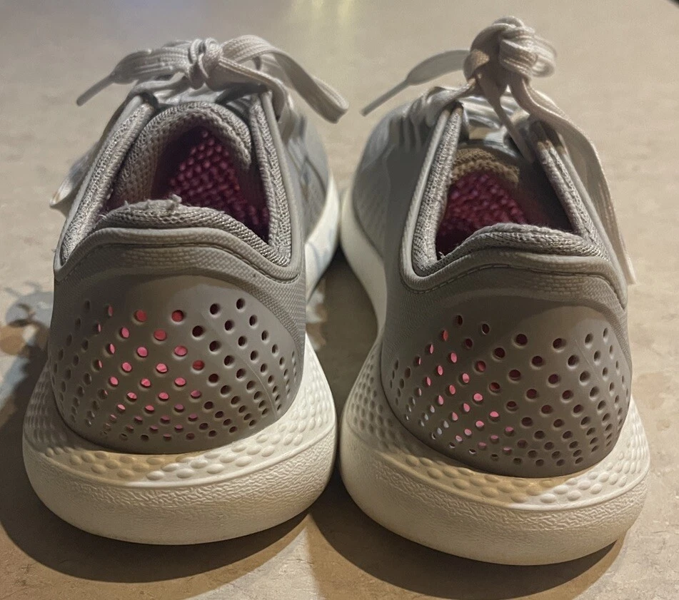 Elevate your casual style with these Crocs LiteRide Pacer sneakers in a beautiful gray mesh design. These lace-up shoes feature a round toe shape and a standard shoe width, making them comfortable to wear for walking or any casual activity. The rubber outsole material provides durability, while the breathable features ensure your feet stay cool and comfortable. These sneakers are perfect for women who appreciate a classic theme and are looking for a stylish and comfortable pair of shoes. The Crocs brand is known for its quality and these shoes are no exception. Get your hands on these Crocs LiteRide Pacer sneakers today and step out in style! These shoes are in good preowned condition with light signs of wear on the bottom of the shoe. Please see ALL photos for a better idea on condition, any measurements, or details to the shoes.