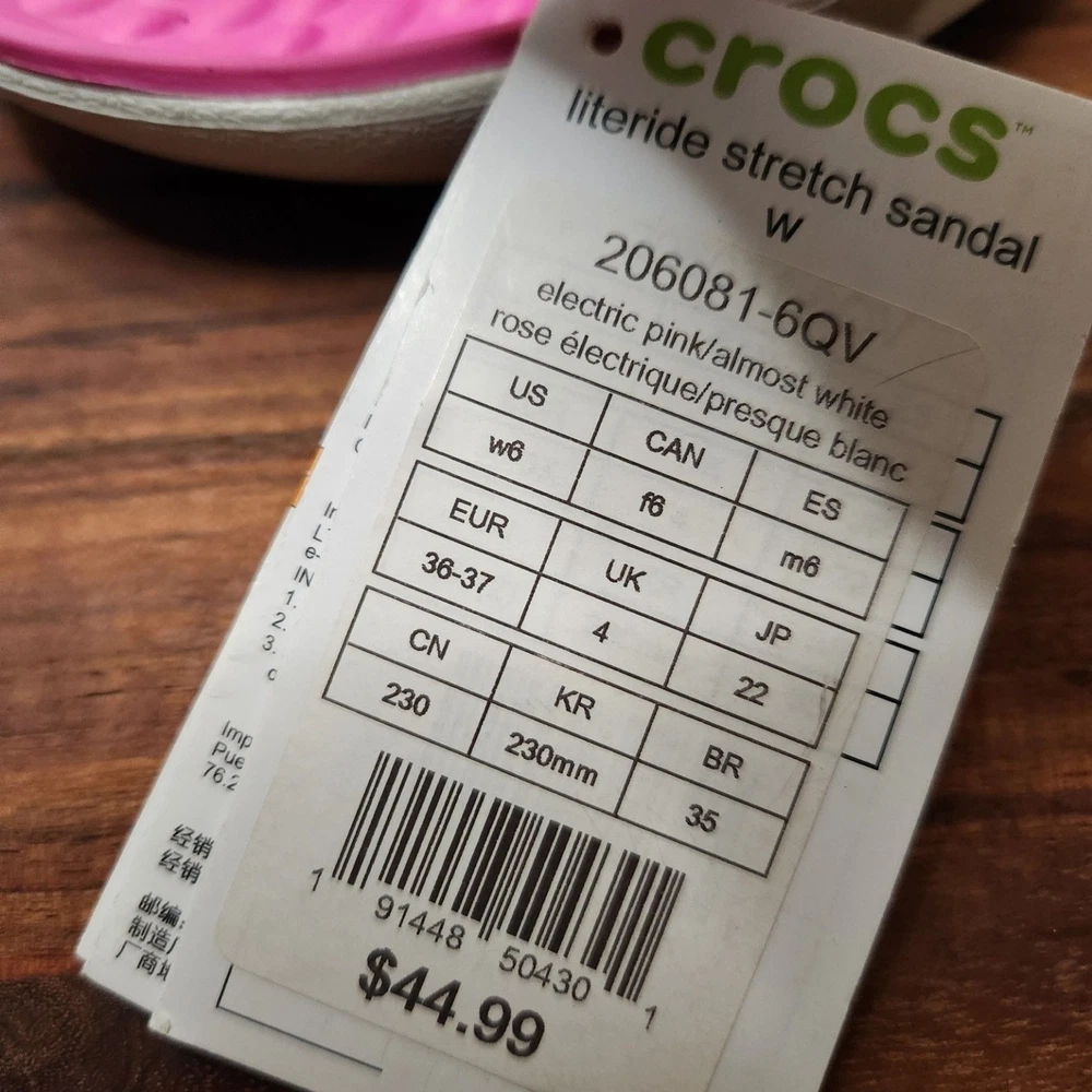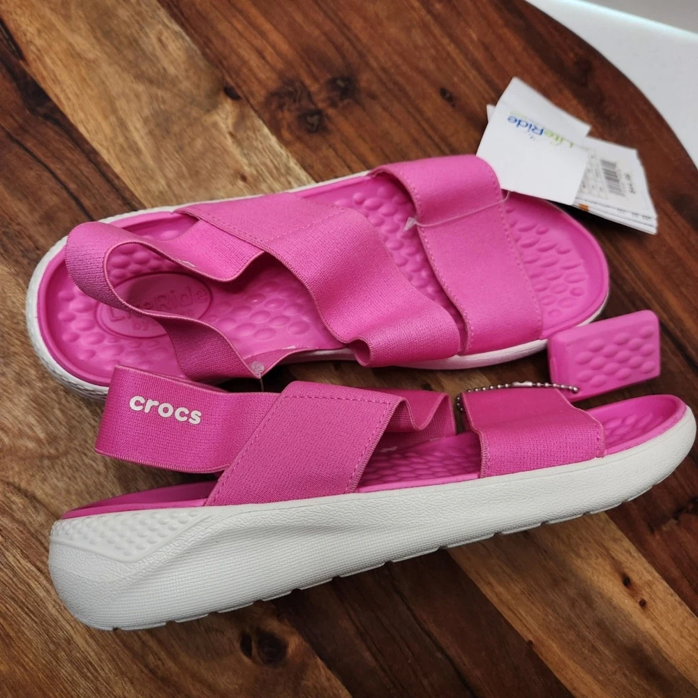 women's size 6 pink Crocs brand sandals straps are stretchy Please go by the photo and written description (not auto fill) for item details. Any questions, just ask!