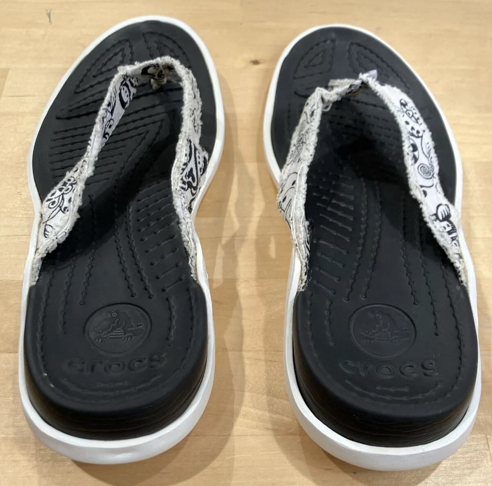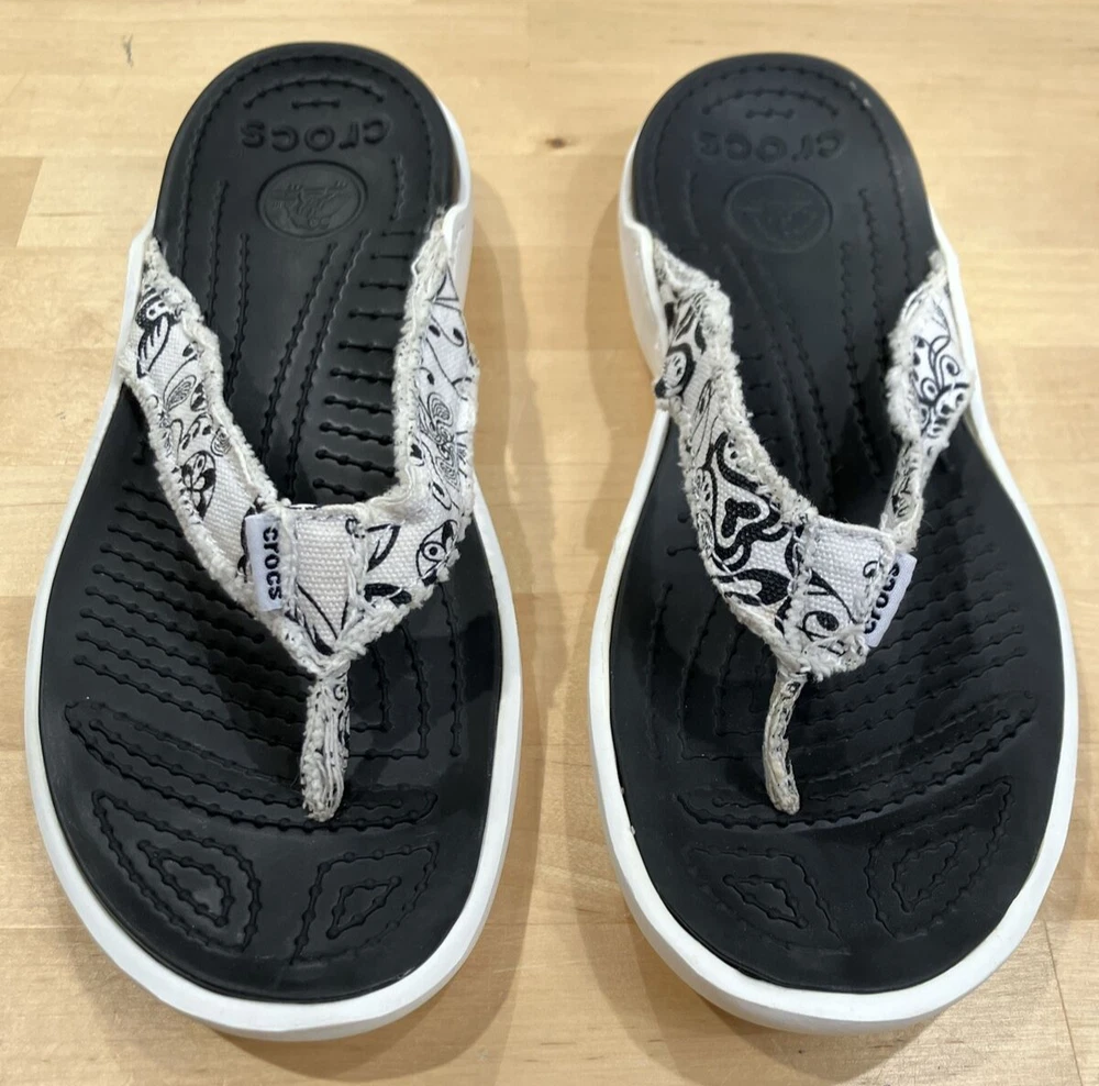 Crocs Mens Santa Cruz Surf Canvas Flip Flops Size 6 Paisley (Women's 8) Pre-owned. See photos for condition details. To upcycle, I reuse shipping material as often as possible. Buy more from my store and save on shipping.