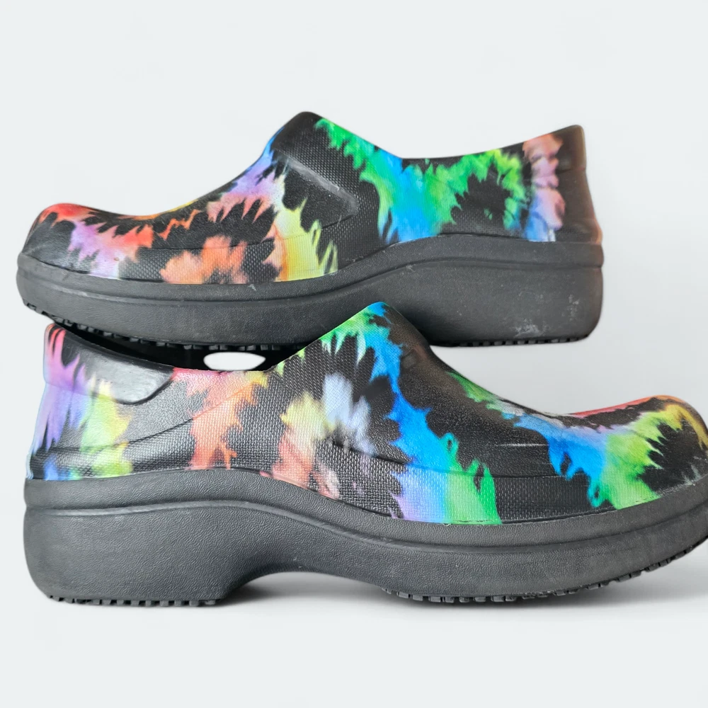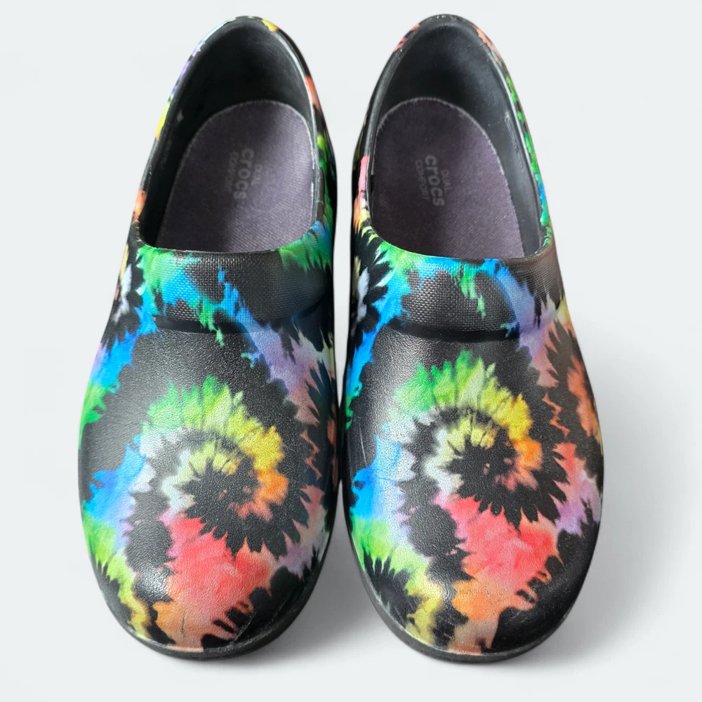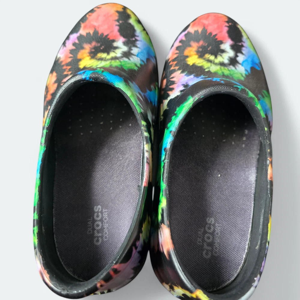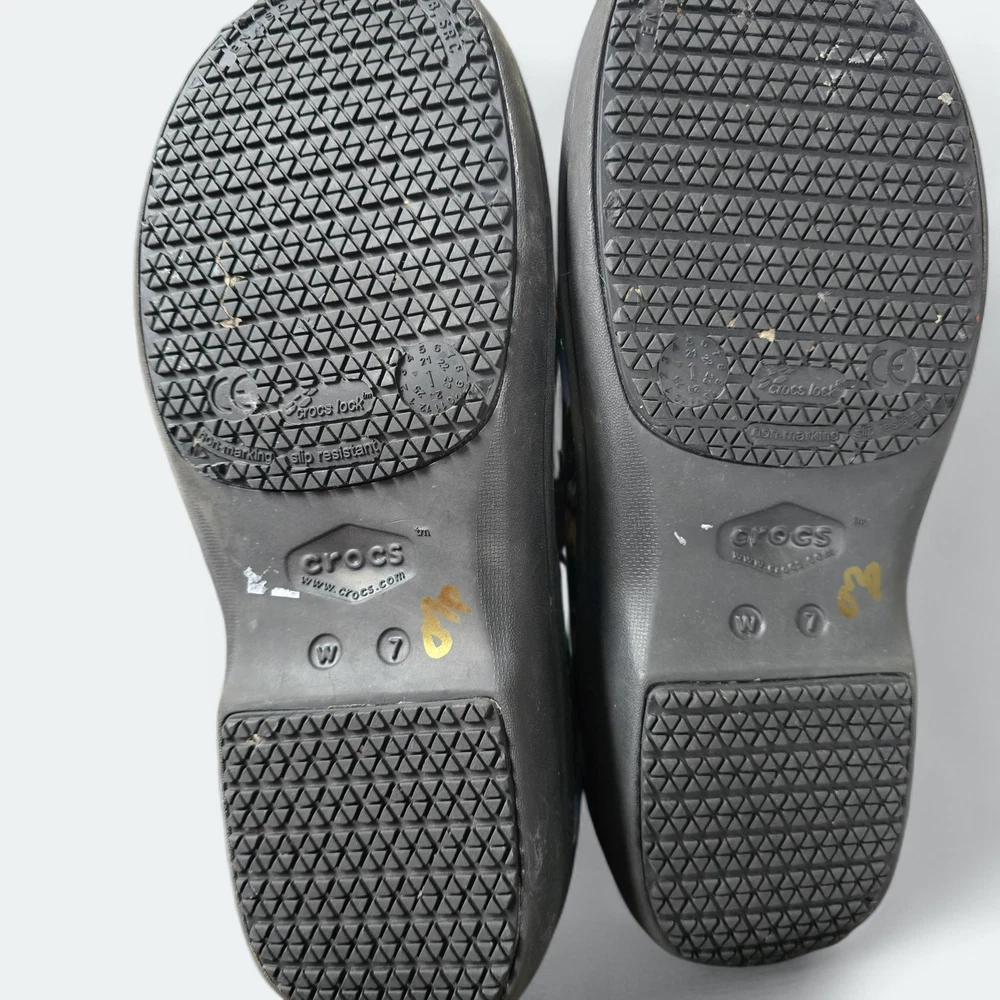 Pre-owned, size 7 women's shoes in good condition. Closed-toe and heel design meets workplace safety standards. Features Crocs Lock slip-resistant treads. Relaxed fit with added heel room for easy on/off. Enhanced arch support for superior comfort. Durable, fully molded construction, easily cleaned with soap and water. Offers Dual Crocs Comfort™ for supportive, soft, and cradling comfort. Ideal for workplace use. Minimal wear visible on the outsoles.