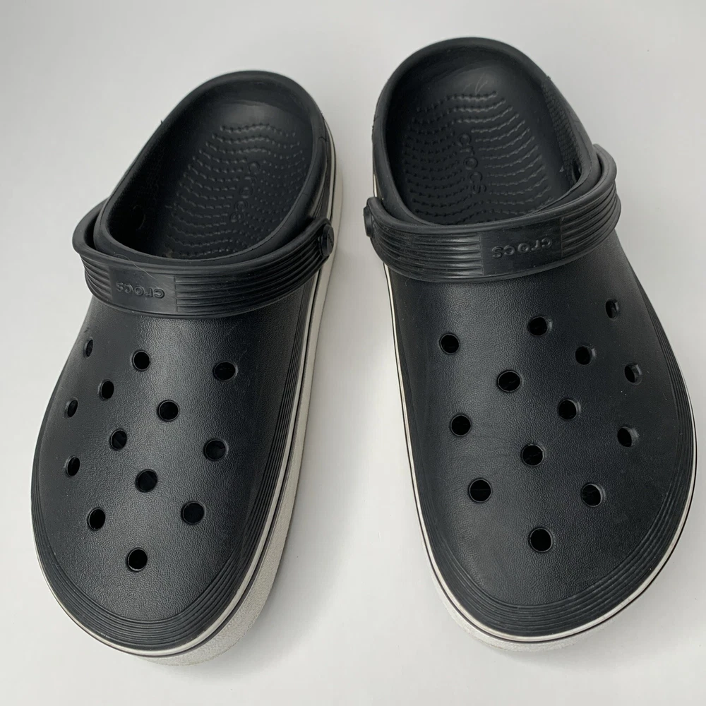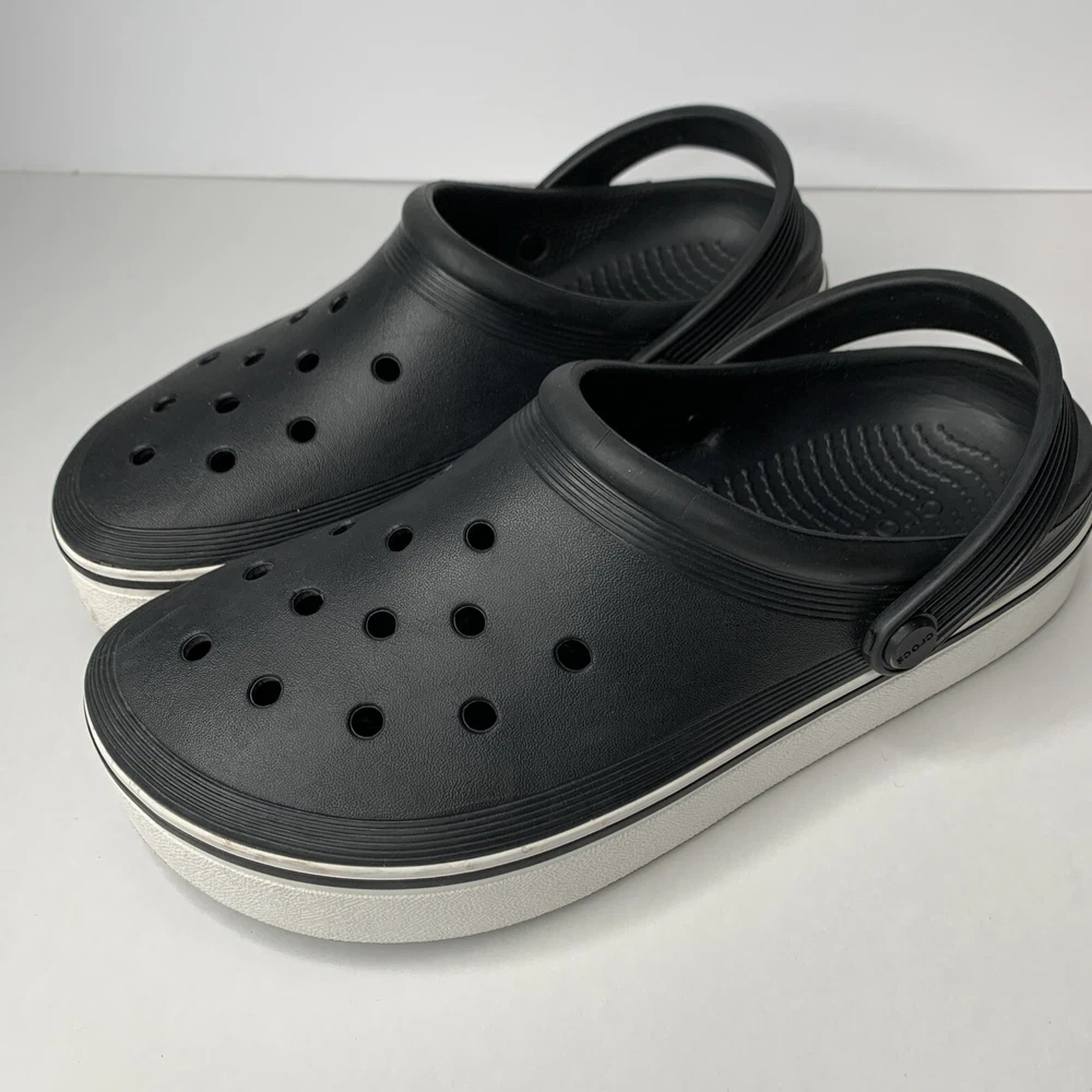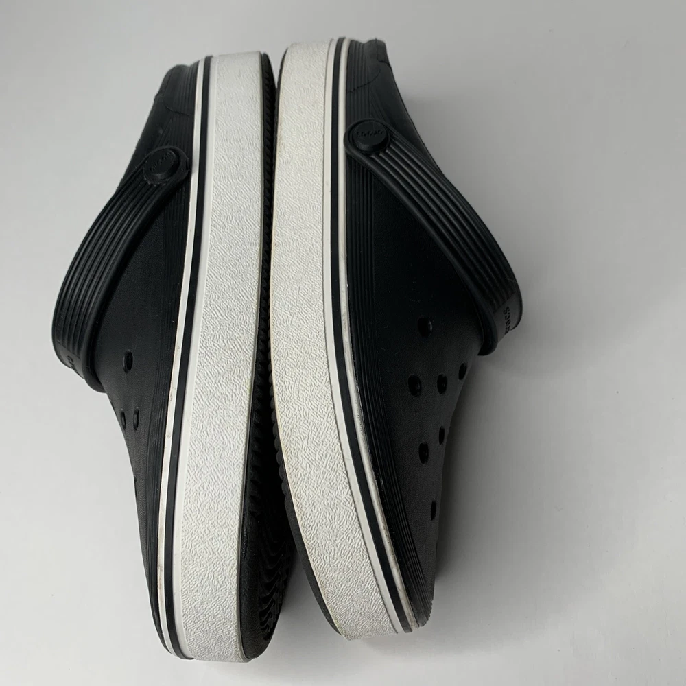 These are Crocs Off Court clogs in black, size 9 for women (size 7 for men). They are slip-on sandals with a low heel height, featuring a logo accent and ankle strap for comfort. The shoes are lightweight and suitable for travel, activewear, or casual occasions, with a rubber outsole and synthetic lining and upper material. Perfect for outdoor activities in all seasons.
