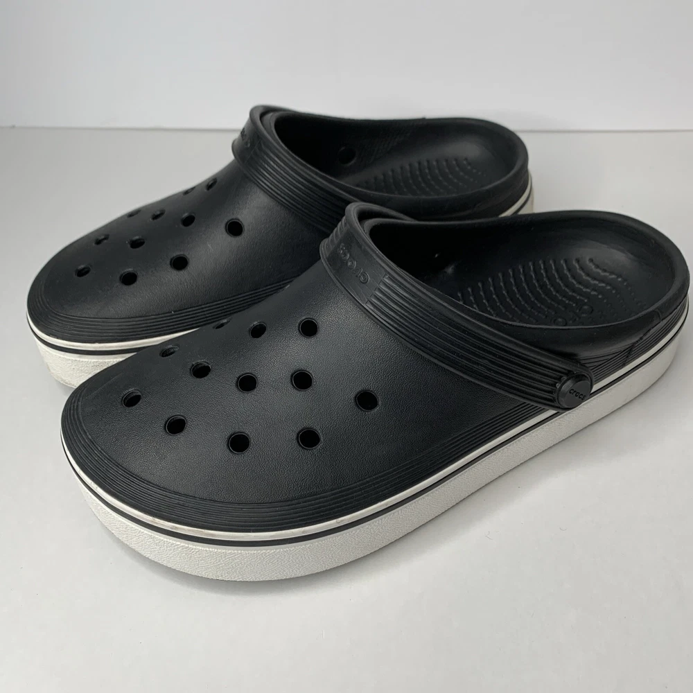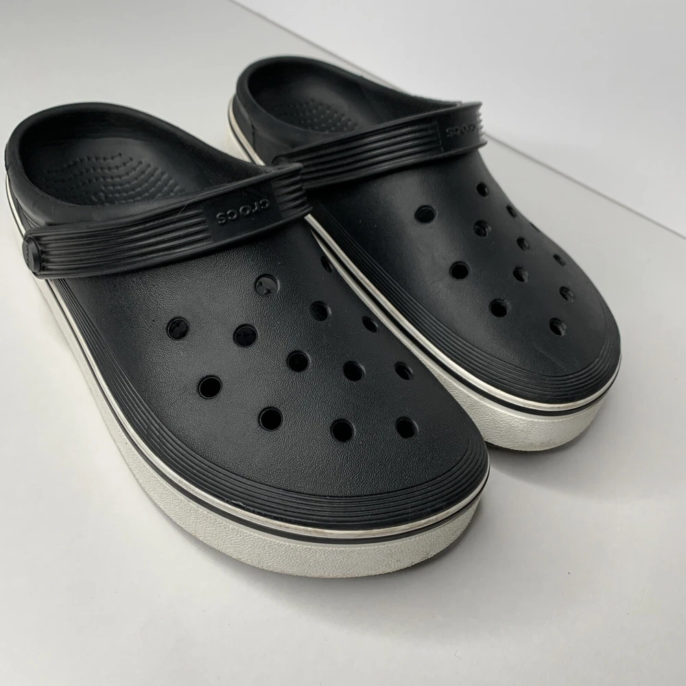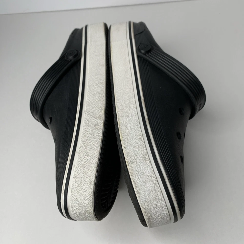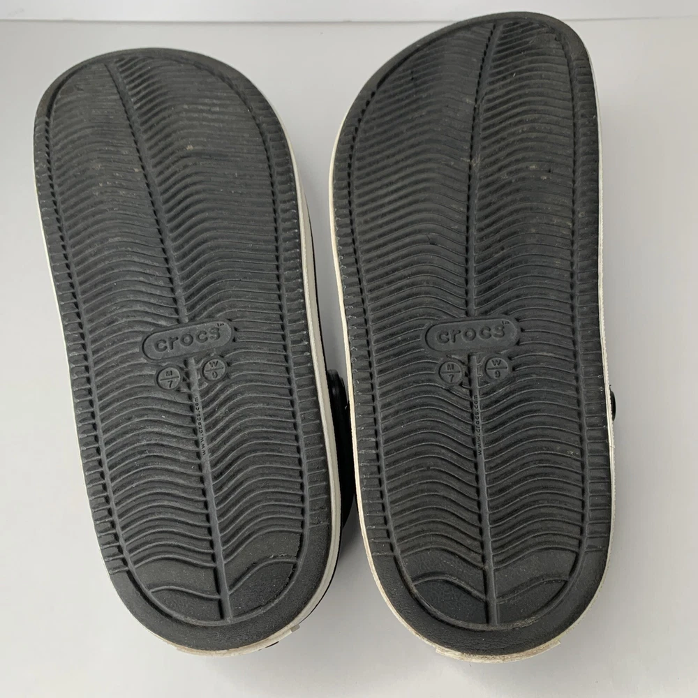 These are Crocs Off Court clogs in black, size 9 for women (size 7 for men). They are slip-on sandals with a low heel height, featuring a logo accent and ankle strap for comfort. The shoes are lightweight and suitable for travel, activewear, or casual occasions, with a rubber outsole and synthetic lining and upper material. Perfect for outdoor activities in all seasons.