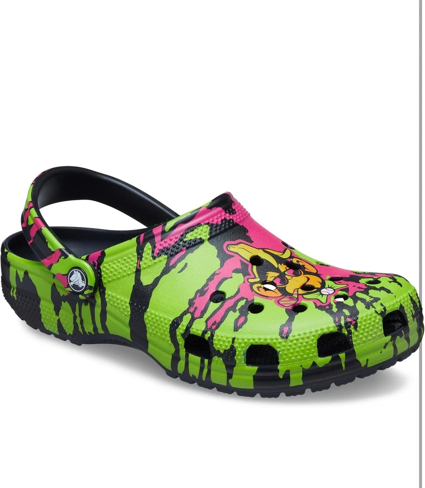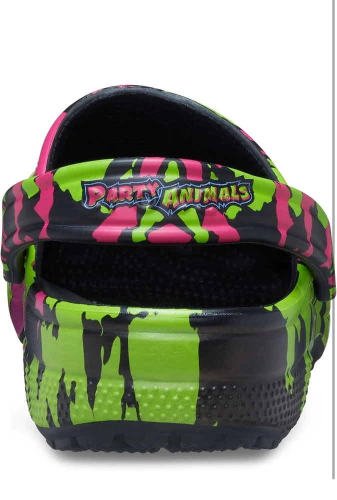 Elevate your footwear game with these Crocs Savanah Bananas Classic Clogs in Party Animals print. These unisex clogs are perfect for travel, casual wear, and workwear. The round toe and pull-on closure make them easy to wear, while the rubber outsole and lining ensure comfort and durability. These clogs have a flat heel of under 1 inch, making them perfect for summer, fall, and spring wear. The standard shoe width and rubber insole material add to the comfort factor. These Crocs are perfect for fans of the classic theme and the Party Animals print. **RETAIL $70**