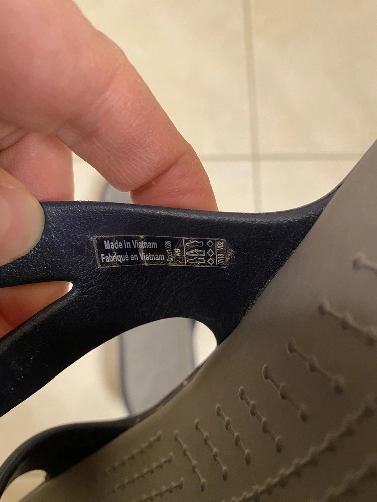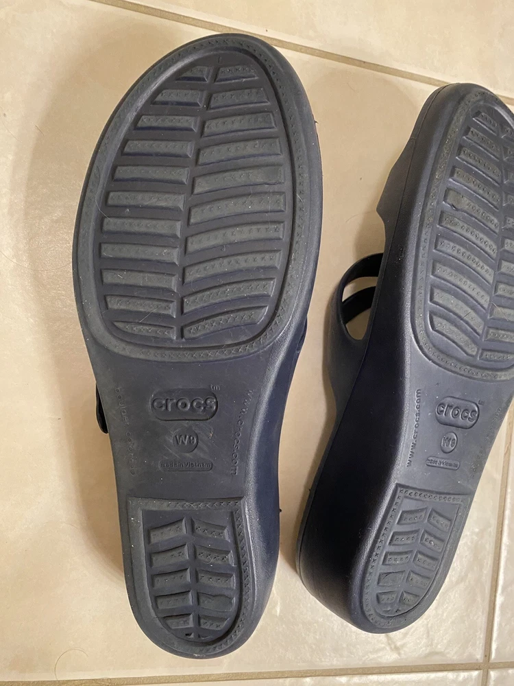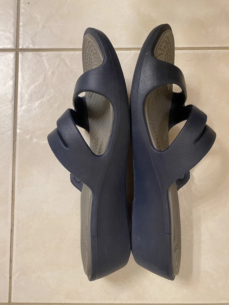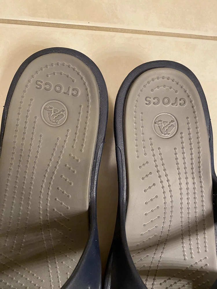 Comfortable sandals! Nice pre-owned condition. Logo button on the strap. Blue sandal with gray insole. This is a great sandal to slide into for so many occasions, from going on a cruise to just taking a quick trip to the grocery store!
