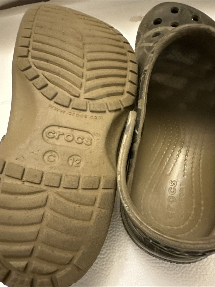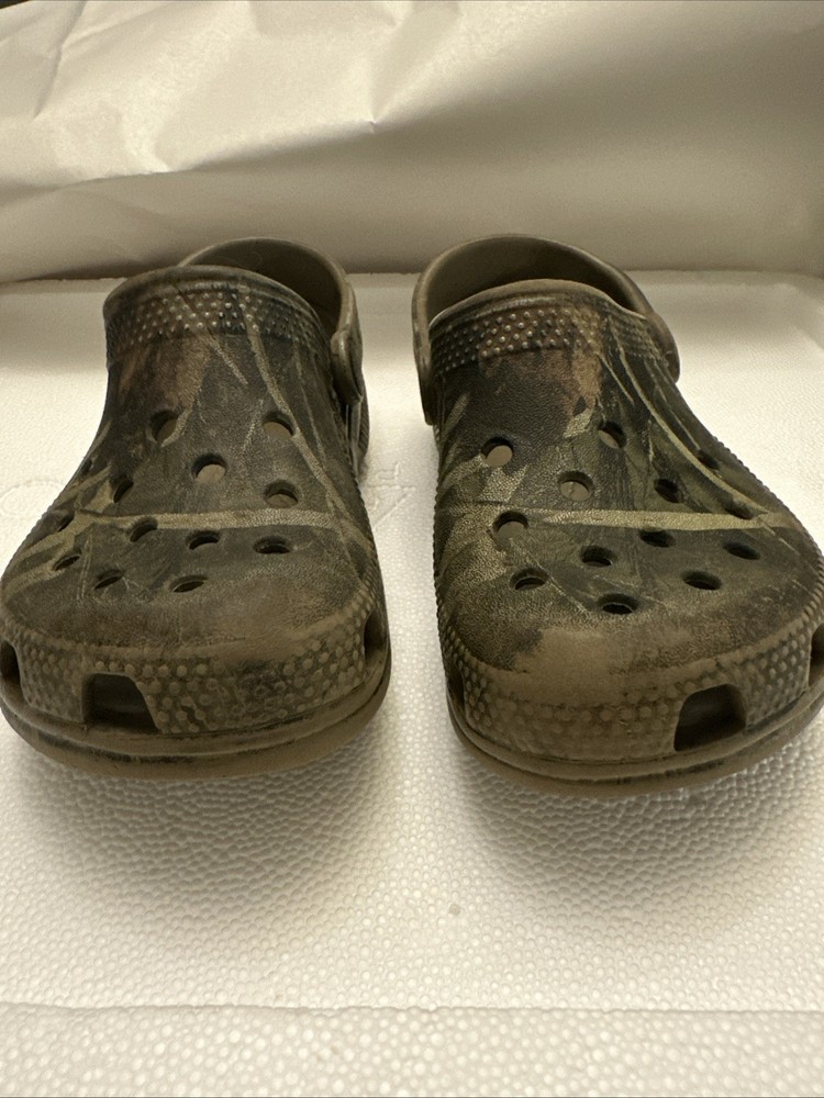 The Crocs Real Tree Advantage Max-4 HD Camo Clogs are stylish slip-on shoes designed for kids in size C 12. Featuring a low-top design with a closed toe and ankle strap, these clogs offer comfort and breathability with a rubber outsole and upper material. The colorful camo pattern and brand accents make them perfect for outdoor themes in any season, whether it's winter, summer, fall, or spring. Ideal for both boys and girls, these Crocs are a versatile and fun addition to any child's shoe collection.