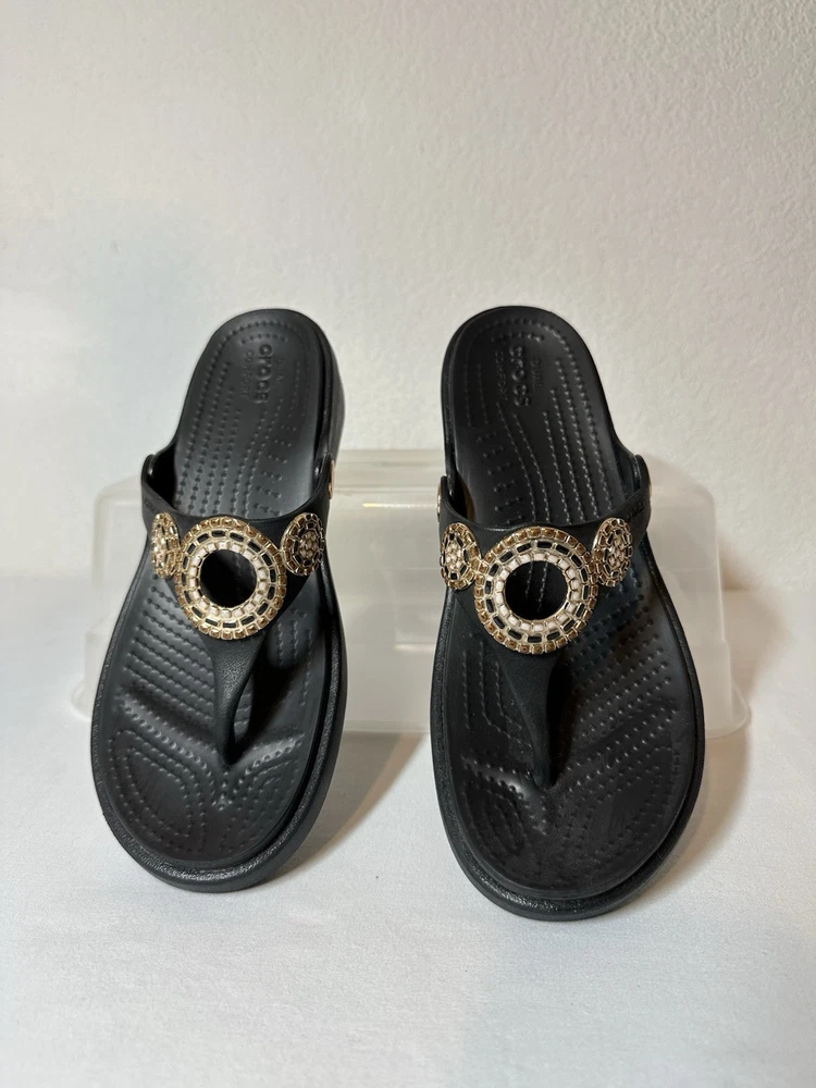 Crocs Sanrah Diamante Embellished Wedge Flip Flop Womens Sz 8 Black Gold Excellent Condition See Pictures
