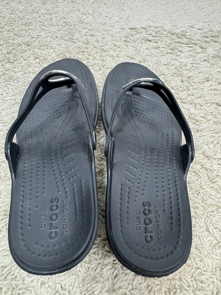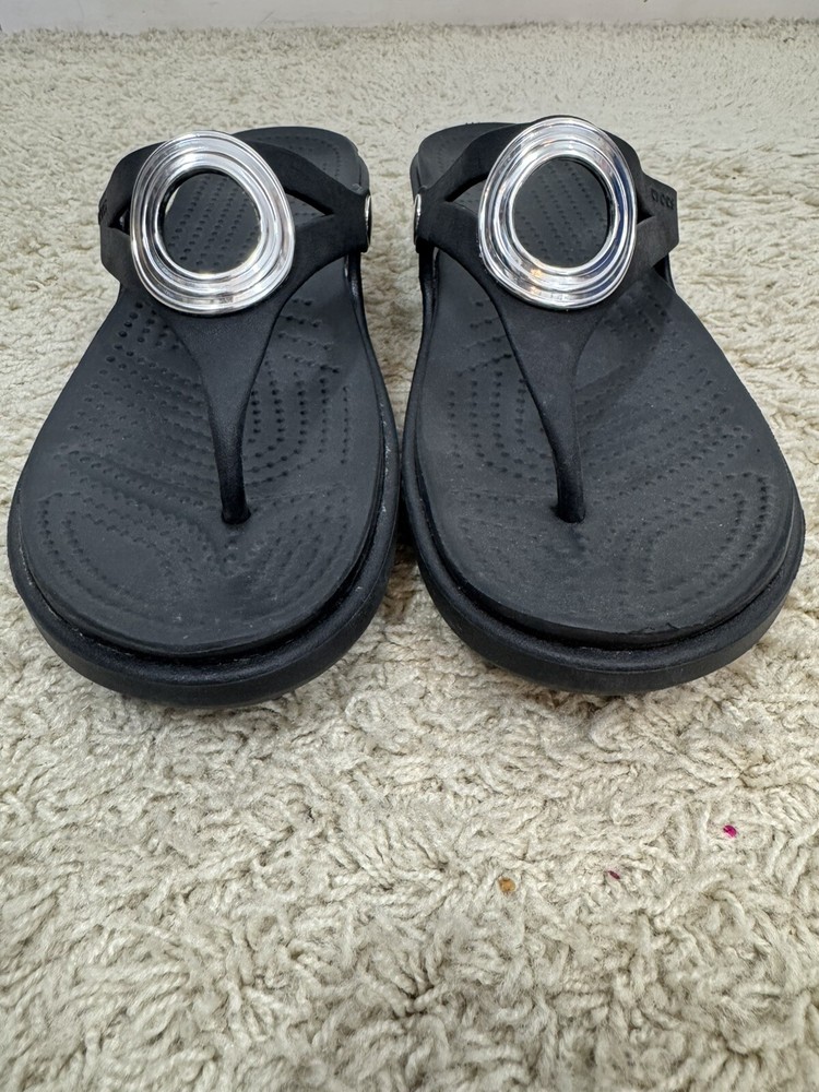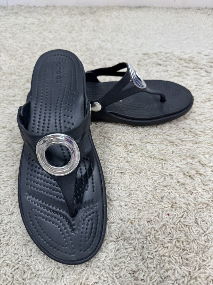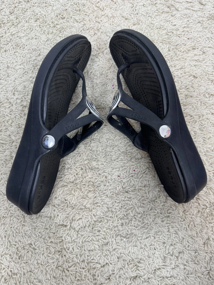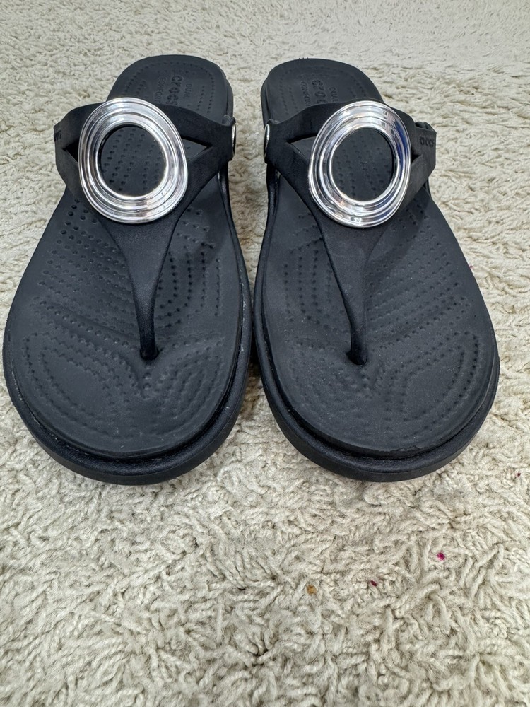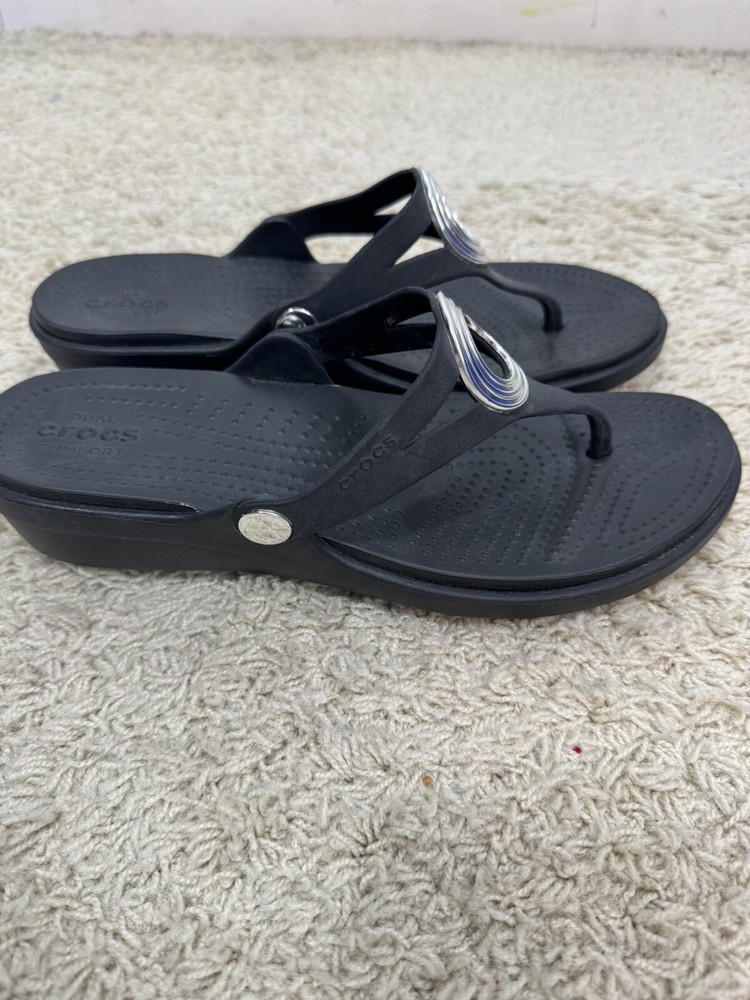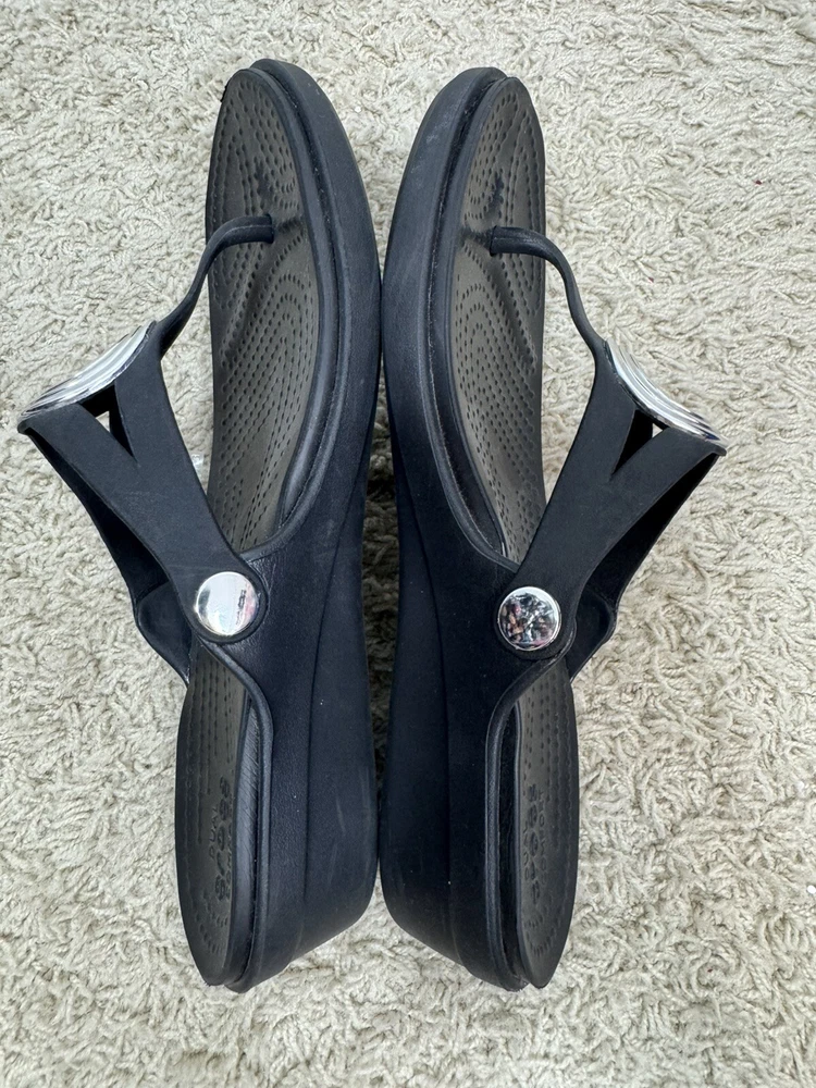 Crocs Sanrah Wedge Sandals Silver Circle Black Thong Women’s Size 9
