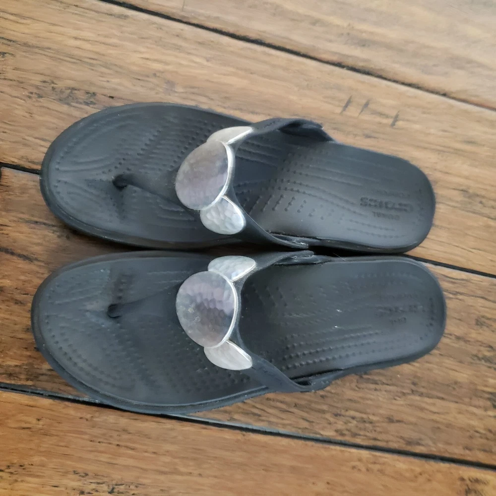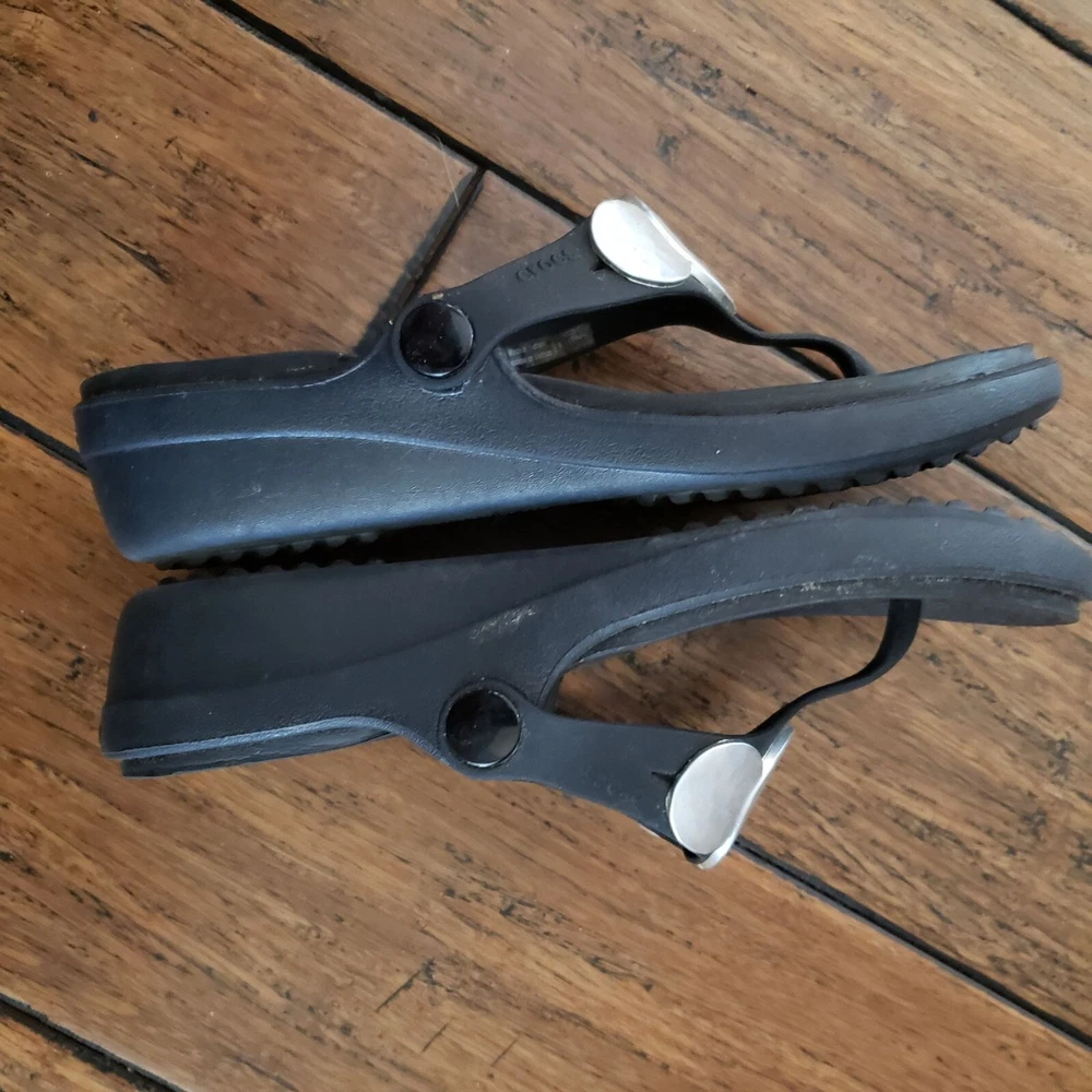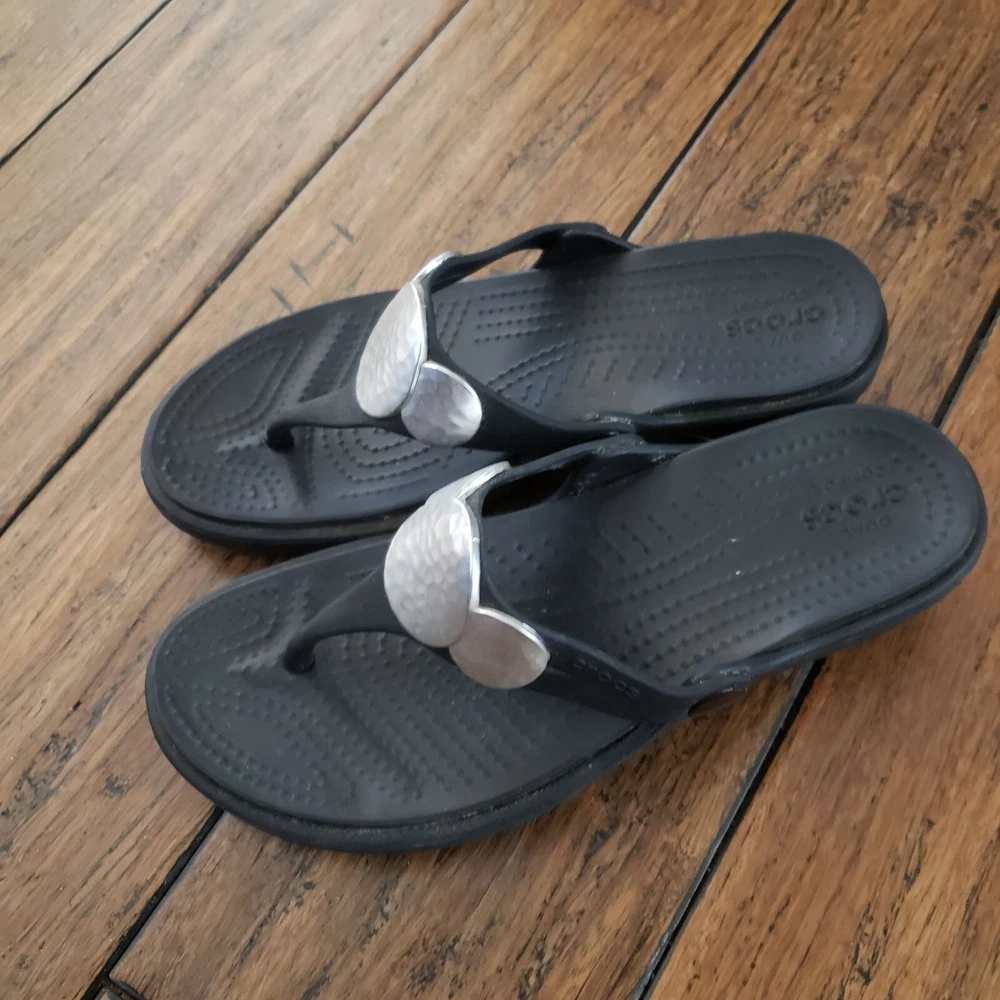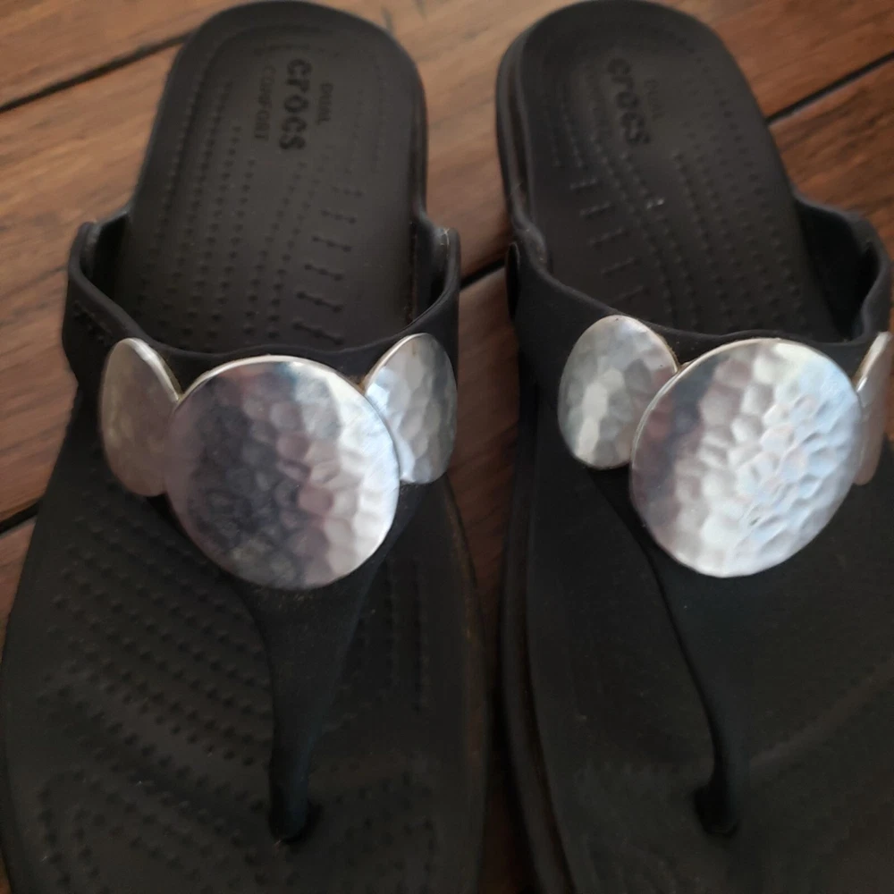 Item: CROCS Sanrah Condition is: Good PRe-Owned Size: 6 Color: Black with "Silver" Medallions Fabric: Synthetic Features: Slip-On, Lightweight Flaws: Limited Wear Closure: Slip-On Care: Wipe Clean Please see all photos for details. Colors may not appear quite the same in photos due to lighting. I try to give the most accurate description possible. I typically ship within 24 hours on Business Days, but much sooner, when possible. B: 14