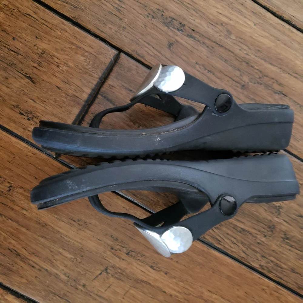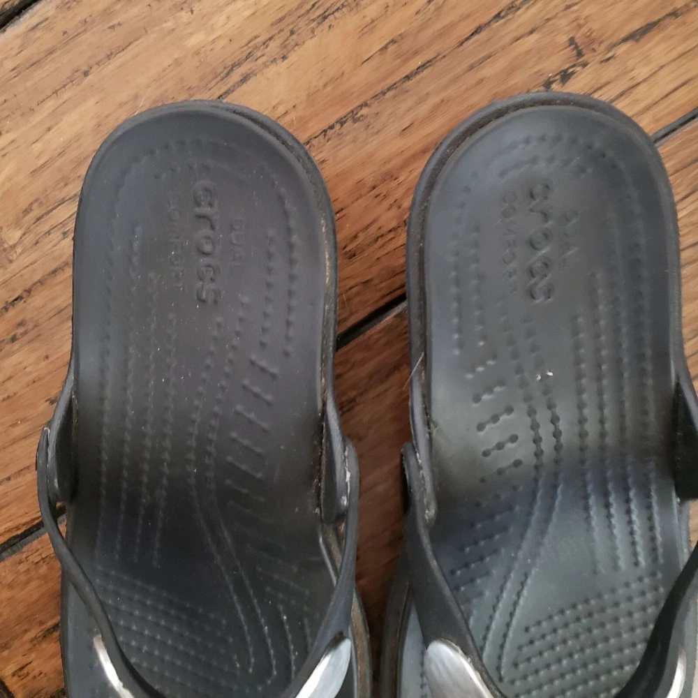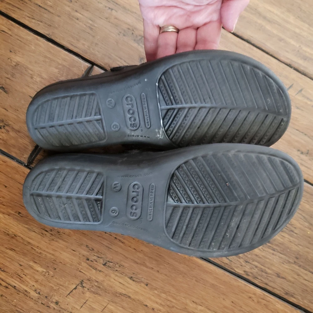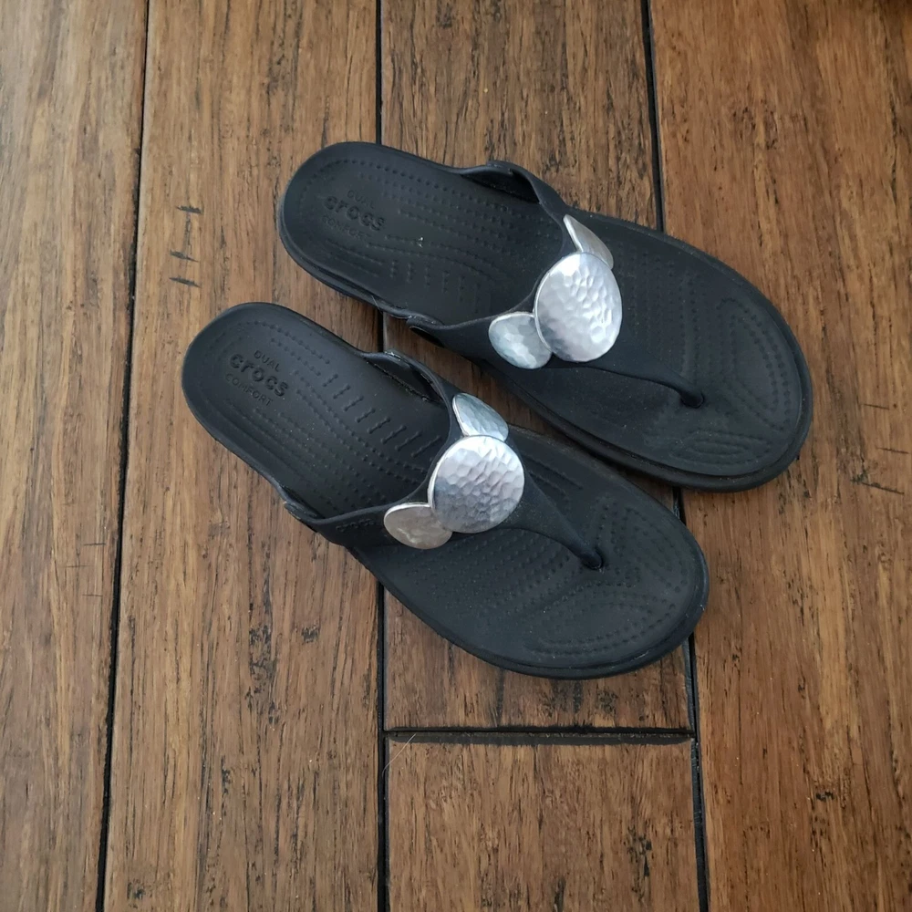 Item: CROCS Sanrah Condition is: Good PRe-Owned Size: 6 Color: Black with "Silver" Medallions Fabric: Synthetic Features: Slip-On, Lightweight Flaws: Limited Wear Closure: Slip-On Care: Wipe Clean Please see all photos for details. Colors may not appear quite the same in photos due to lighting. I try to give the most accurate description possible. I typically ship within 24 hours on Business Days, but much sooner, when possible. B: 14
